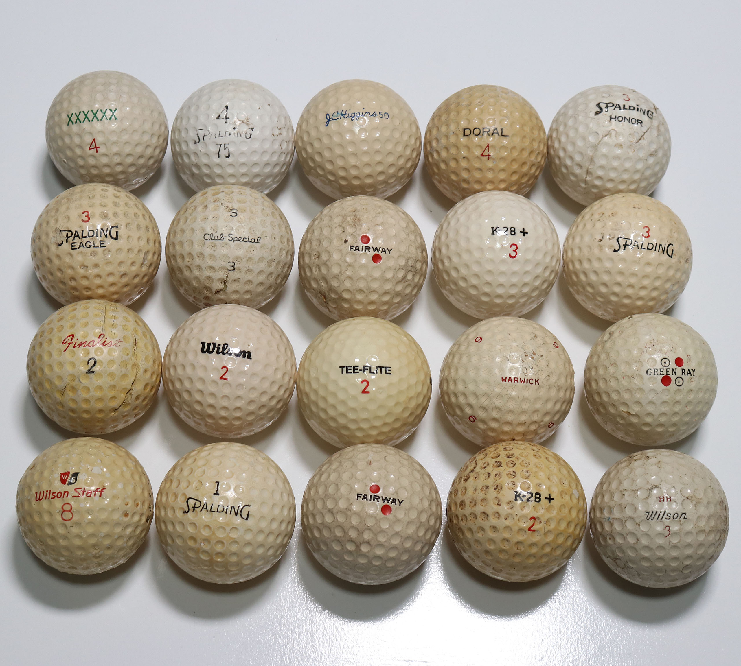 The collection of 20 balls that consists of, Wilson Staff, Finalist, Spalding Eagle, XXXXXX, Spalding 75, Clube Special, Wilson, Spalding, JC Higgins 50, Fairway, Tee-Flite, Fairway, Doral, K-28, Warwick, K-28, Spalding Honor, Spalding, Green Bay, Wilson HH.