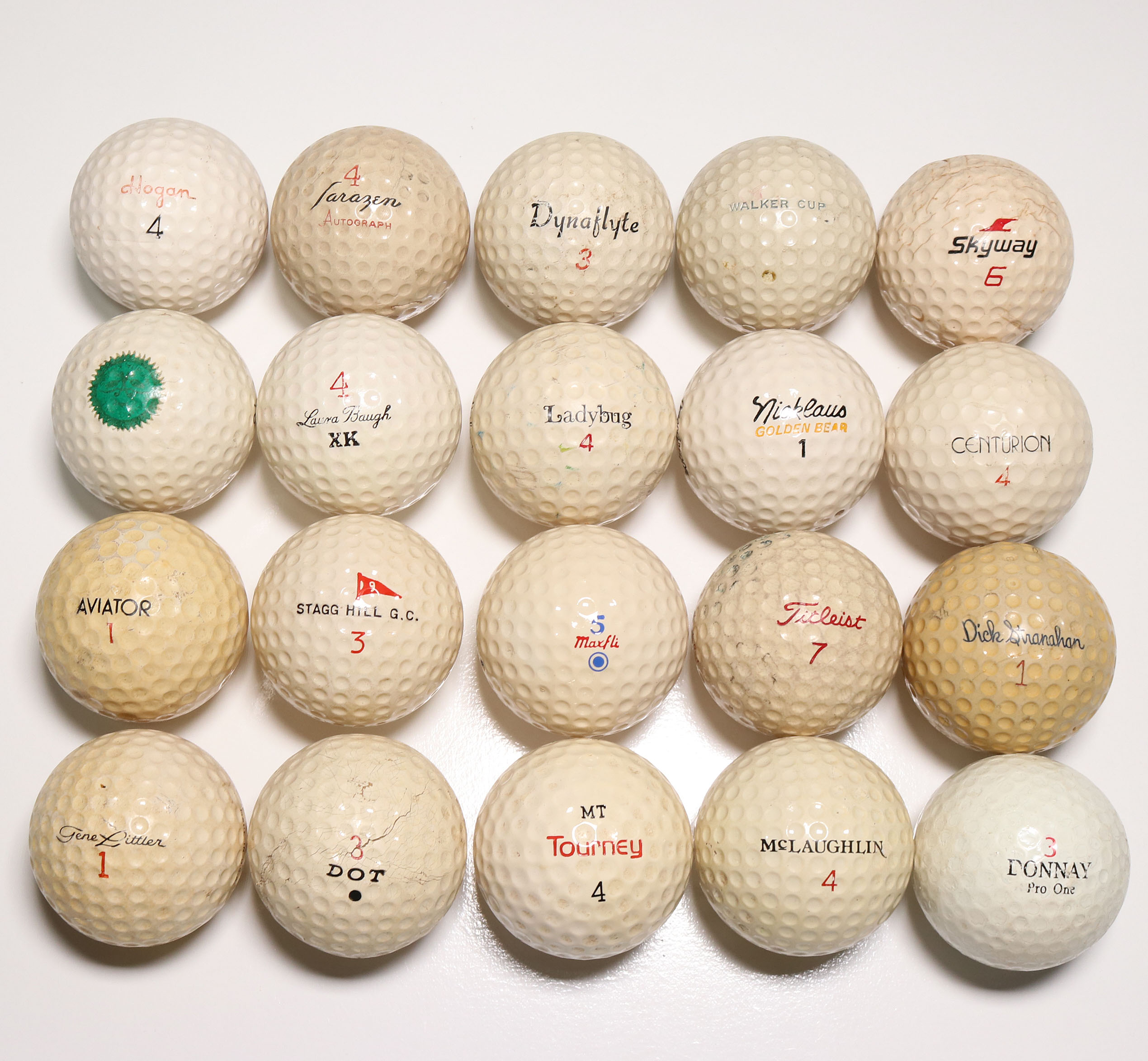 The collection of 20 balls that consists of, Hogan, Aviator, Gene Littler, DOT, Stagg Hill Golf Course, Laura Baugh XK, Sarazen Autograph, Dynaflyte, Ladybug, Maxfli, Tourney MT, McLaughlin, Titleist, Donnay Pro One, Dick Siranahan, Nicklaus Golden Bear, Centurion, Skyway, Walker Cup.
