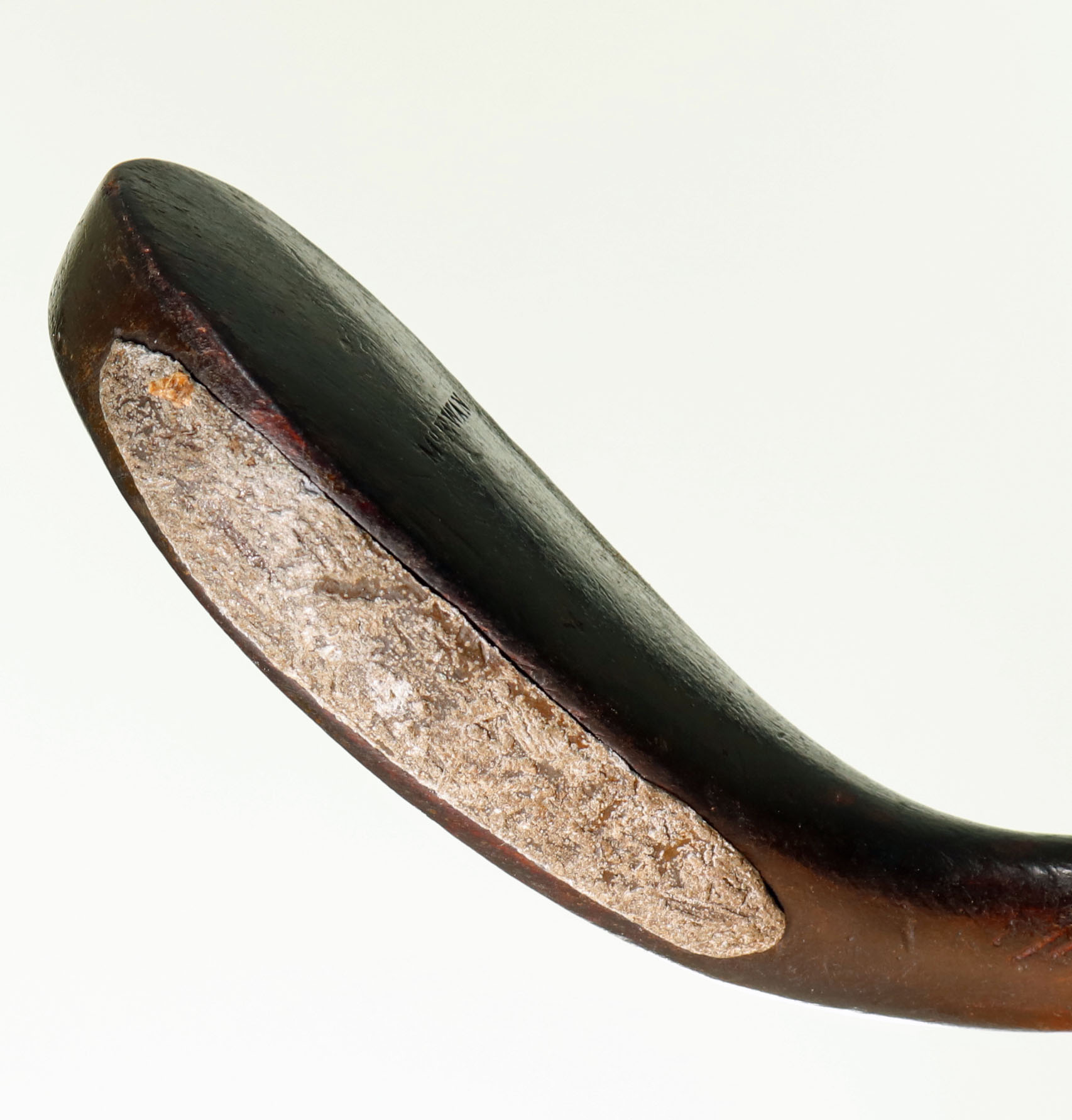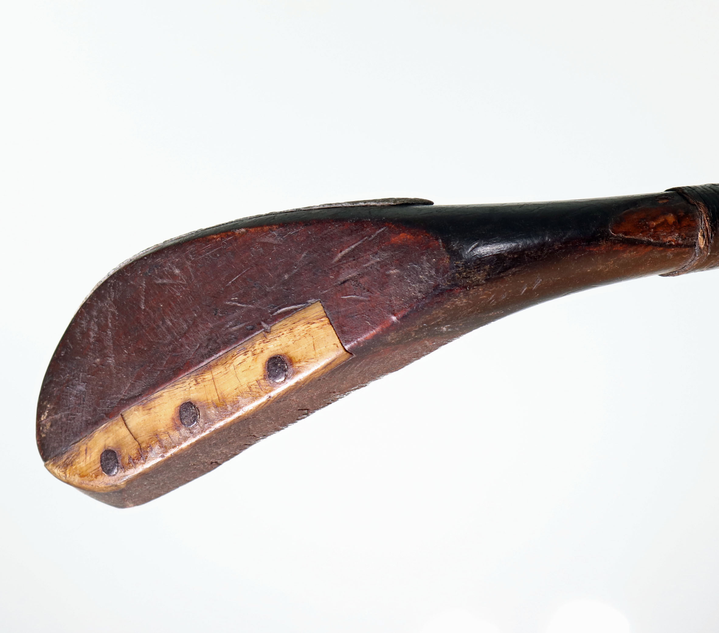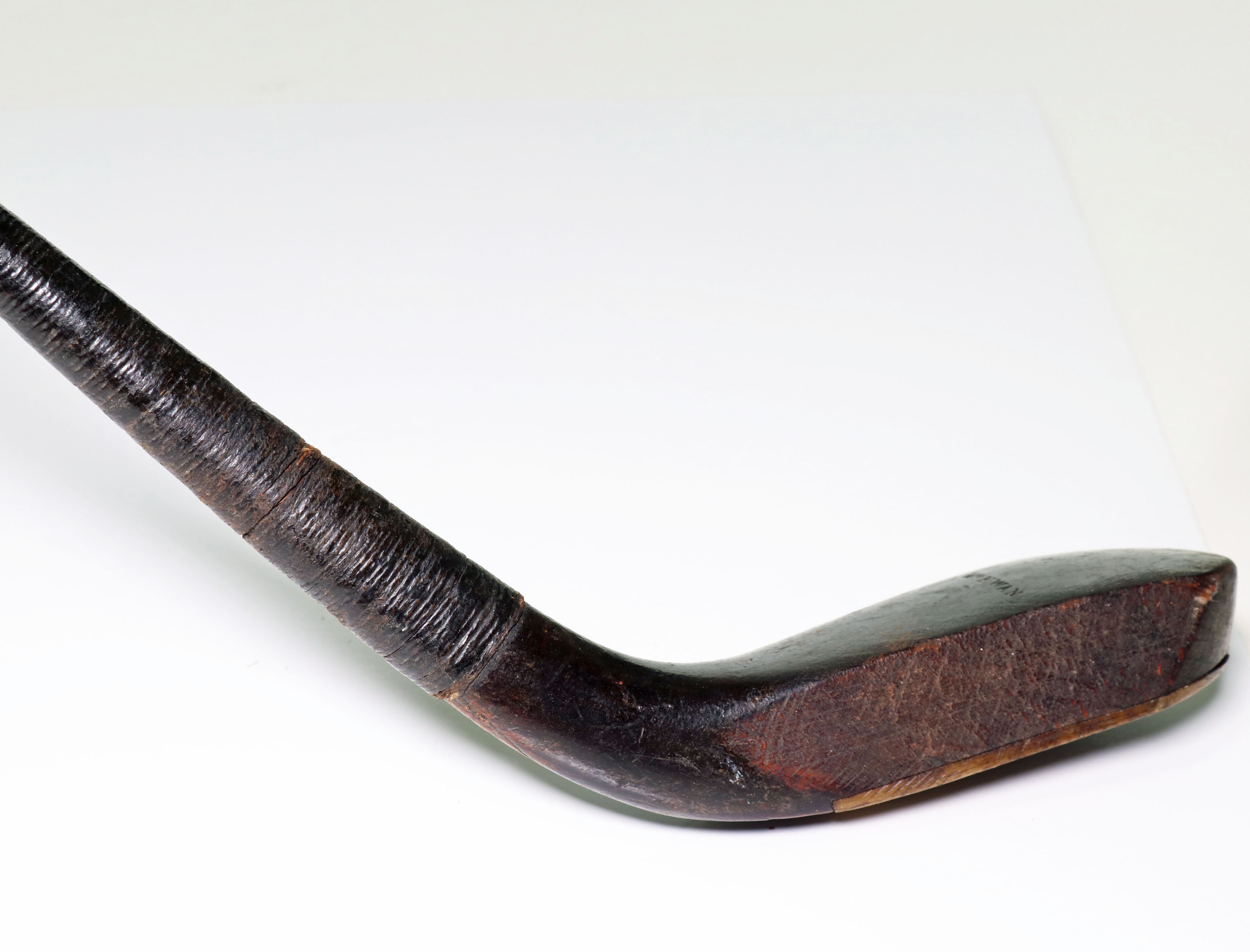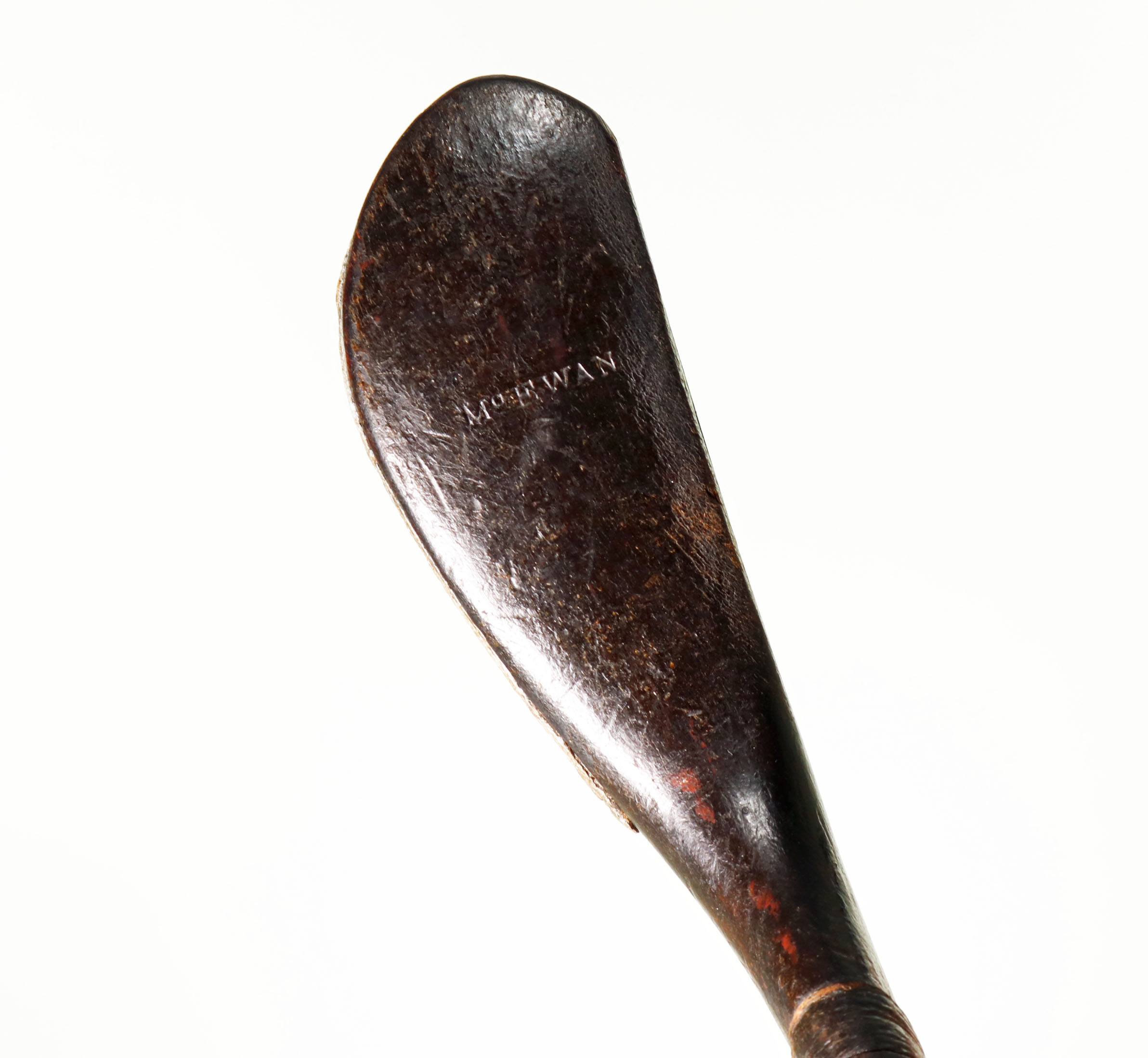 Antique Long Nose Golf Club, McEwan Of Musselburgh. Head made from fruit wood with lead weight to the rear and the traditional horn slip along the leading edge of the sole. Head is stamped ‘McEwan’, the shaft of hickory with a leather grip. Total length 45”. This is a very nice example of a McEwan long nose golf club from the 1870s in wonderful condition and from one of the great club makers. The name McEwan identifies more than a long nose club, it belongs to the most famous family of early club makers. Established in 1770 by James McEwan, the McEwan club making business was passed down from father to son for well over a century. McEwan clubs were always well-known for their fine quality.