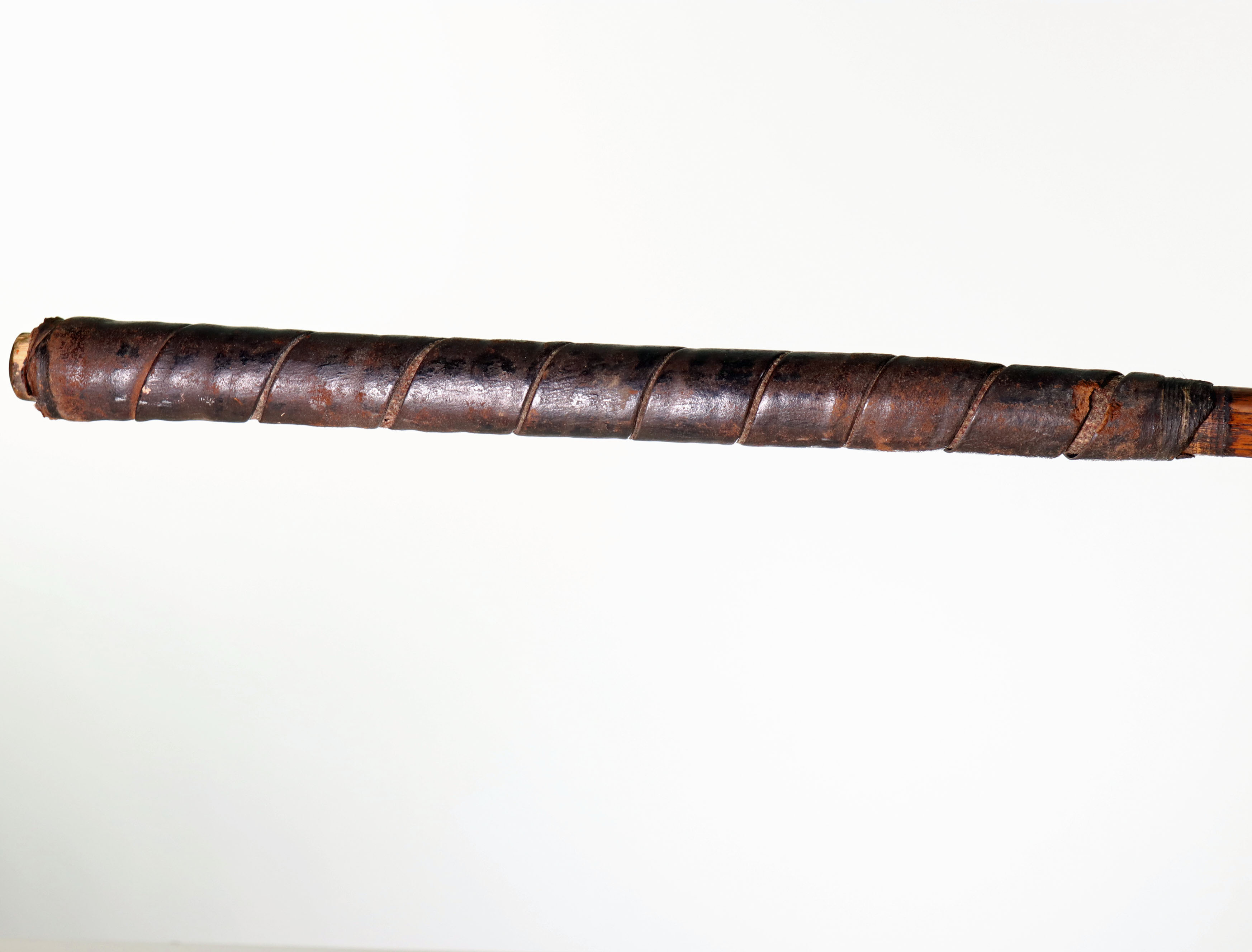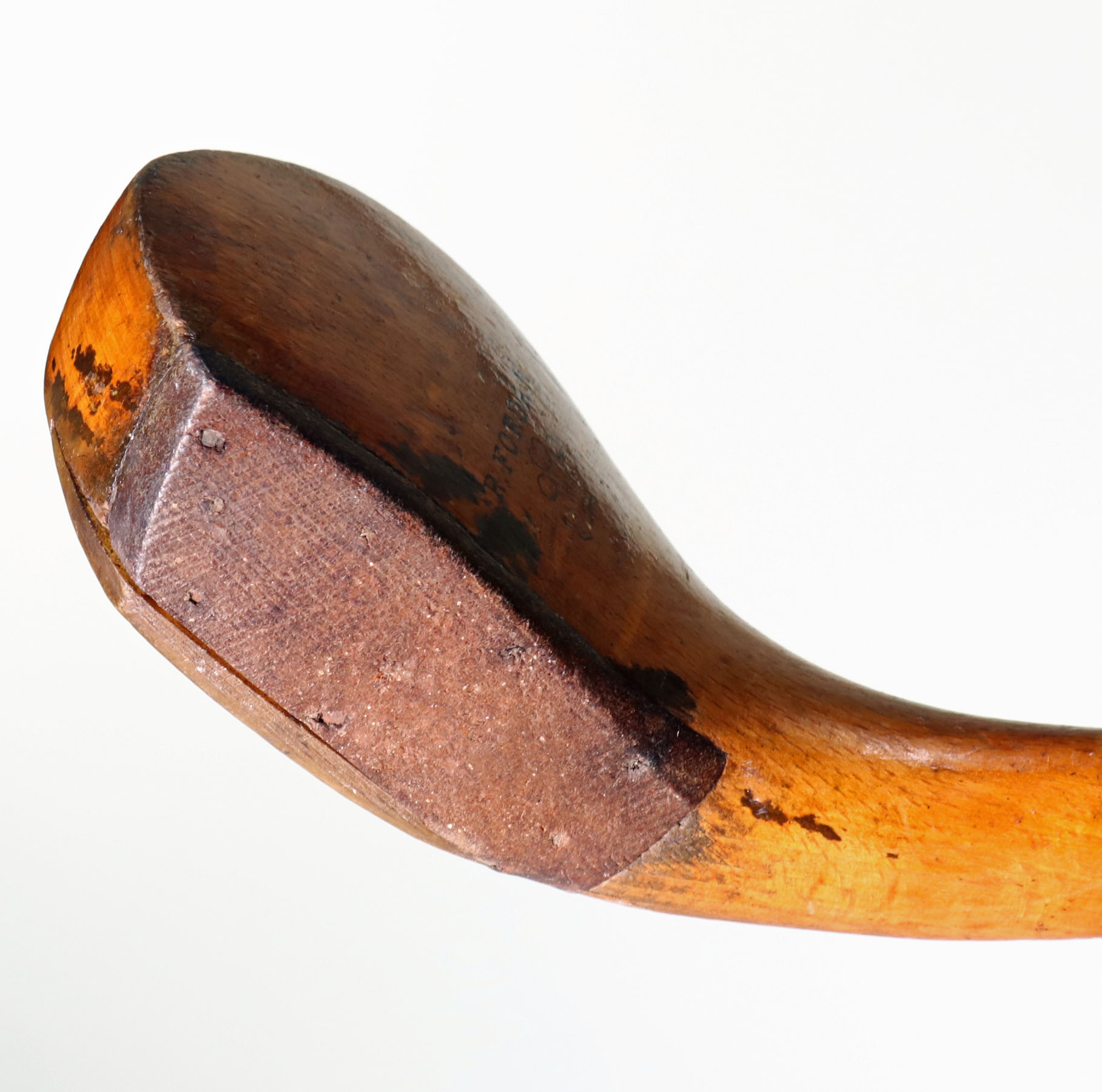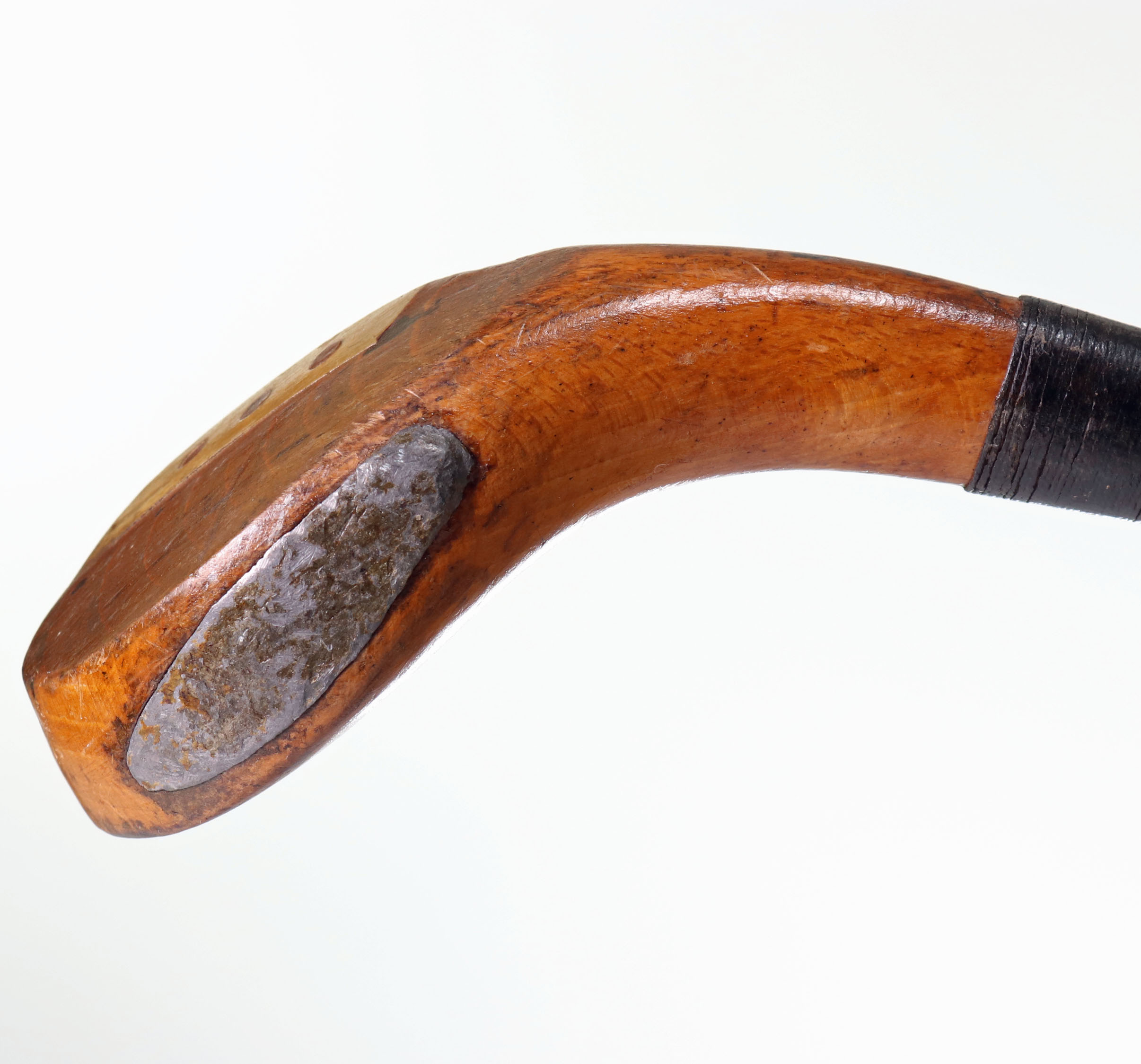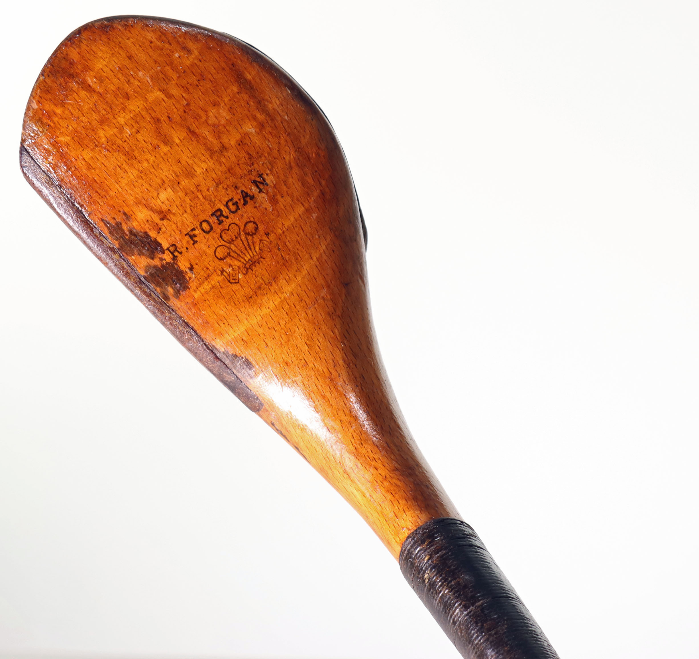 This is a wood head long nose club by Robert Forgan of St Andrews. This impressive club features a lead weight to the rear and the traditional horn slip along the leading edge of the sole, the fruitwood head is stamped ‘R. Forgan’ above the Prince of Wales plume of three feathers. The original hickory shaft with a period sheep skin leather grip. Robert Forgan became clubmaker to HRH Prince of Wales in 1863 and used the prince’s plume of three feathers as his mark until 1901, when upon the Prince became King Edward his mark changed to the ‘King’s Crown’.