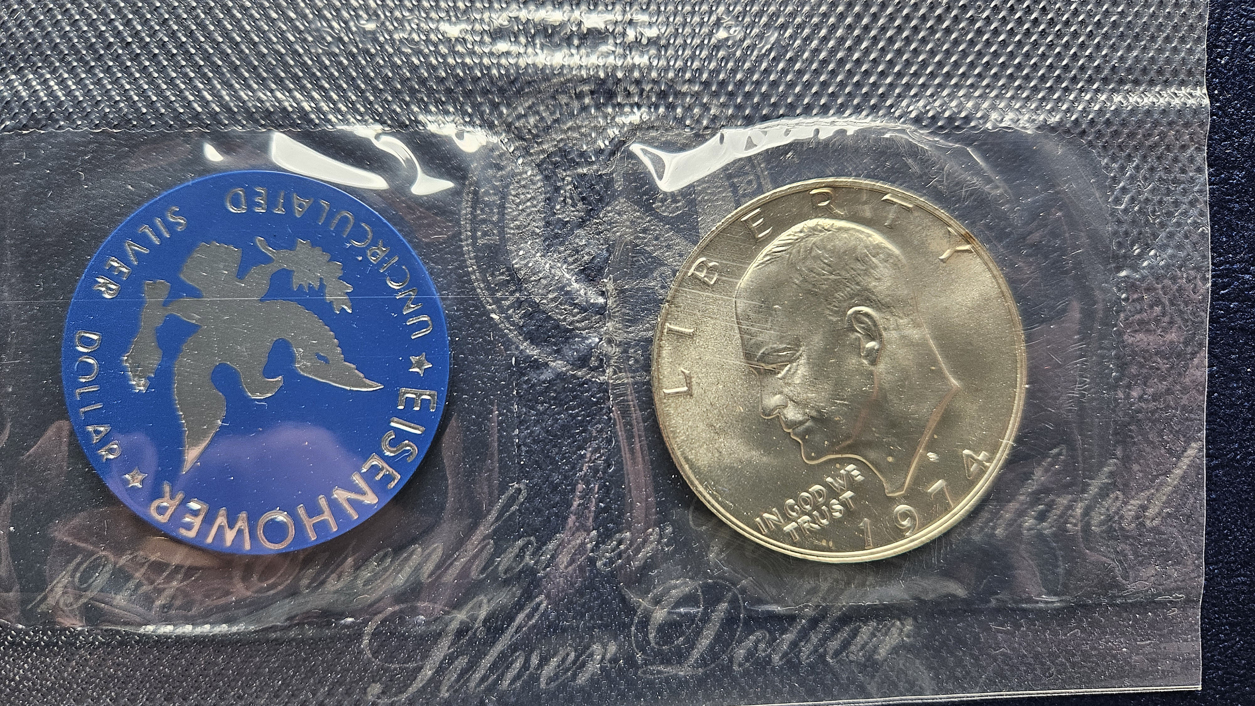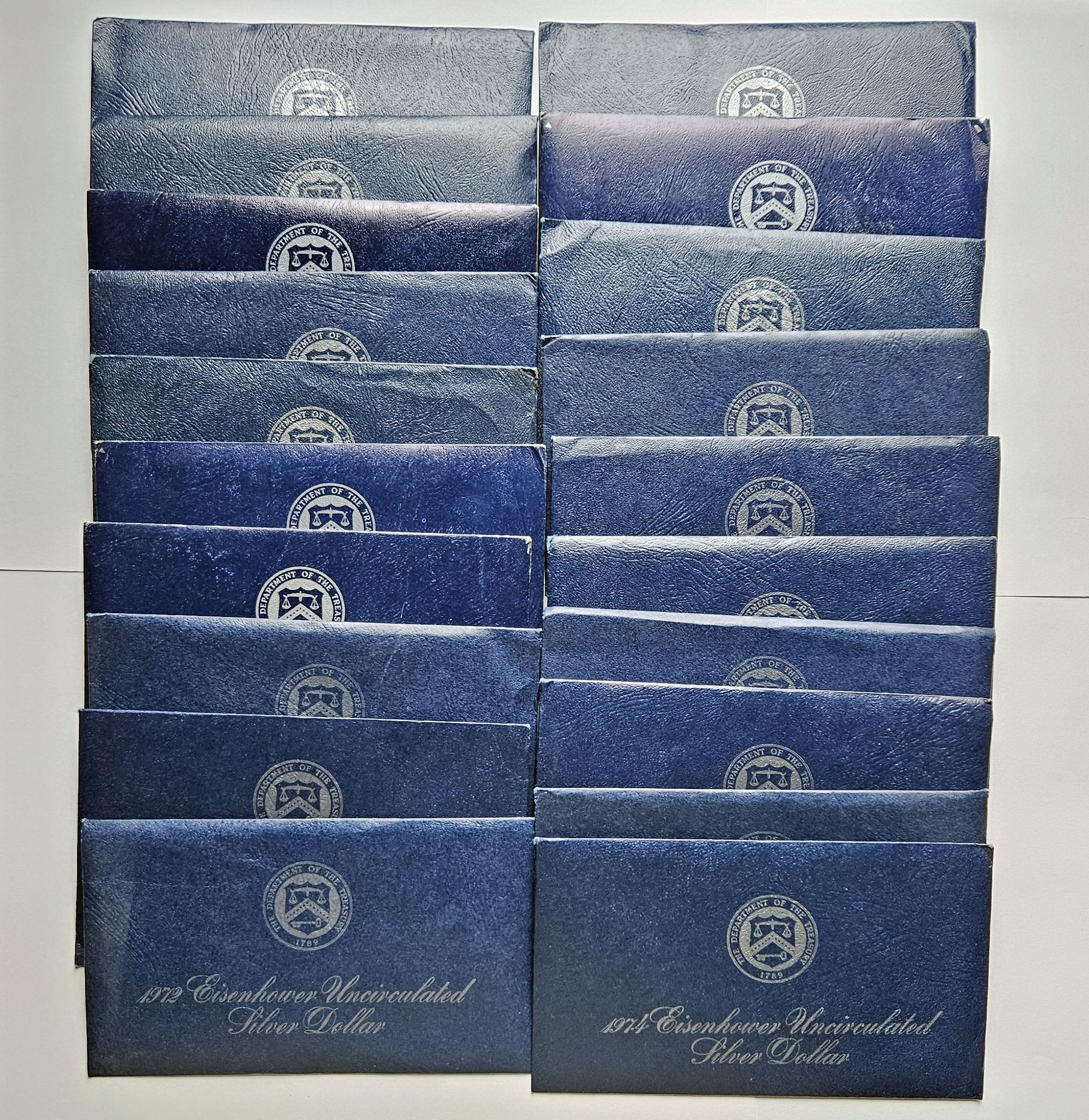 This is a grouping of twenty complete United States Mint Eisenhower uncirculated sets with the 40% silver coin. There are five from 1971 S mint mark, five from 1972 S mint mark, five from 1973 S mint mark, and five from 1974 with S mint mark. Please review the detailed photos for overall condition.
