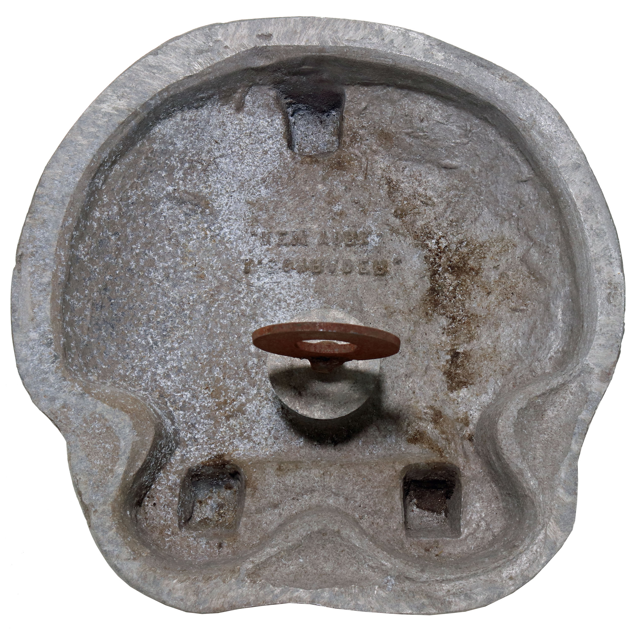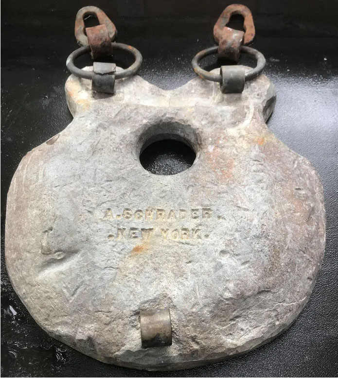 This is a vintage A. Schrader’s New York horseshoe weight mold. This mold is cast aluminum and produces an accurately sized lead weight. The example lead weight shown was made from this mold, but is not included in this lot.