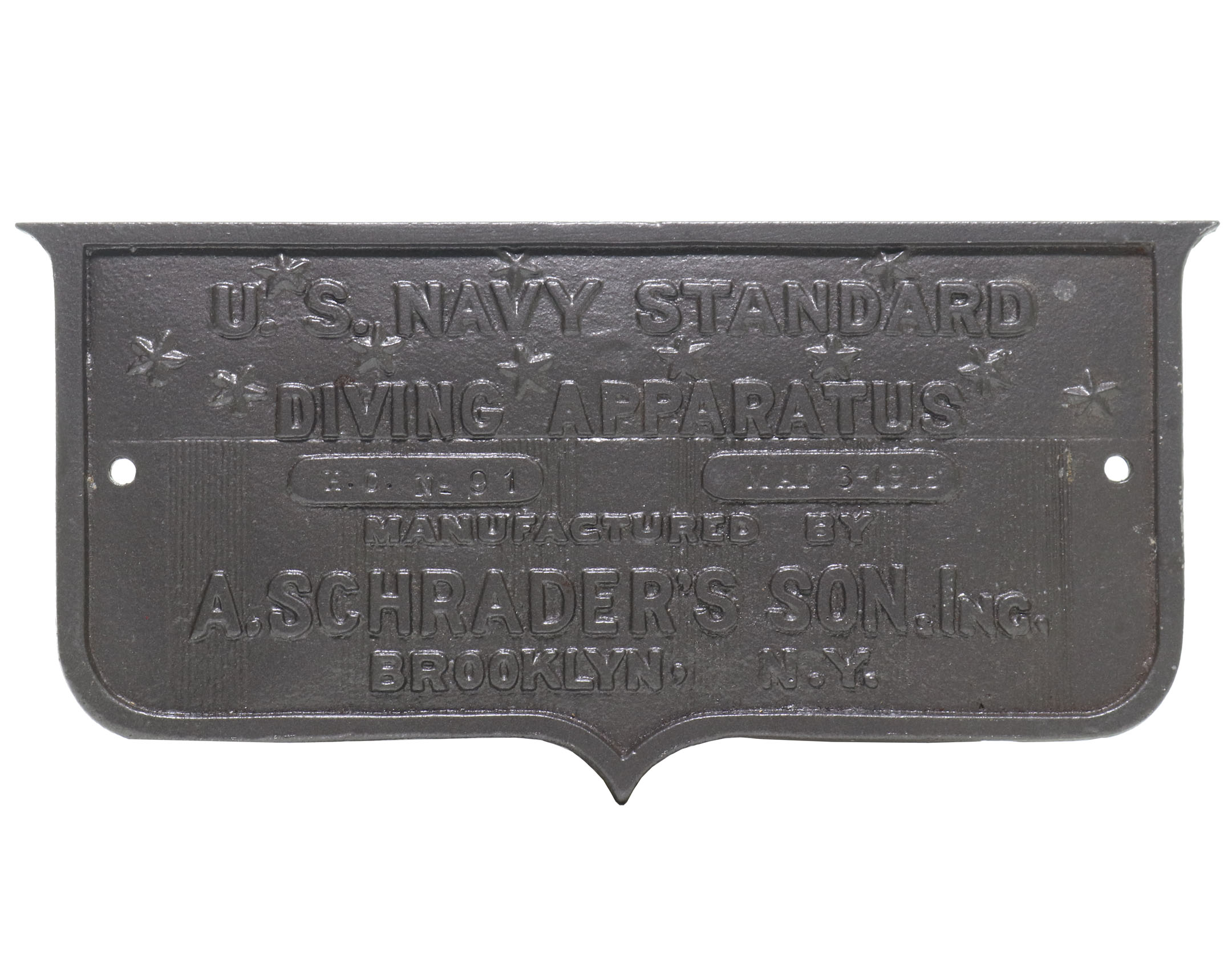 This is a like-new A. Schrader’s Son Inc. US Navy Standard Diving Apparatus aluminum plaque. This contemporary piece measures 9” wide and 4-5/16” tall with a weight of 8 oz. Great display piece or as a replacement for a missing plaque.