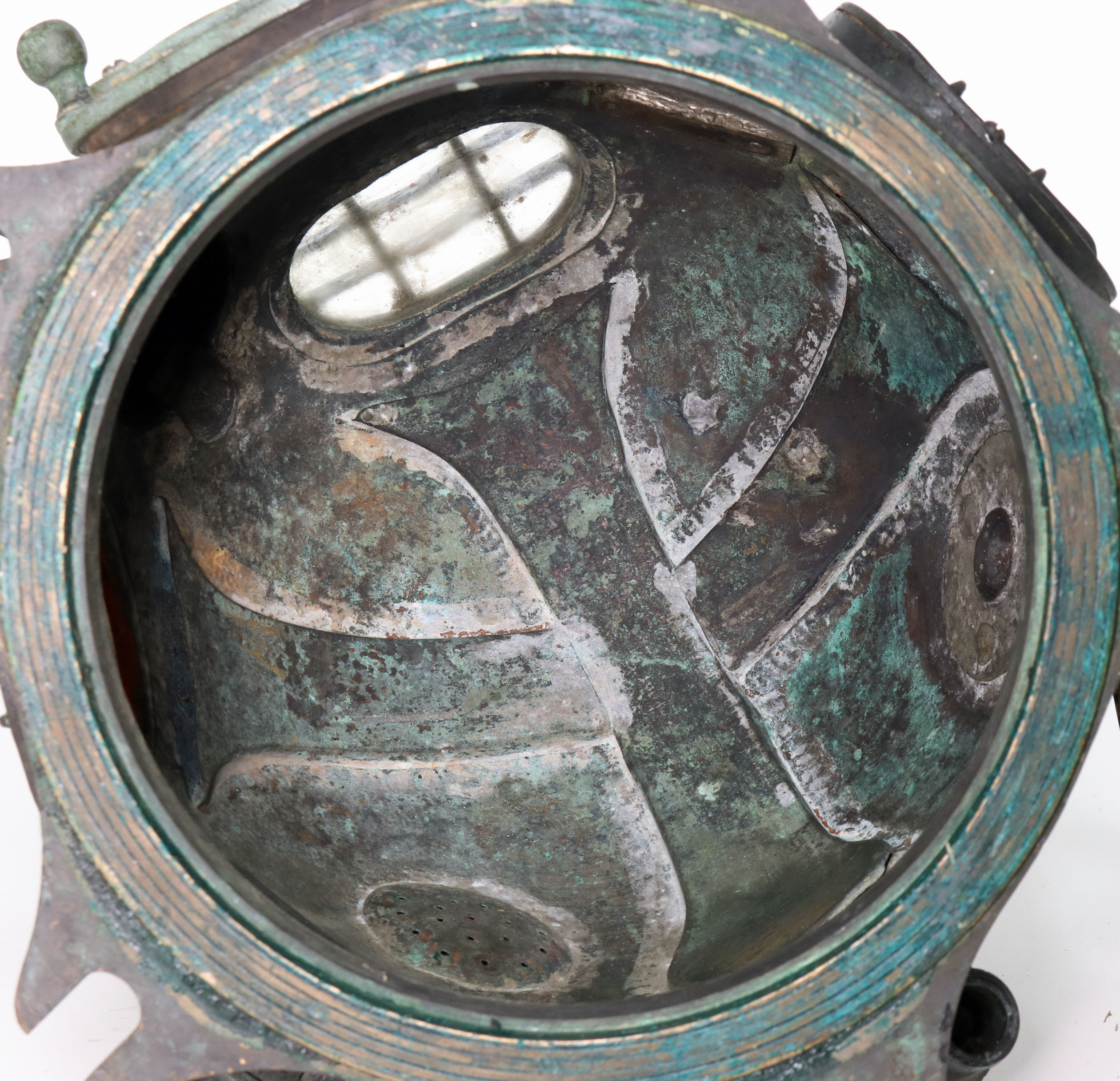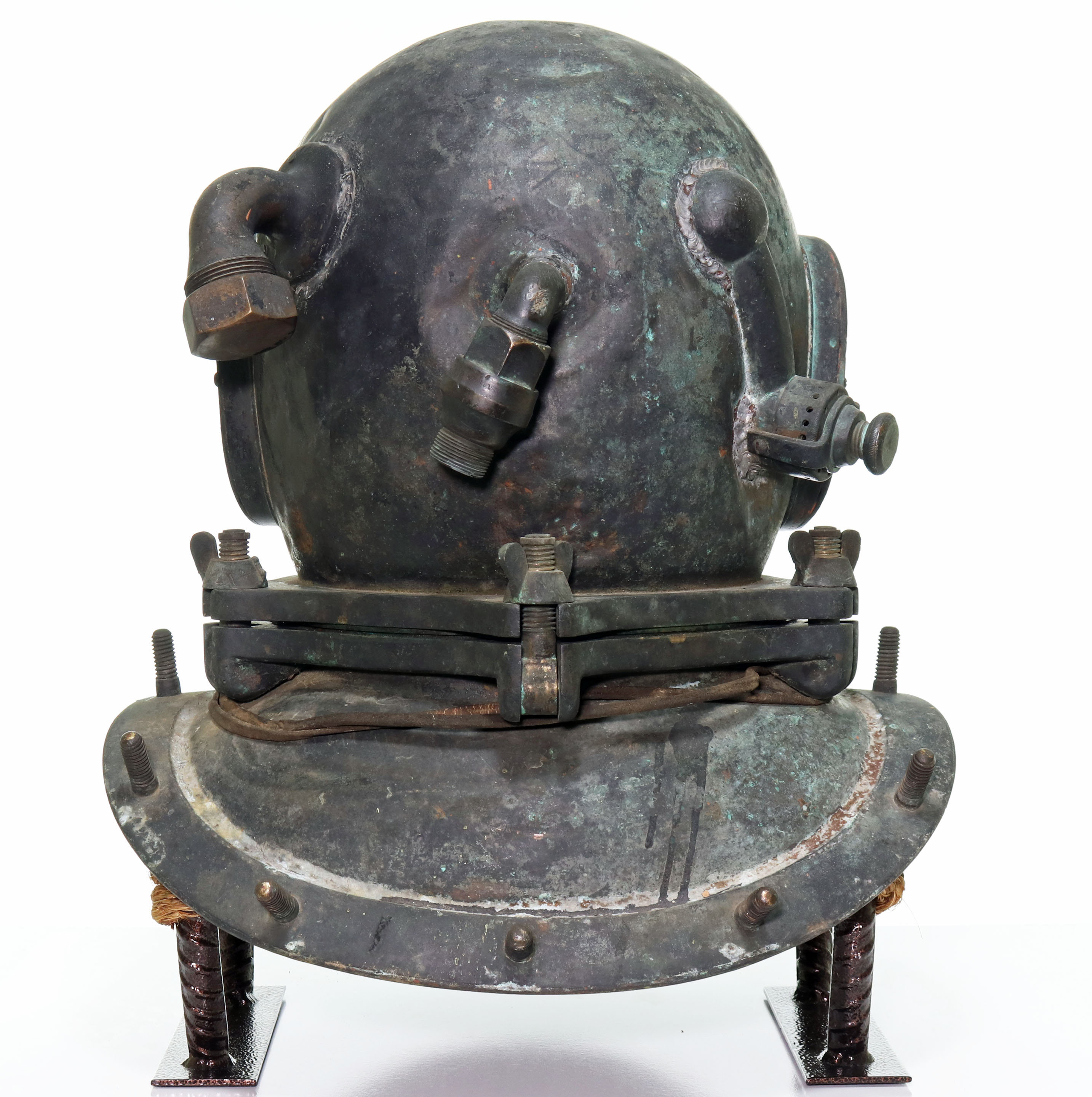This model is unique in that the bonnet (top) and breastplate (bottom) are secured together via 5 large bolts at the neck ring. Traditionally, helmets were threaded together, but some favored this style. While the US Navy used the 5-bolt pattern, helmets in their inventory after 1916 were generally retrofitted into a threaded style, making the surviving 5-bolt helmets quite rare.