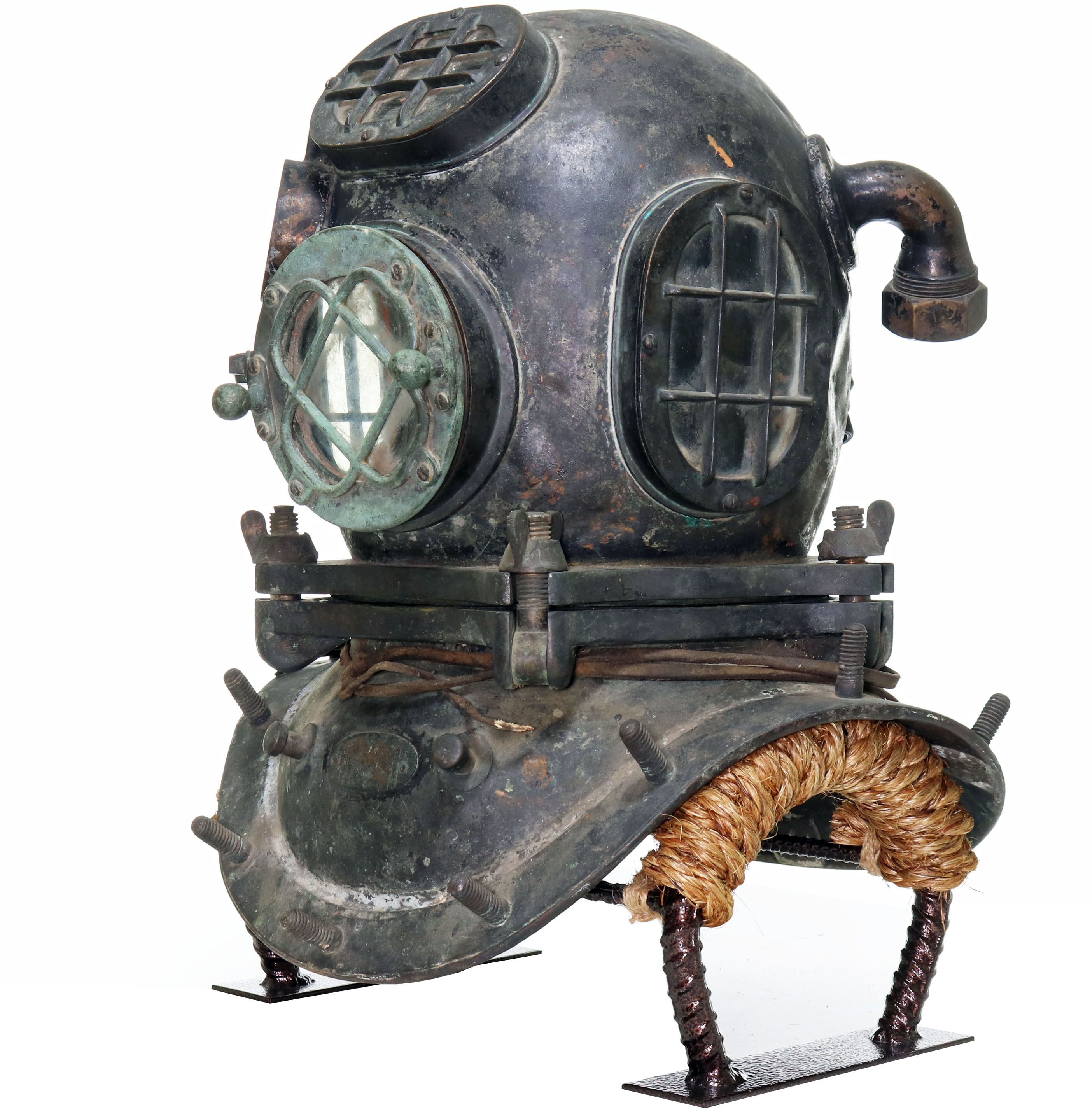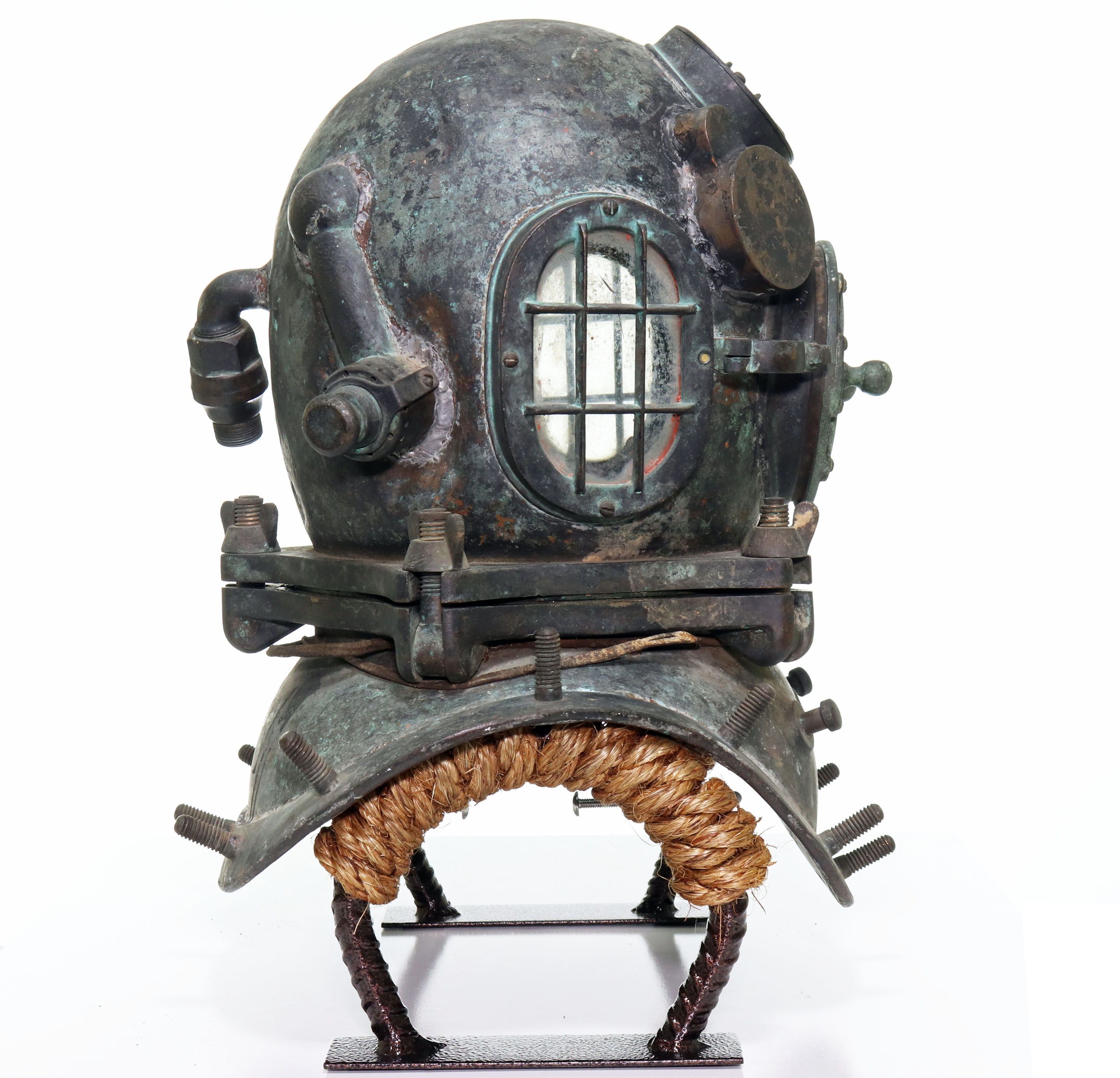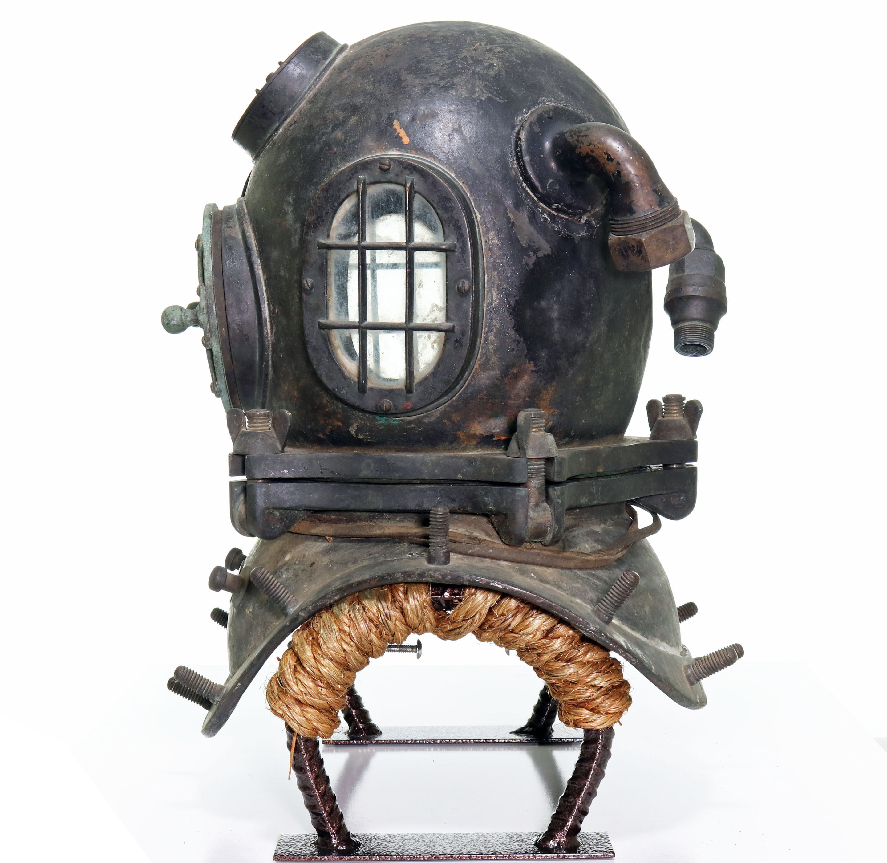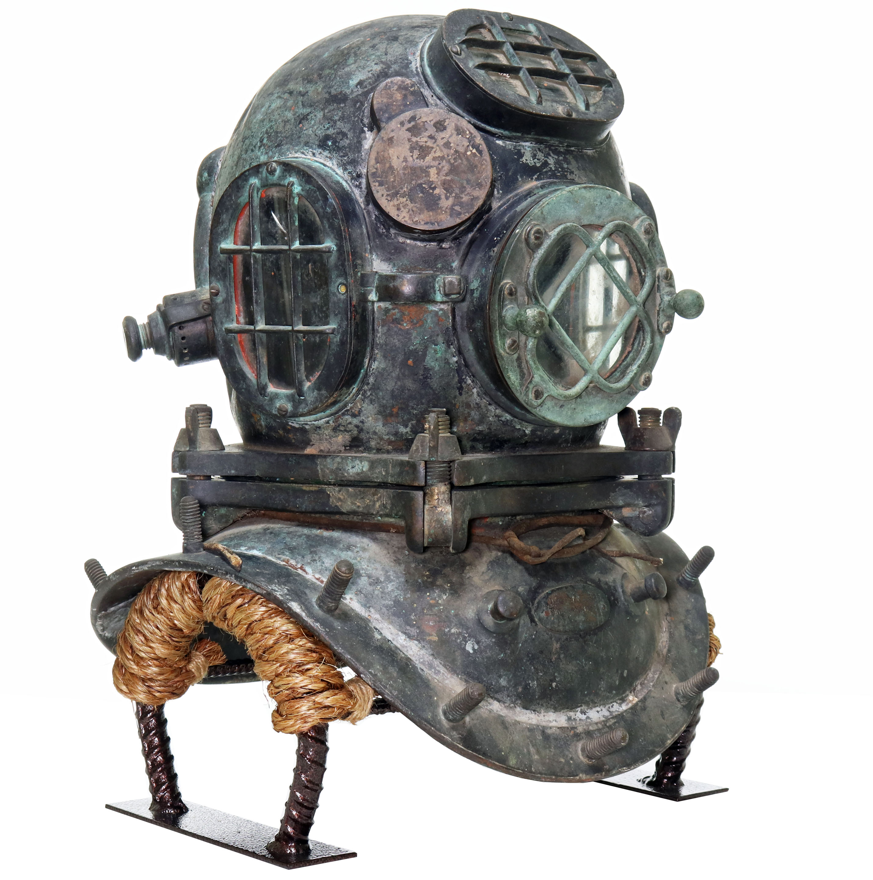 One of the most desirable and rare American diving helmets is the 5-bolt pattern made by the A.J. Morse company in Boston, Massachusetts, also known as the US Navy Mark 1. This style of helmet was used by the US Navy in the late 19th Century and early 20th Century before the Mark V made its debut in 1916. Commercial divers would also use this style during these time periods.