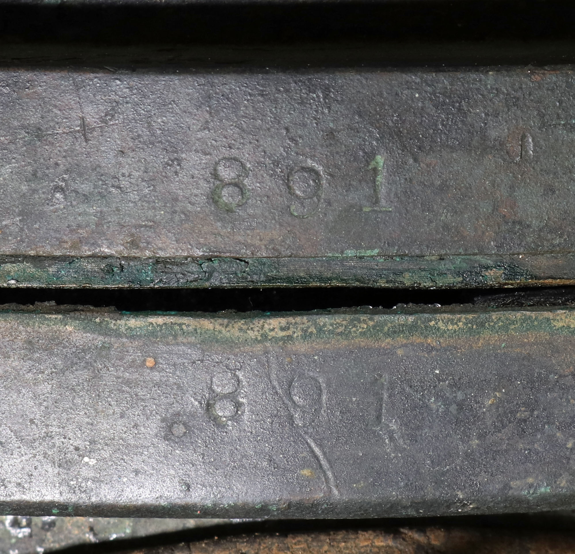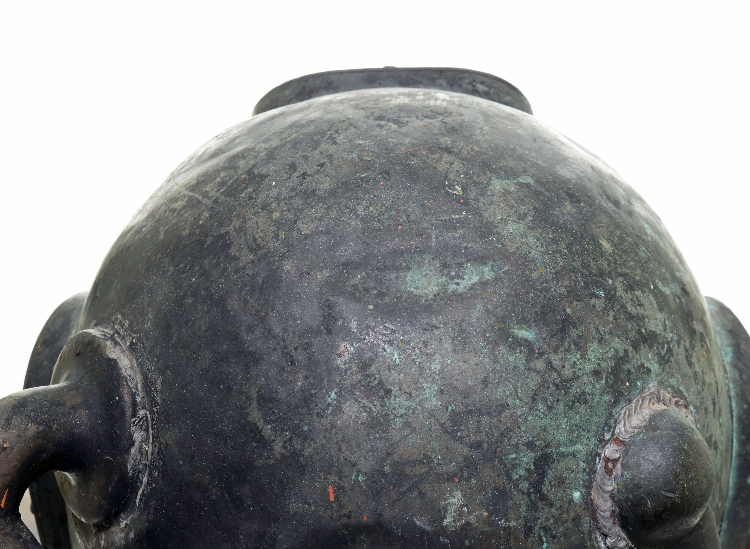 As shown in the photos, this helmet is in its original, as-found condition. The unmistakable green and dark brown patina of a 120+ year old helmet is found on the copper body and brass hardware. All five of the bolt work. One of the ears on one bolt is broken off.