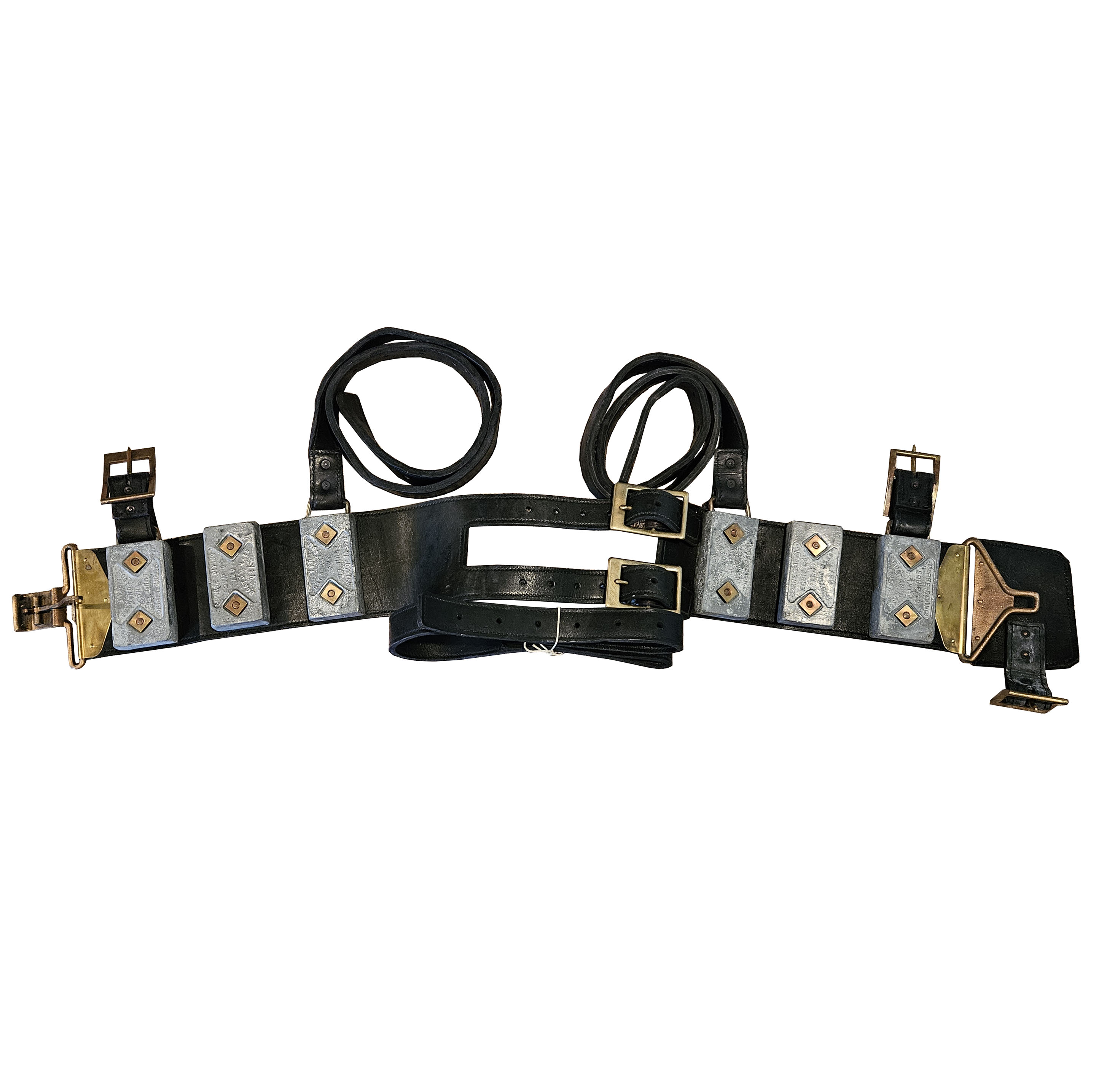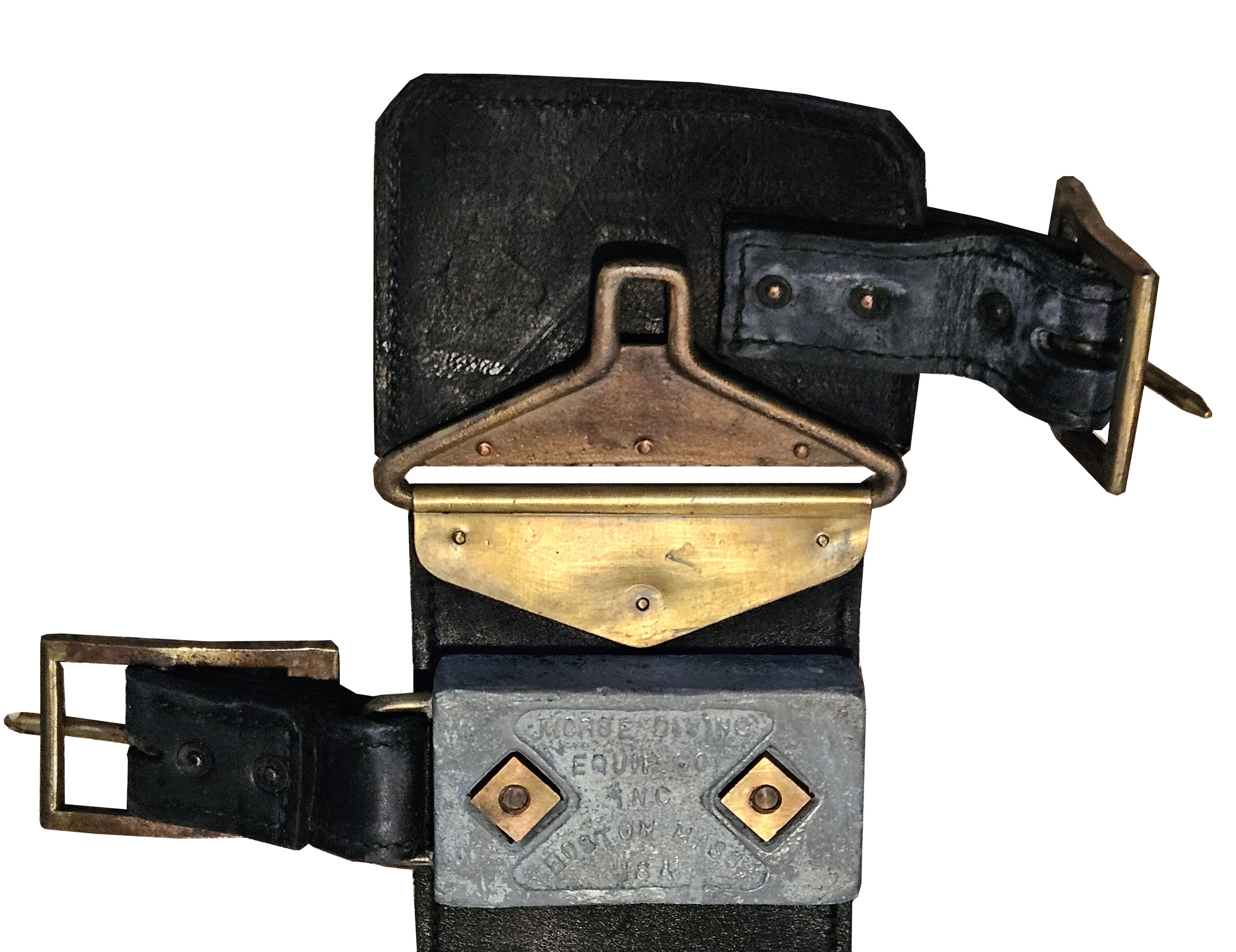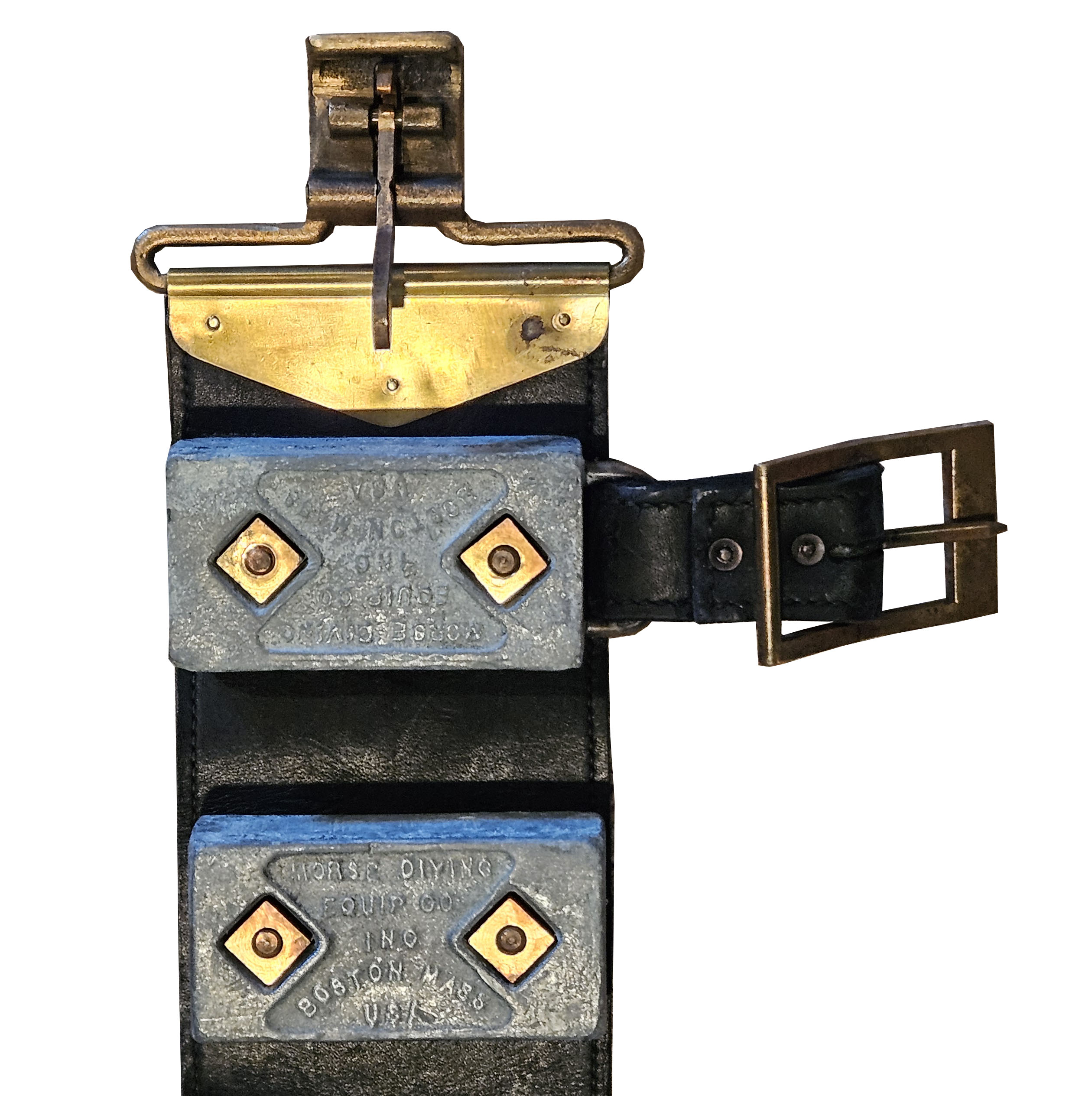 This is a great-looking, ready-to-use Morse Diving Equipment weight belt. Black leather belt with brass hardware and a full set of six Morse lead weights. Belt appears to have never been in the water!
