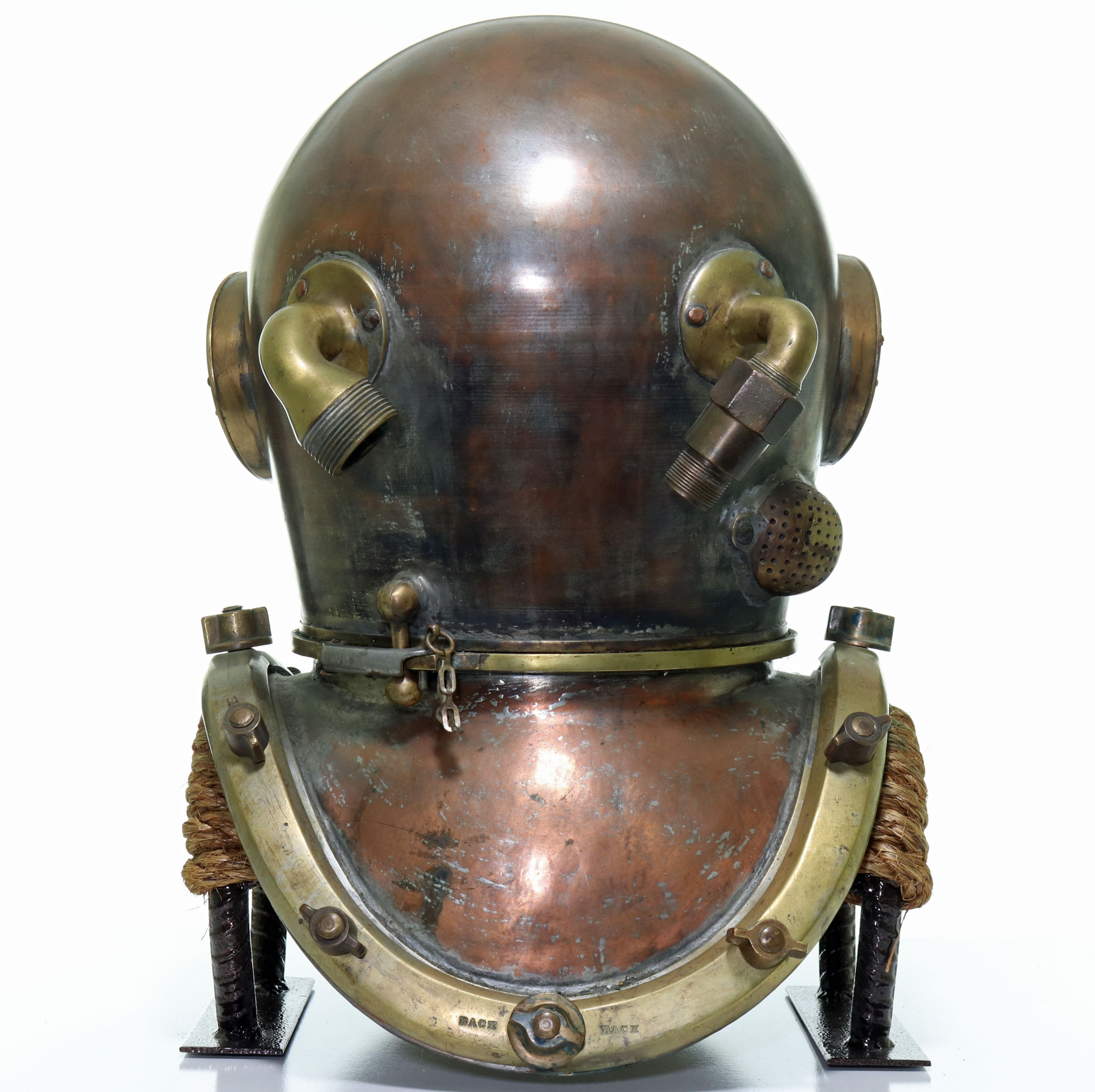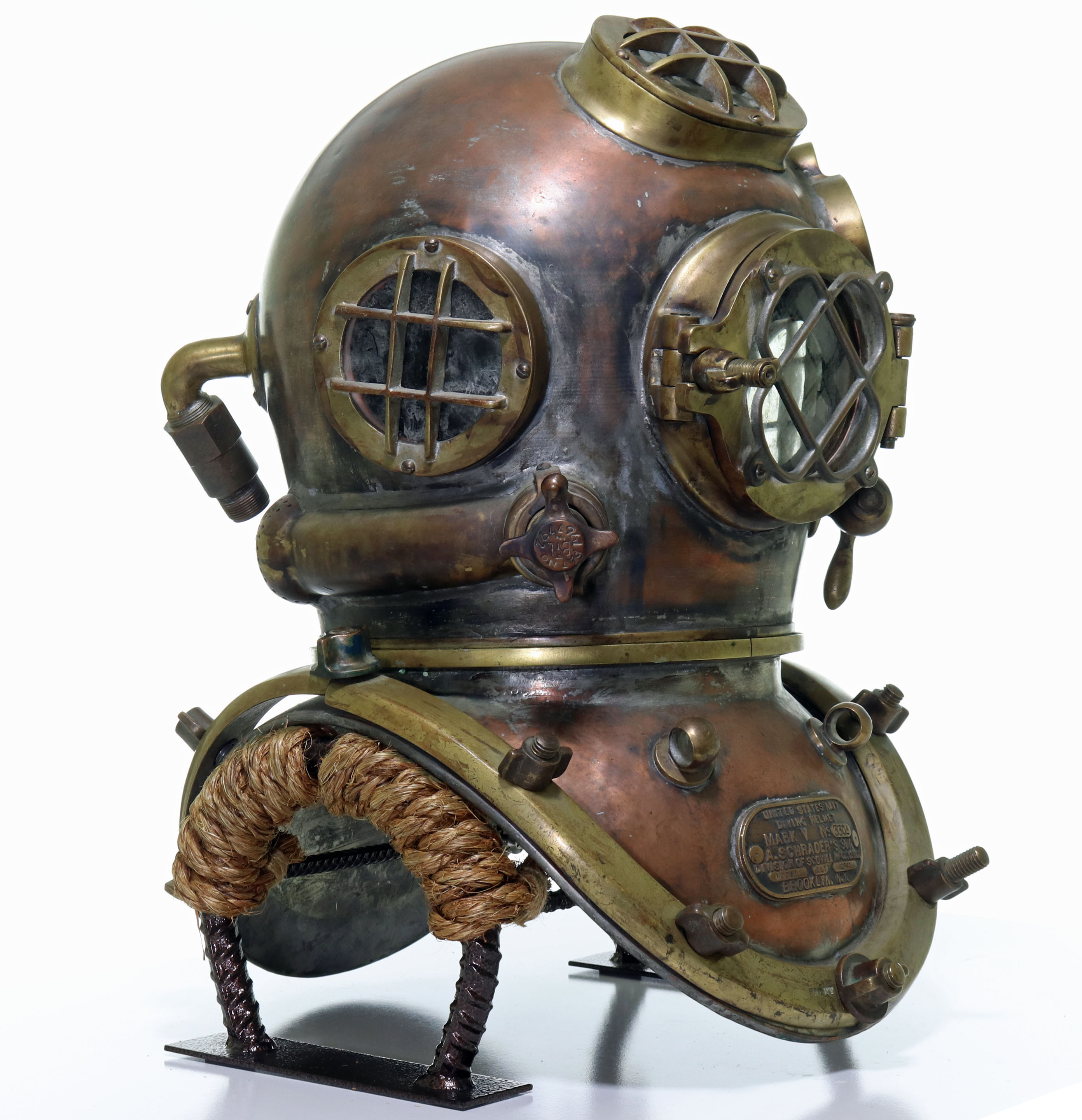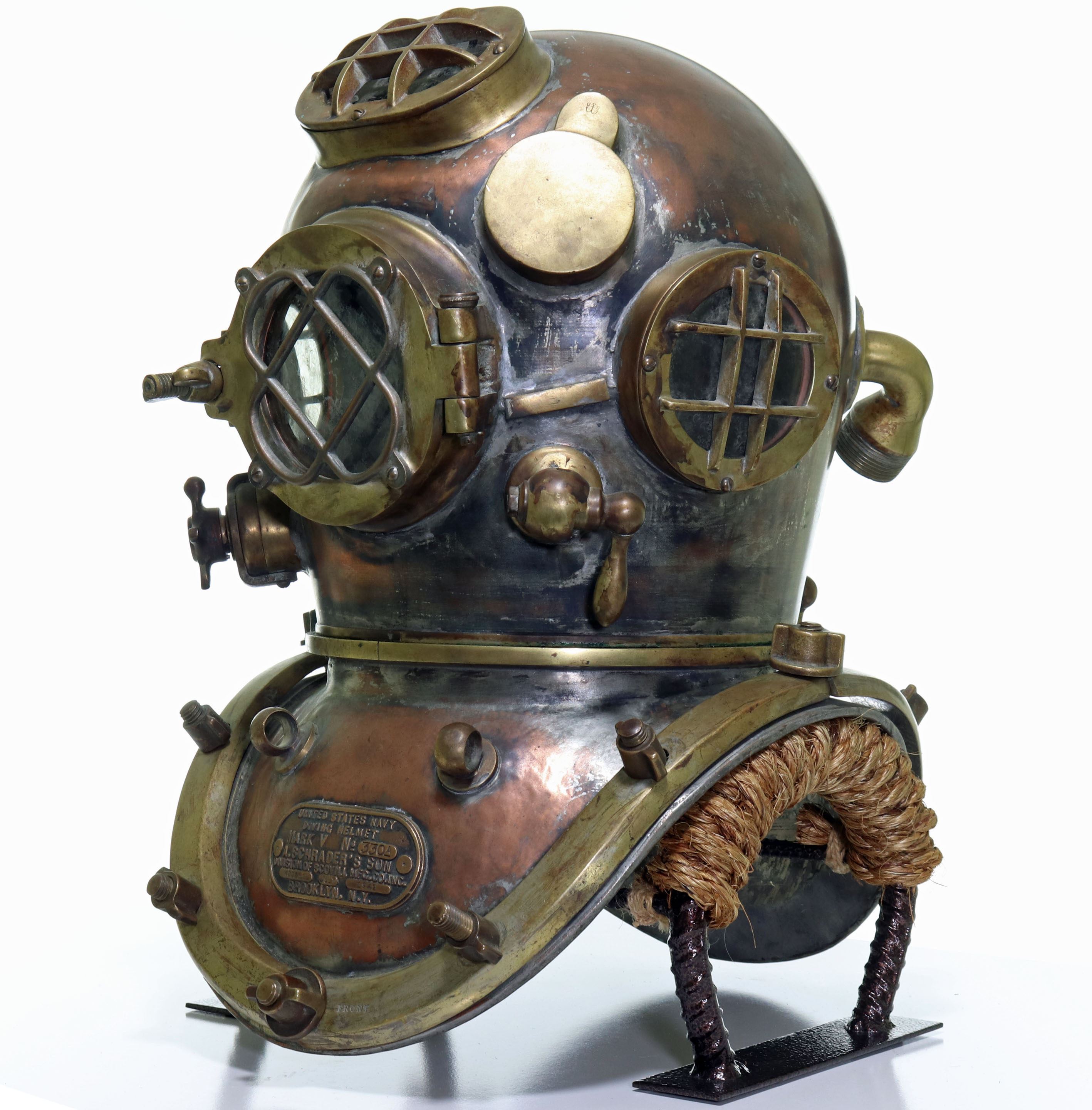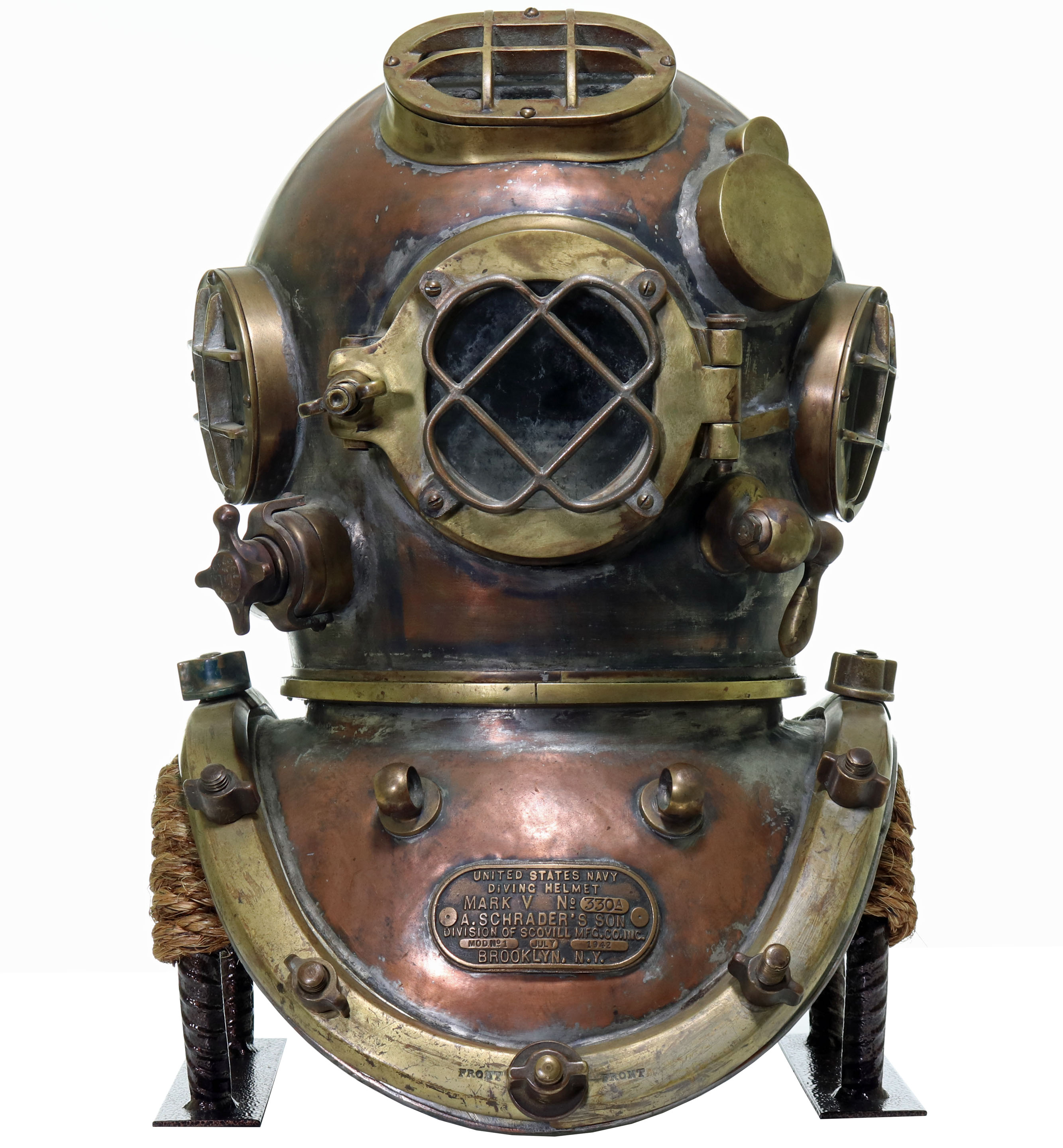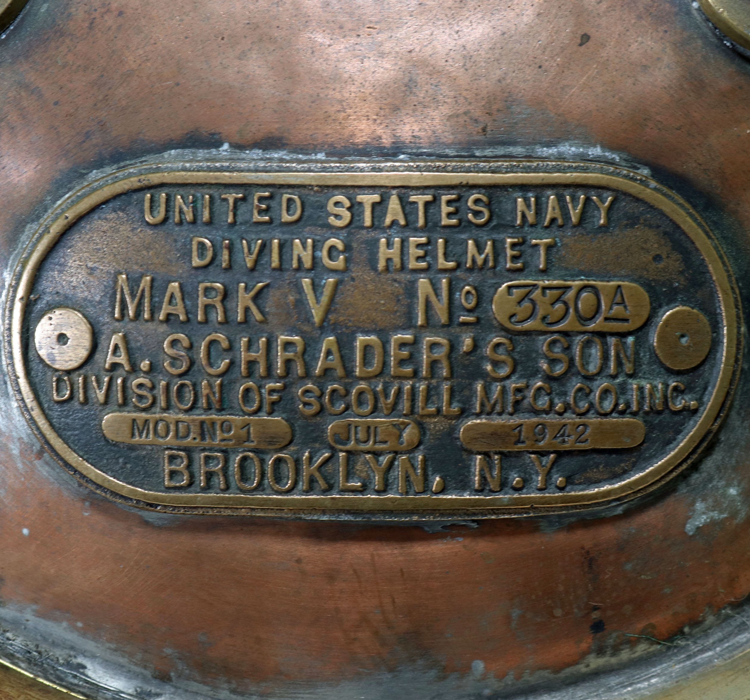Arguably the most desirable and collected diving helmet in the world, the United States Navy Mark V. This beautiful example was made in July 1942 by the A. Schrader’s Son Company, Division Of Scovill Mfg. Co. Schrader was one of the original two companies to manufacture the Mark V for the US Navy, starting in 1916. Schrader would land numerous contracts during World War 2 to produce the Mark V.
