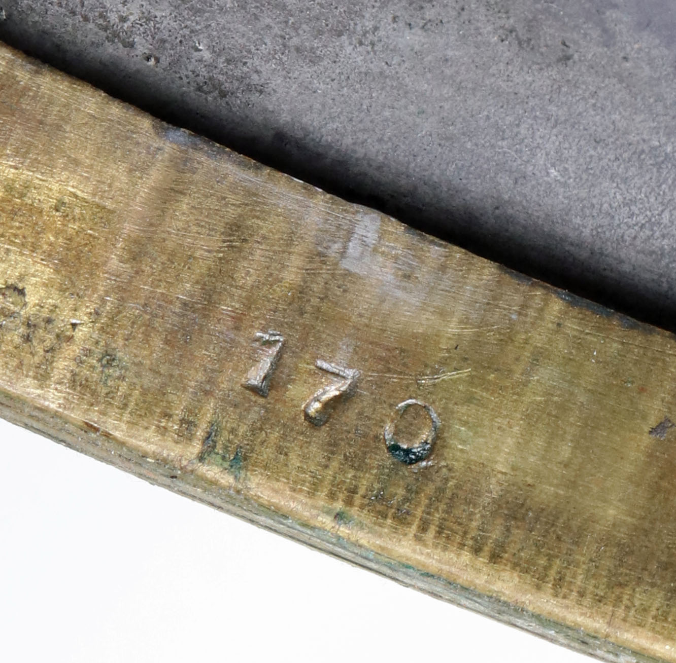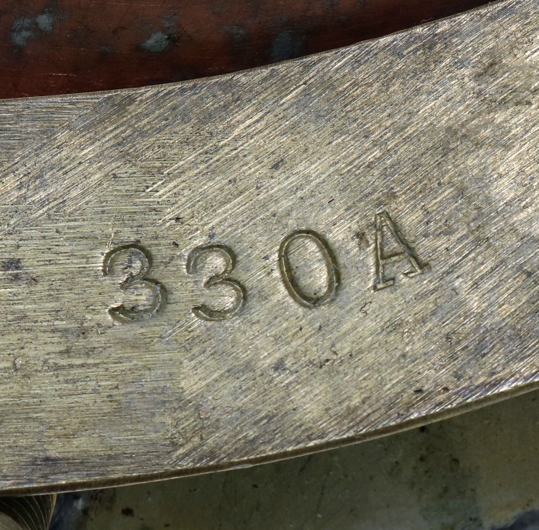 Finding a Mark V from 1942 is much more difficult than examples from 1943 to 1945. Production of the helmet, along with millions of other war-critical items, had not quite reached its peak. During 1942, Schrader would typically place the serial number on the ID plate, on the bottom side of all four brails, and on the inside of the bonnet neck ring. This helmet features the number 330A on the ID plate and the bottom side of all four brails. The bonnet inside neck ring is stamped 170.