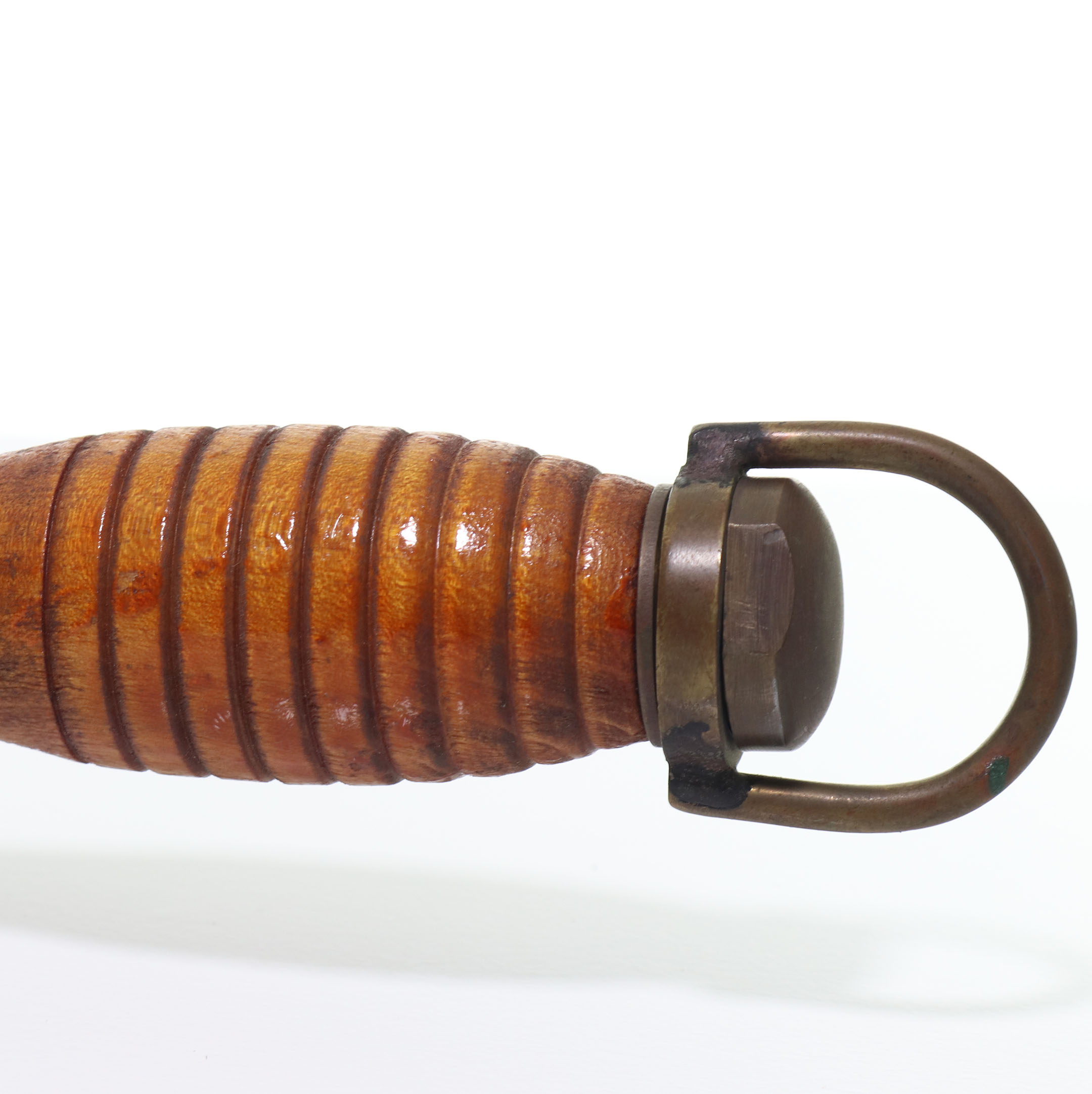 This particular Vince knife is in nice condition. The varnished maple handle remains free of cracks, and the brass sheath exhibits a nice consistent patina. The Vince blade shows subtle signs of use as well as cleaning. Vertical cleaning marks are visible on both sides of the blade. The number written in black on one side is Sharpie, which can be cleaned off.