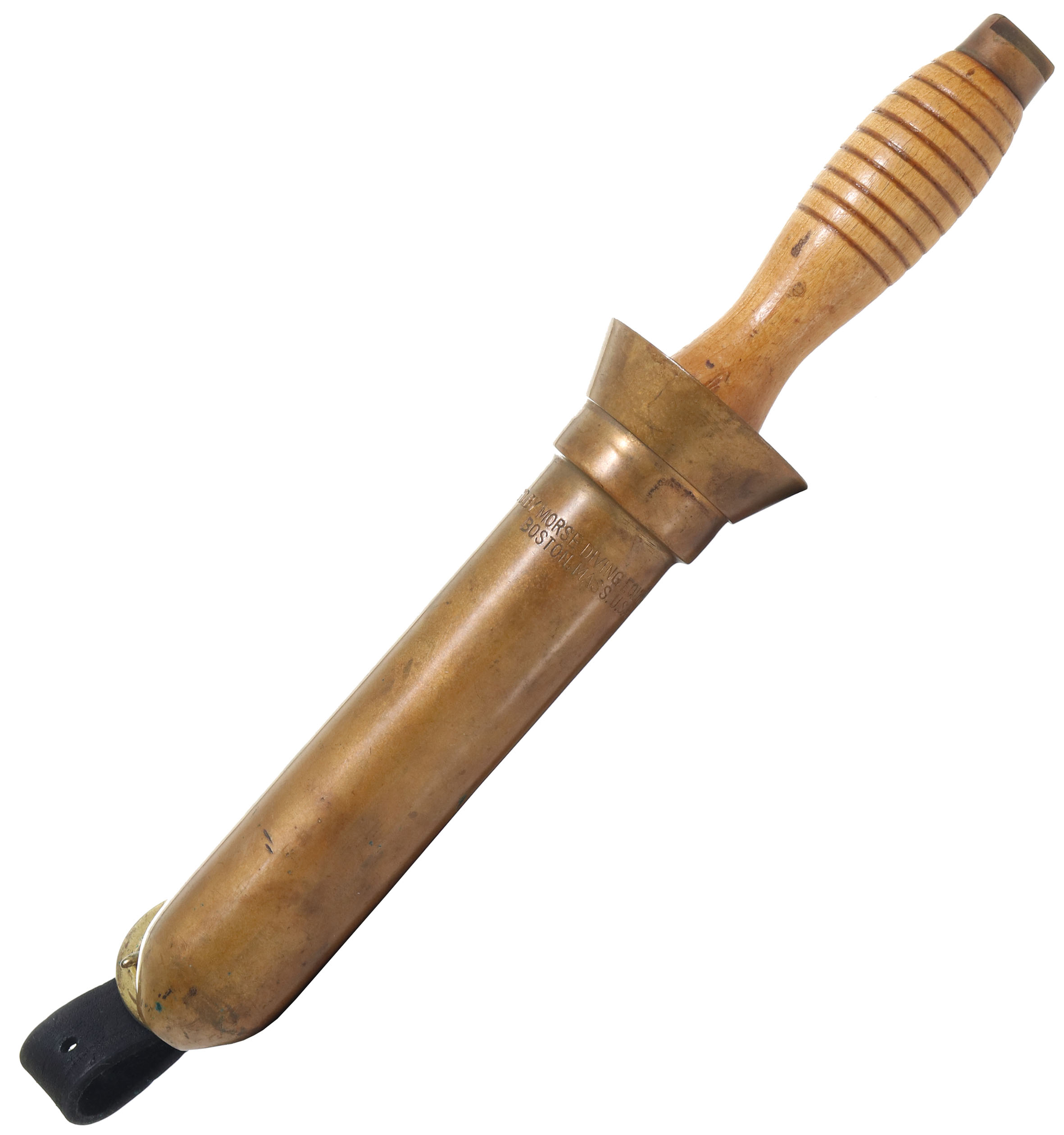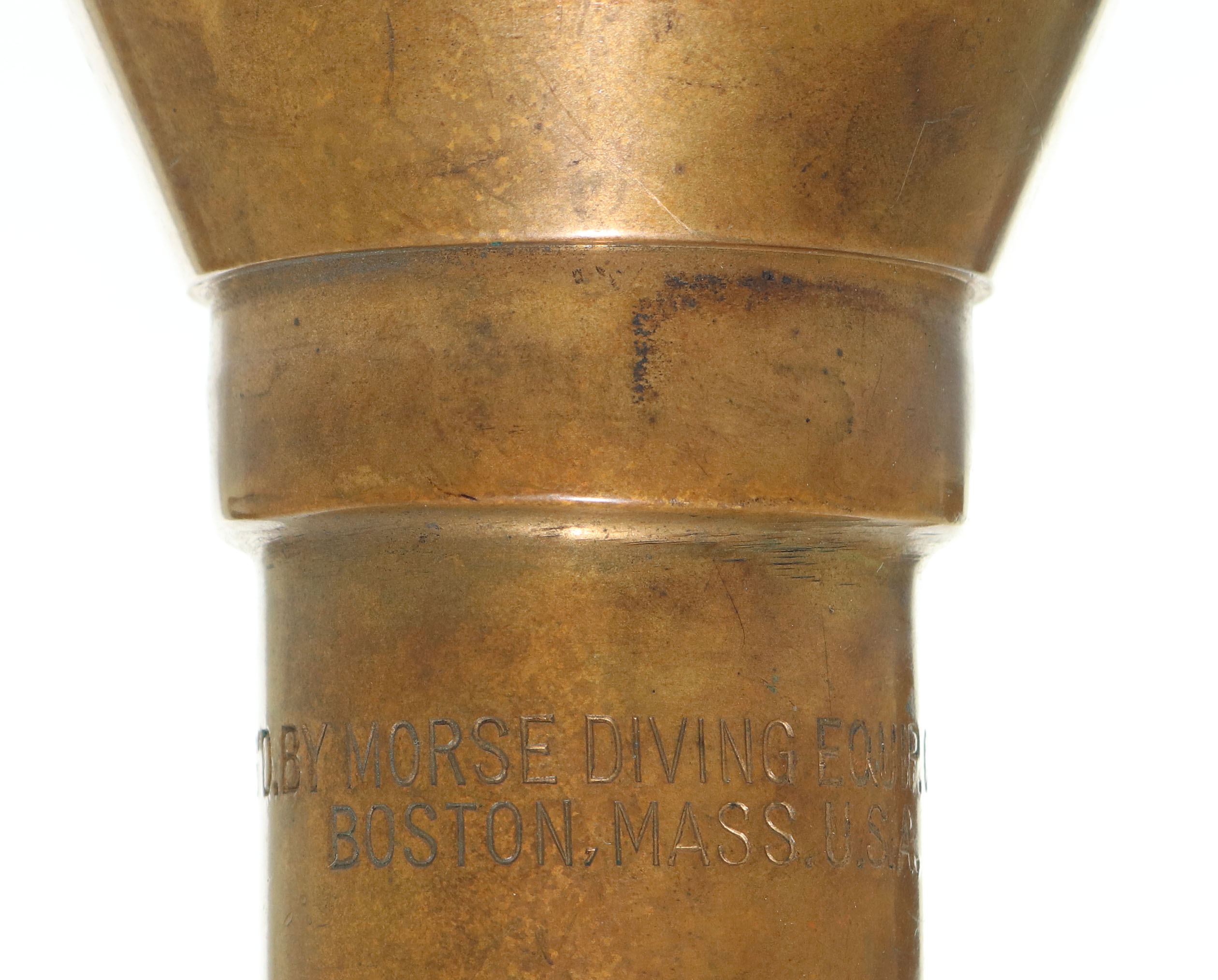 This is a classic circa World War 2 Morse Diving Equipment US Navy standard diving knife. These were primarily used with the Mark V diving helmet during the 20th Century. This example is clearly stamped on the brass sheath. The knife itself is in excellent original condition. The original leather belt strap is also included.
