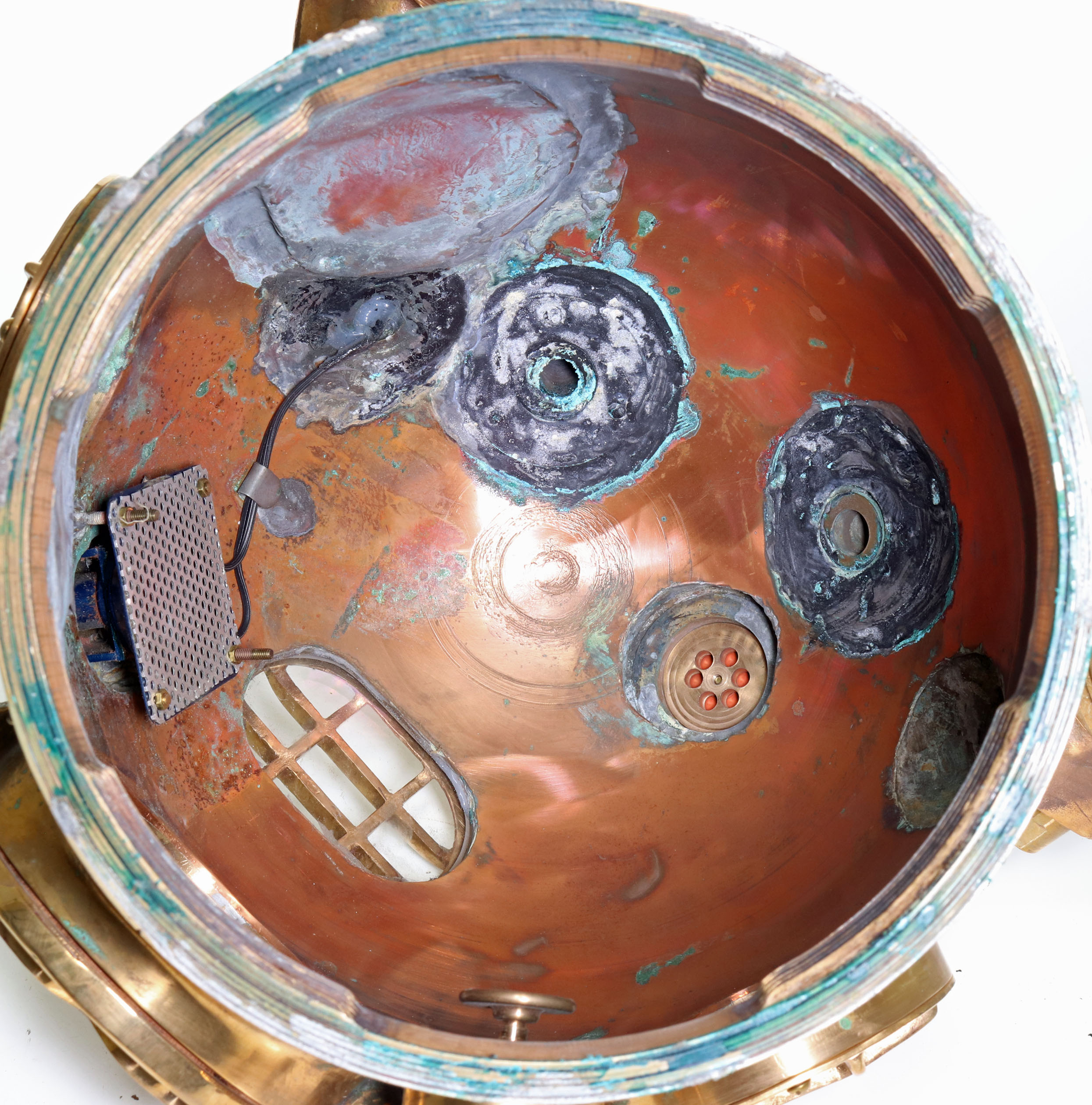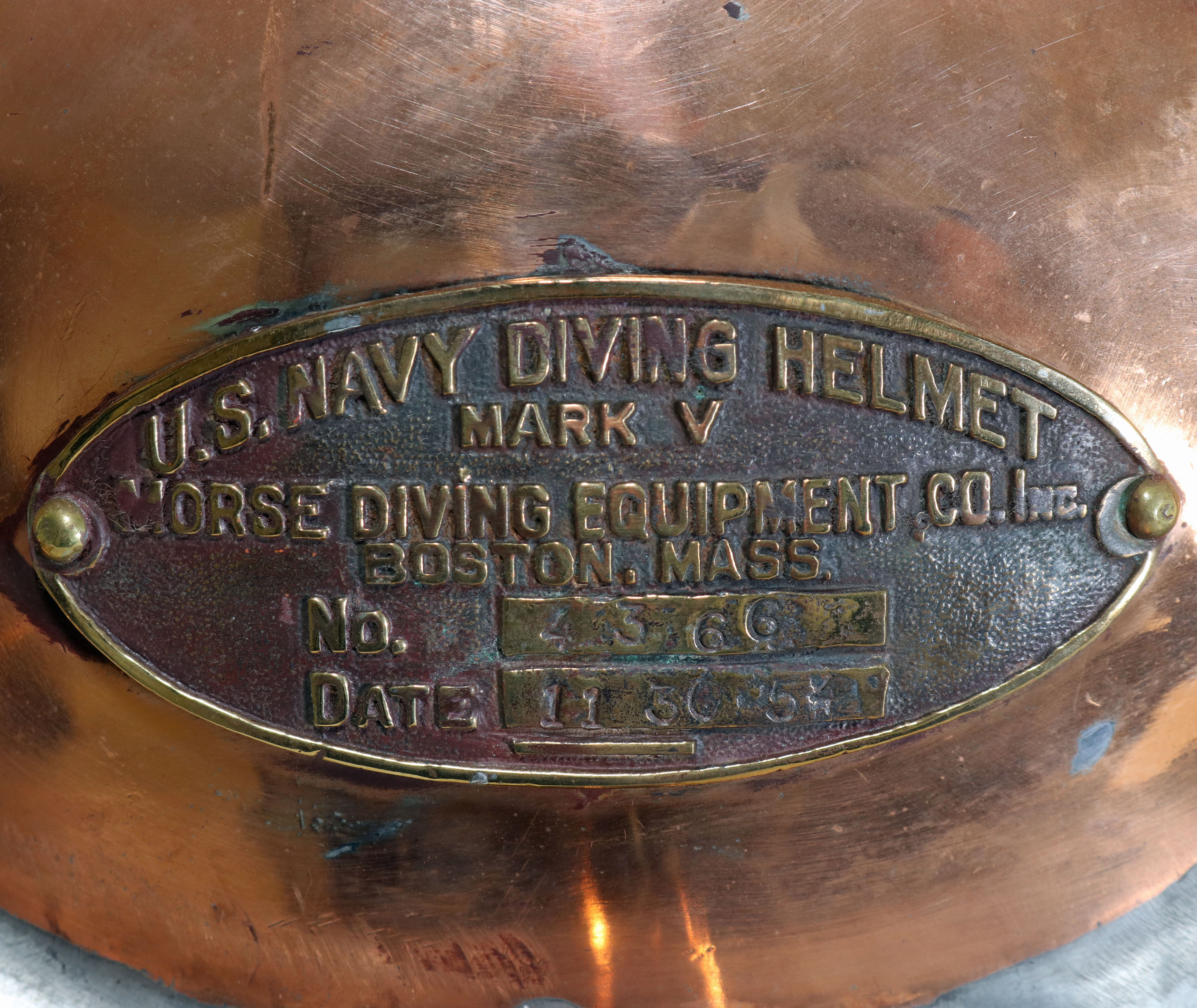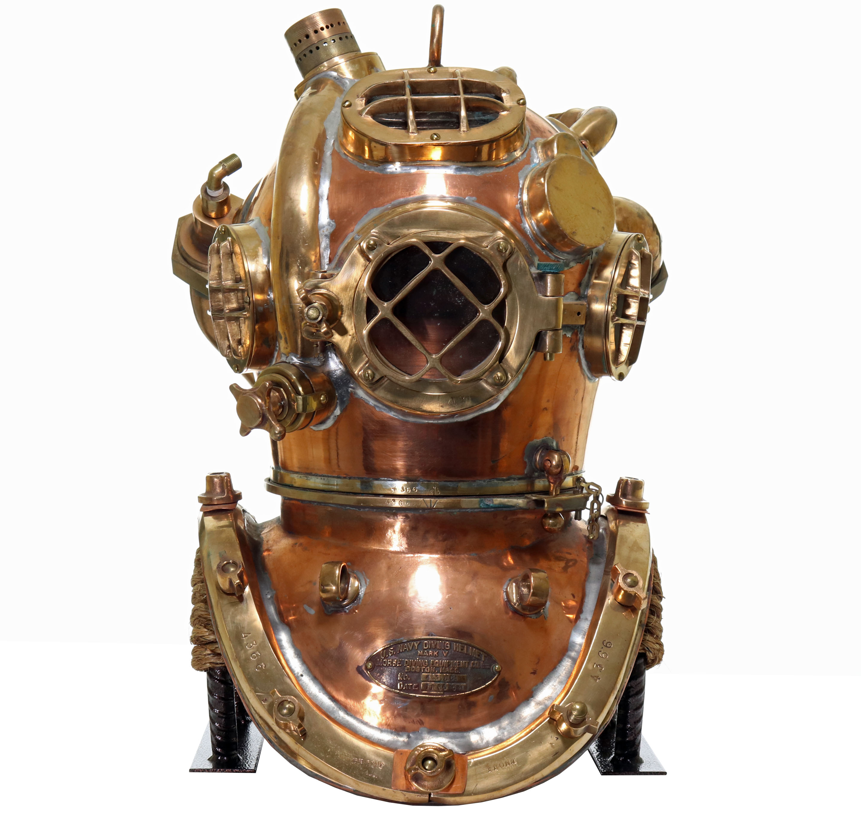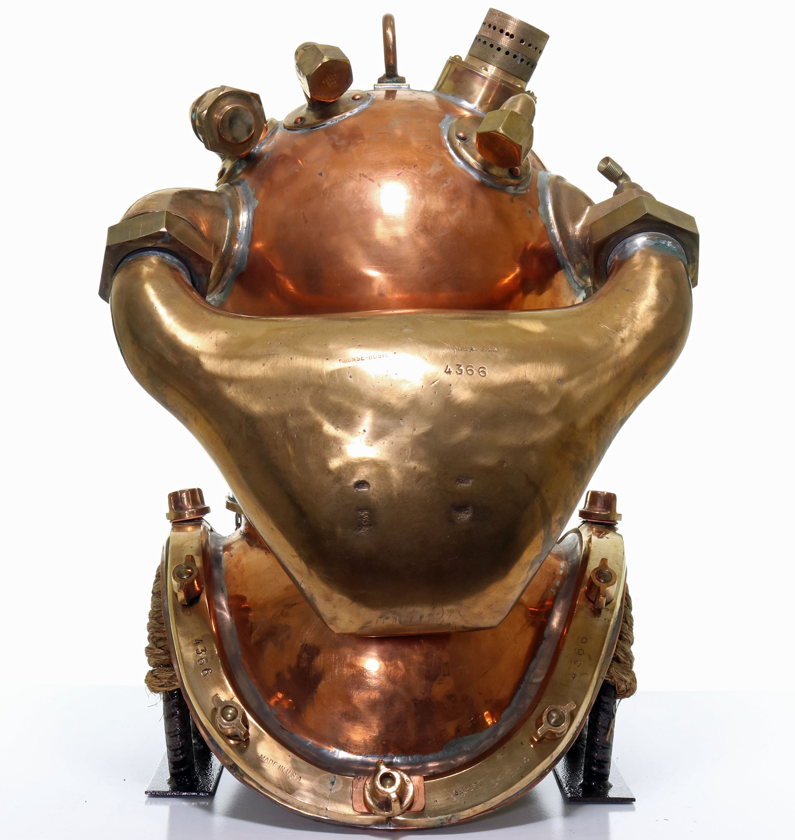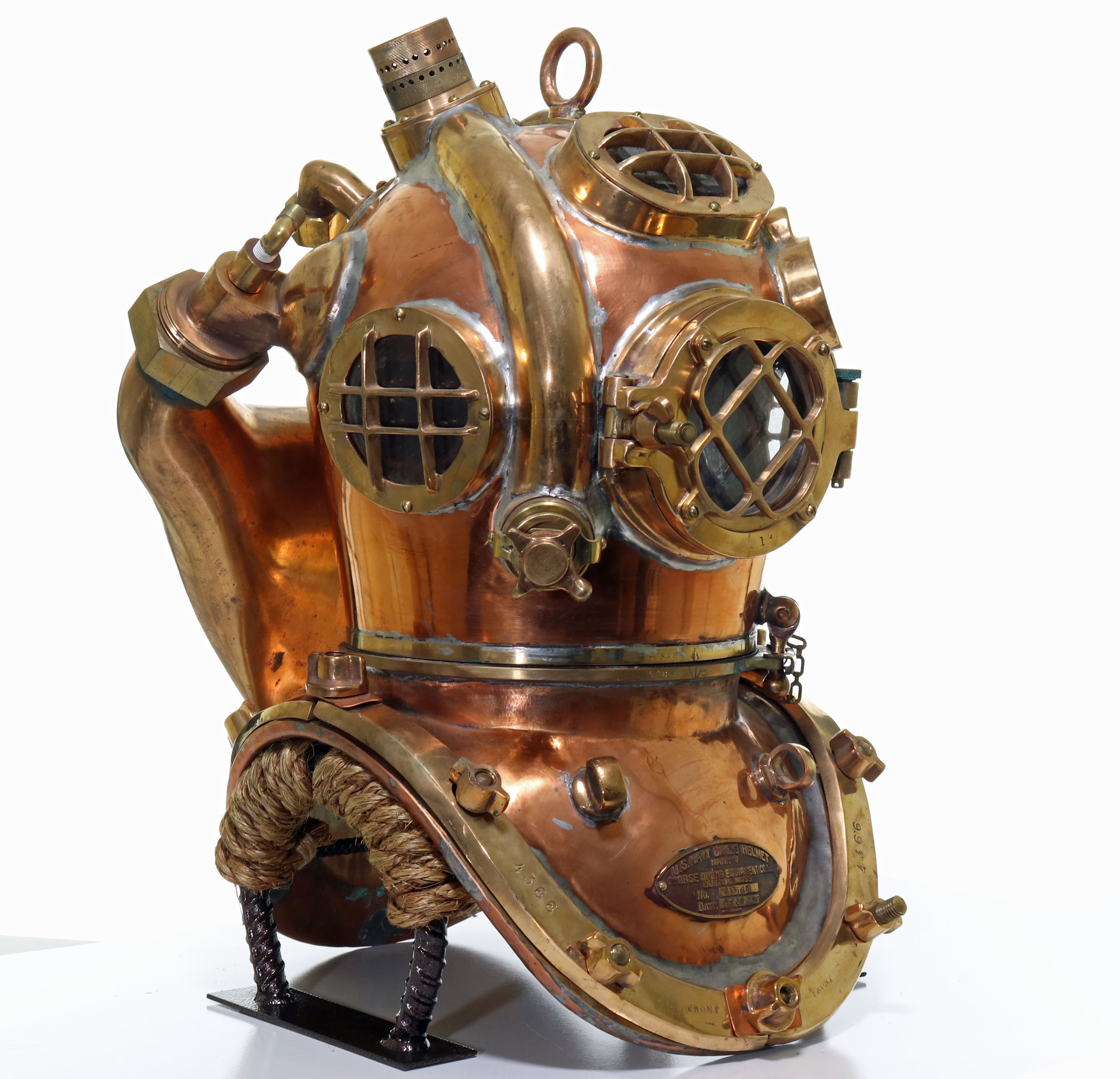 Not only is this a legendary United States Navy Mark V diving helmet, but it is also a rare helium example, also known as “The Widow Maker.” This variation of the standard Mark V helmet was designed for extreme deep diving missions. The large brass tank on the back contained an absorbent for the Co2 the diver produced. This absorbent, if exposed to water, would turn into a dangerous gas that was potentially lethal, hence the ominous nickname Navy divers gave this helmet.