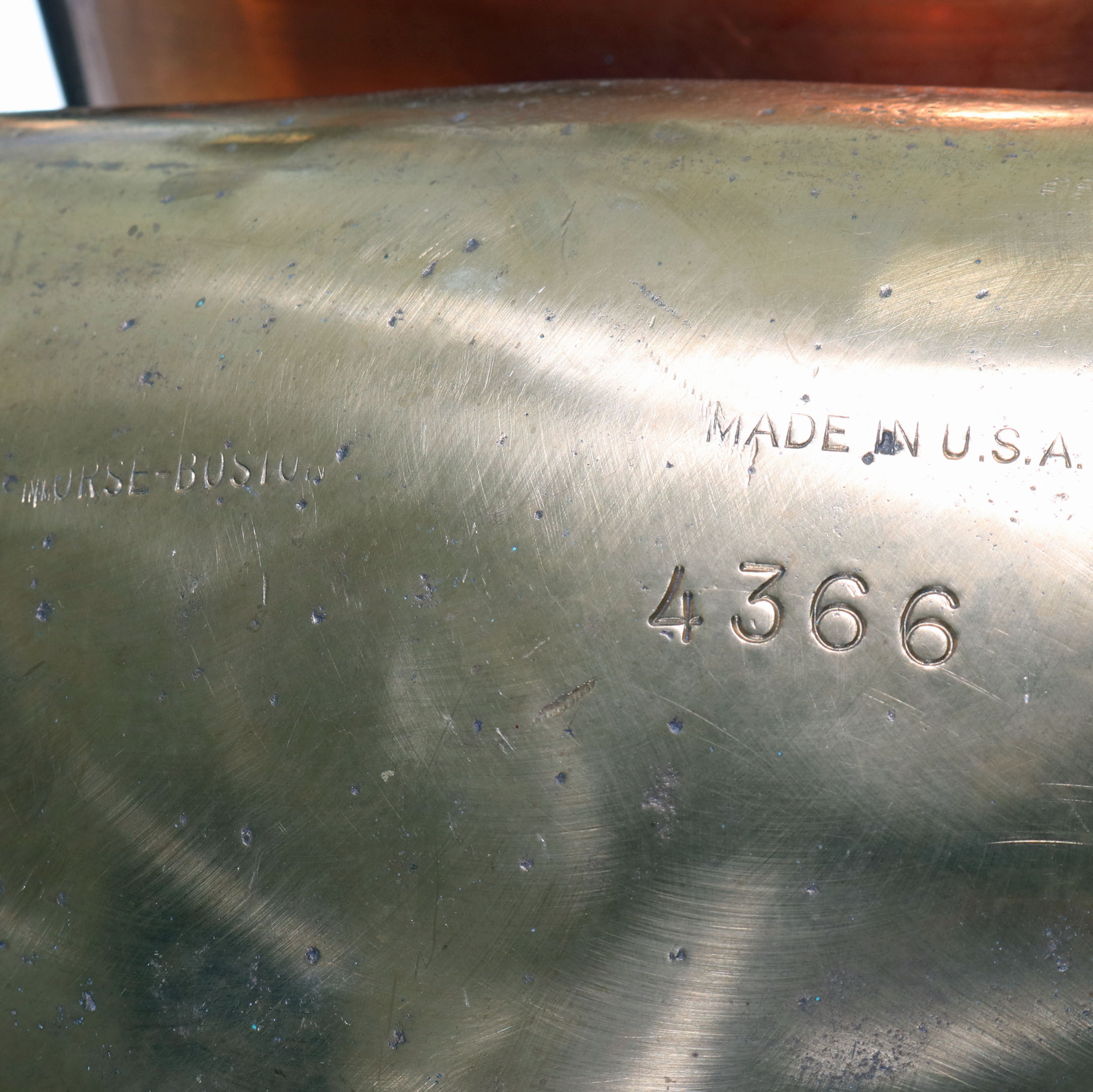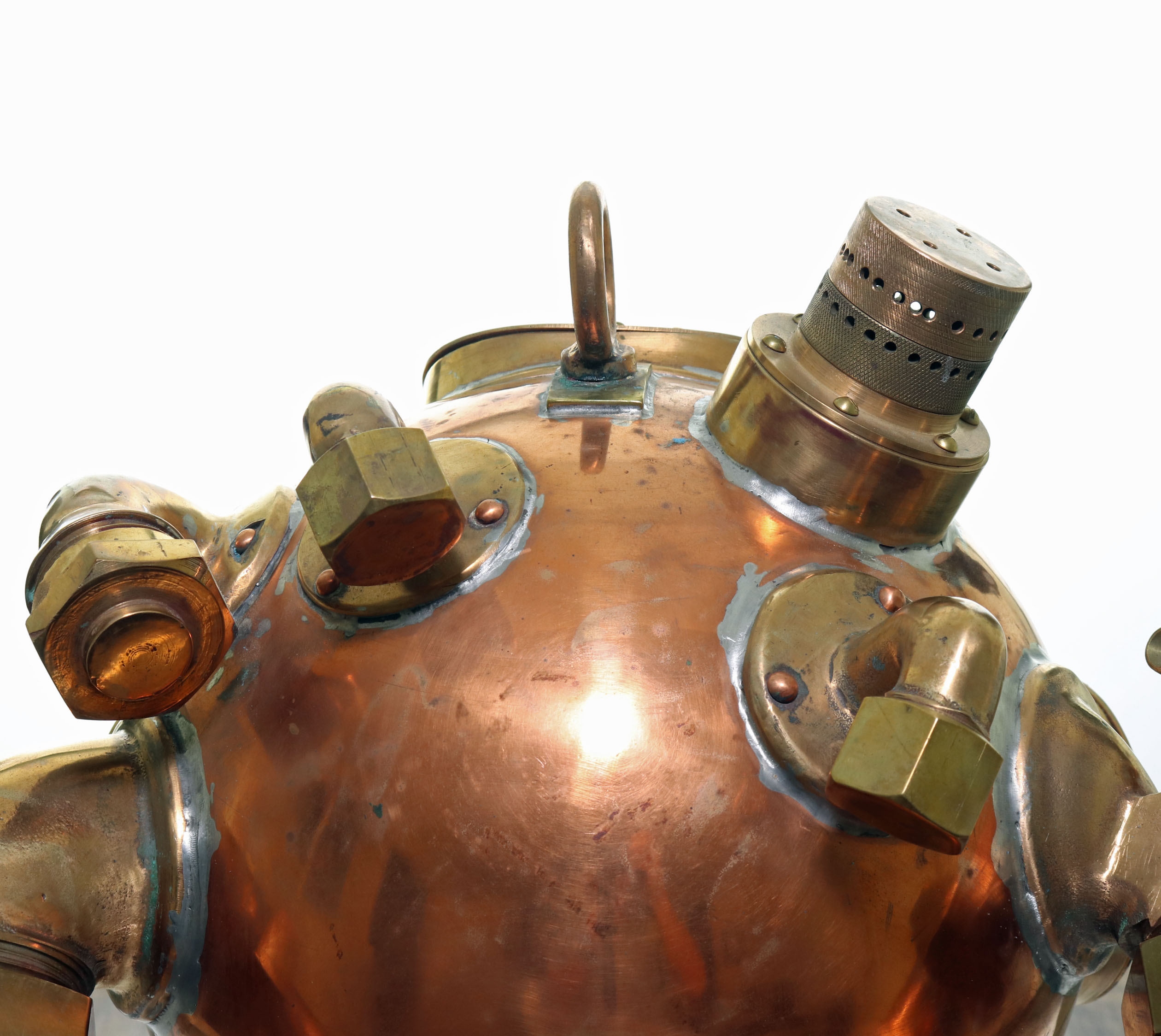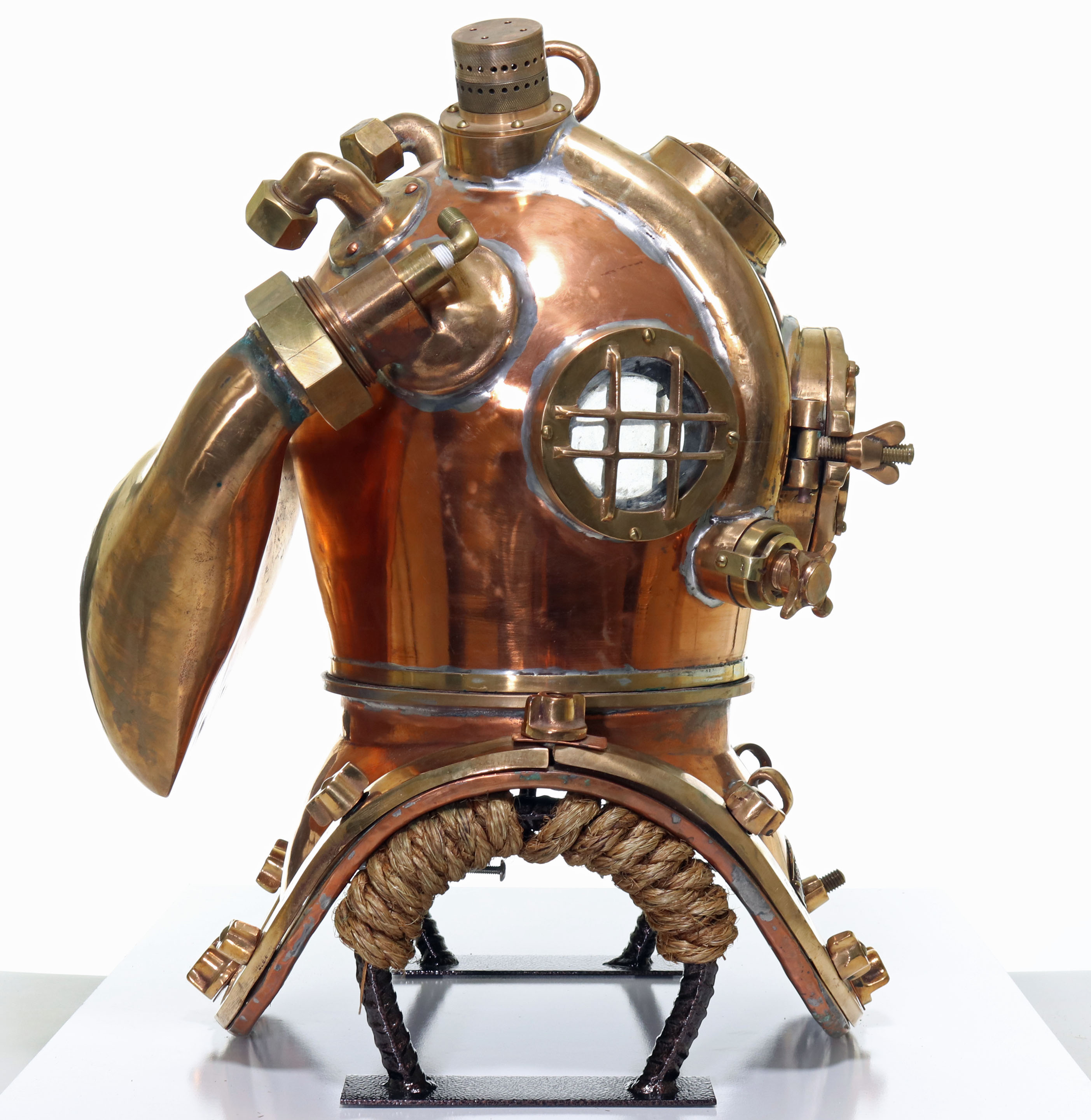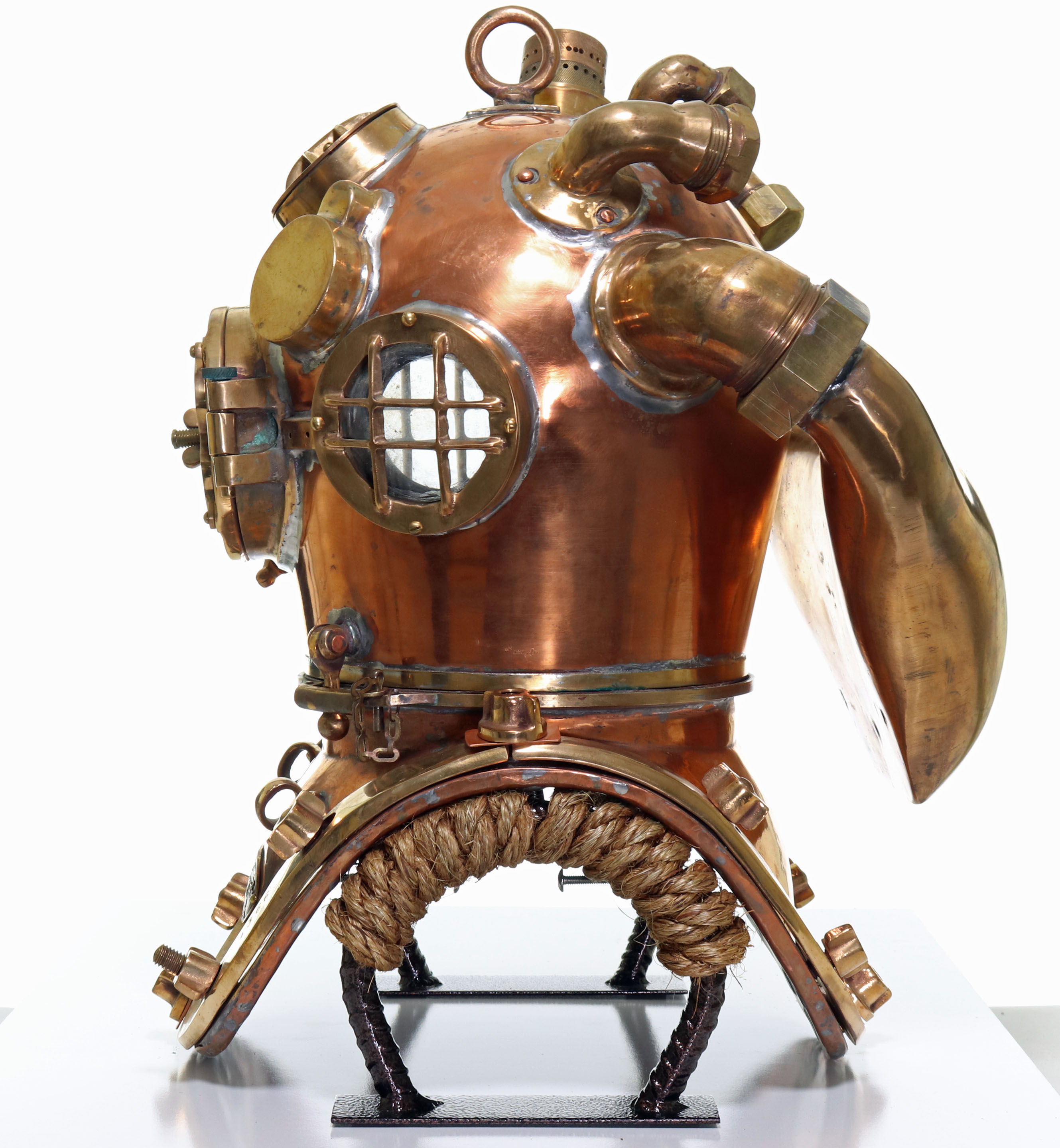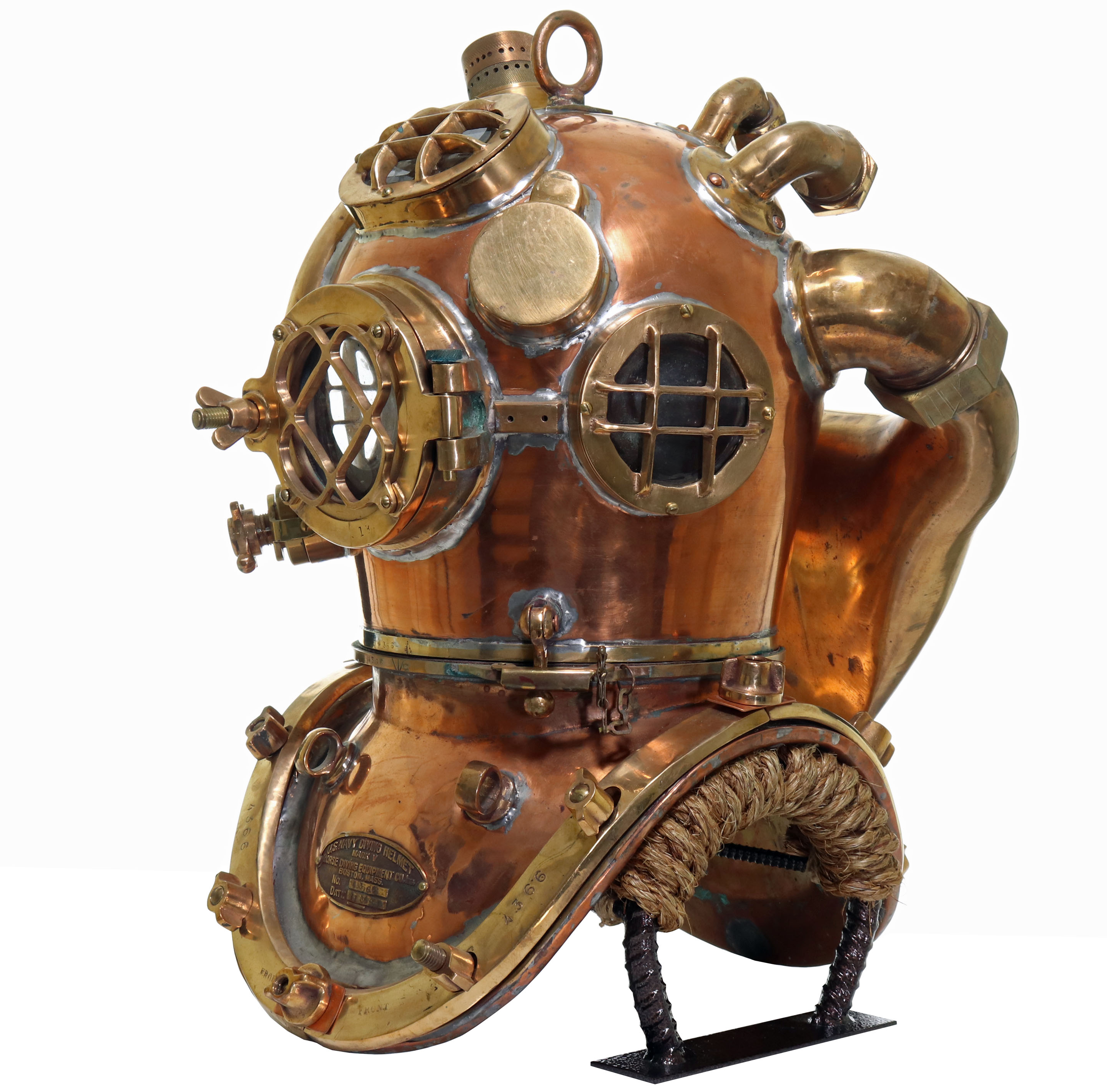 This helmet was made by Morse Diving Equipment Co. Inc. in Boston, Mass. Likely professionally polished many years ago, it has developed a subtle patina consistently over its copper body and brass hardware. This patina could be left as is, or if so desired, a simple hand polishing could make it shine like new again.