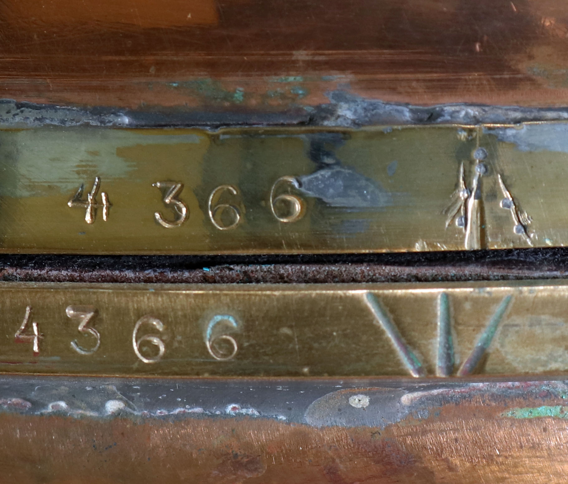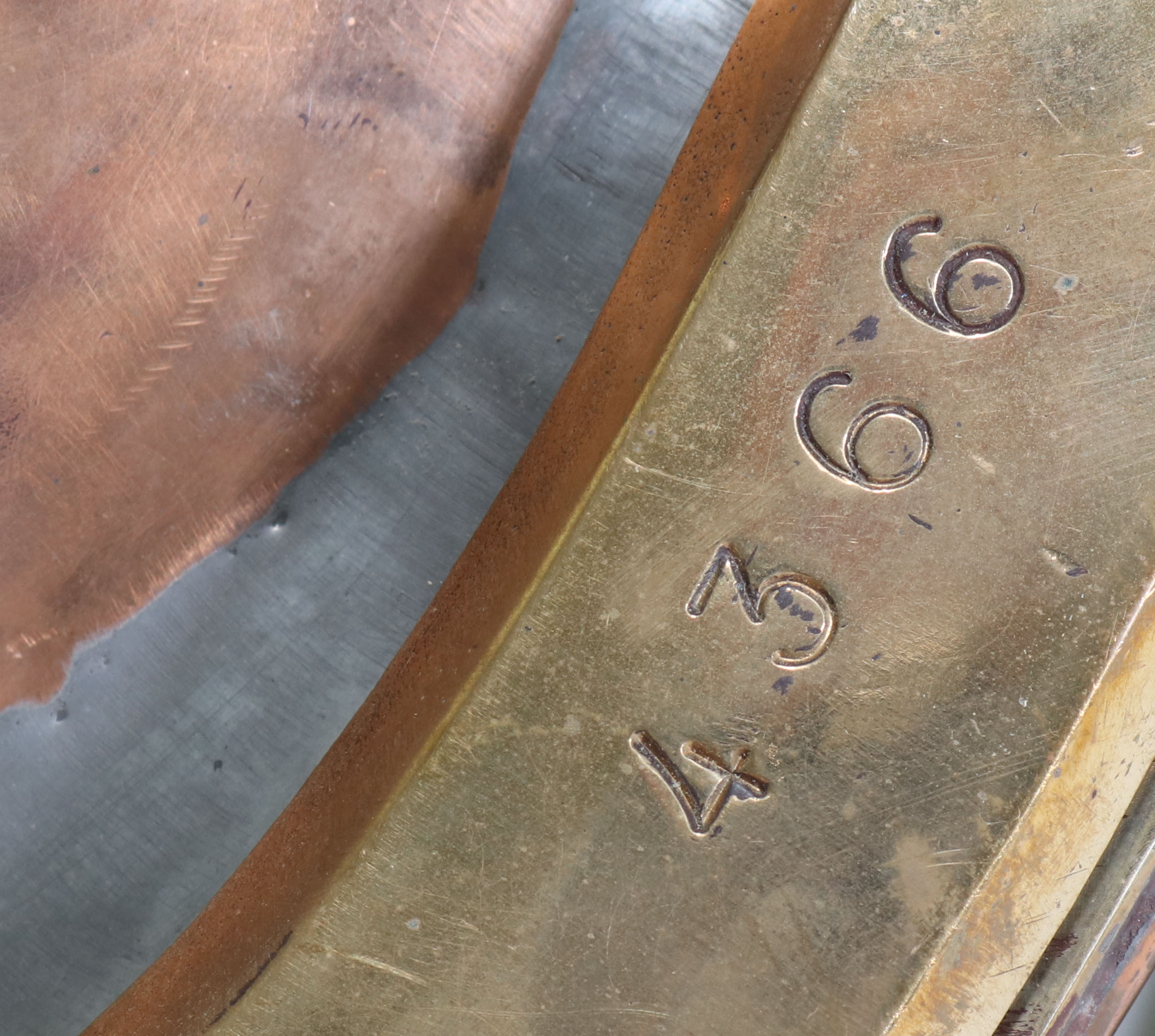 The helmet’s serial number is 4366, which is in eight locations: ID plate, four brails, both neck rings, and brass tank. The date on the oval brass ID plate is 11-30-1954. It appears that the helmet has likely been overhauled or restored by Morse long ago, with significant components possibly missing, being made, and the serial numbers applied to them. Those parts would include the four brails, tank, ID plate, and possibly the bonnet.