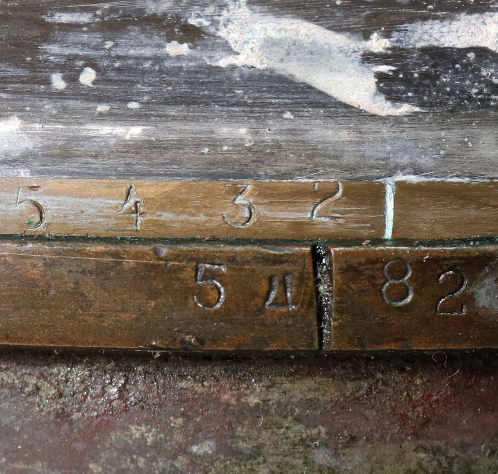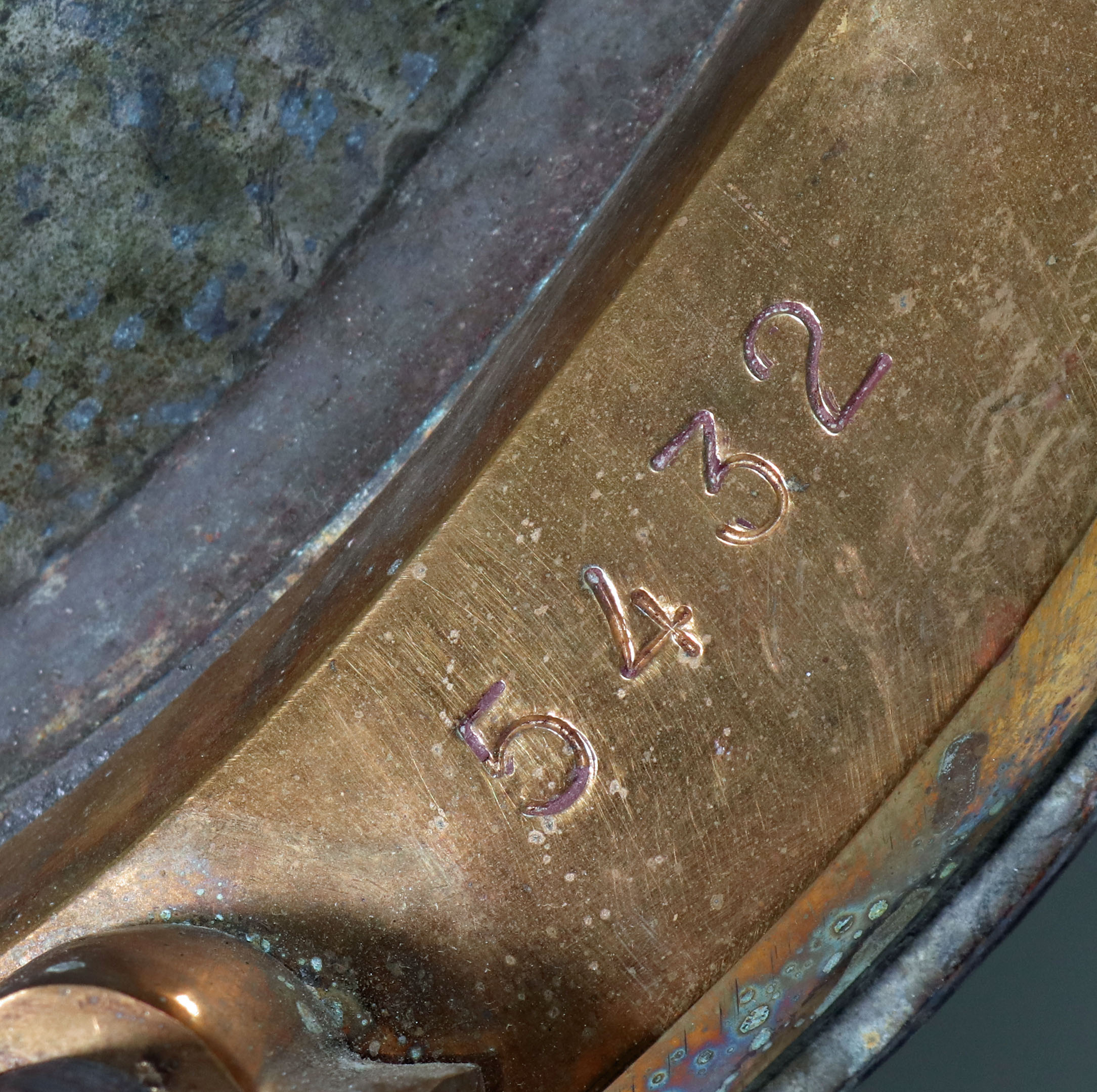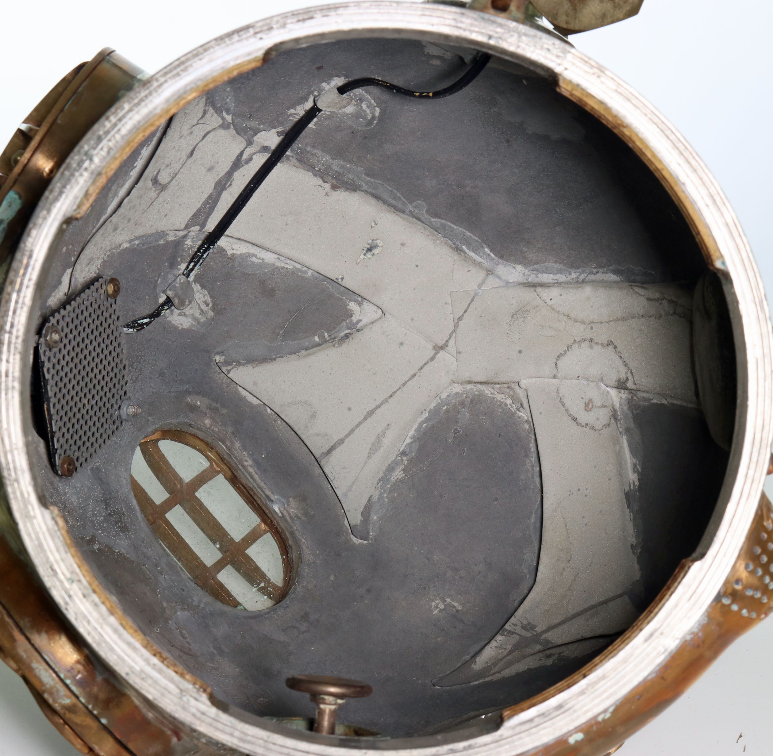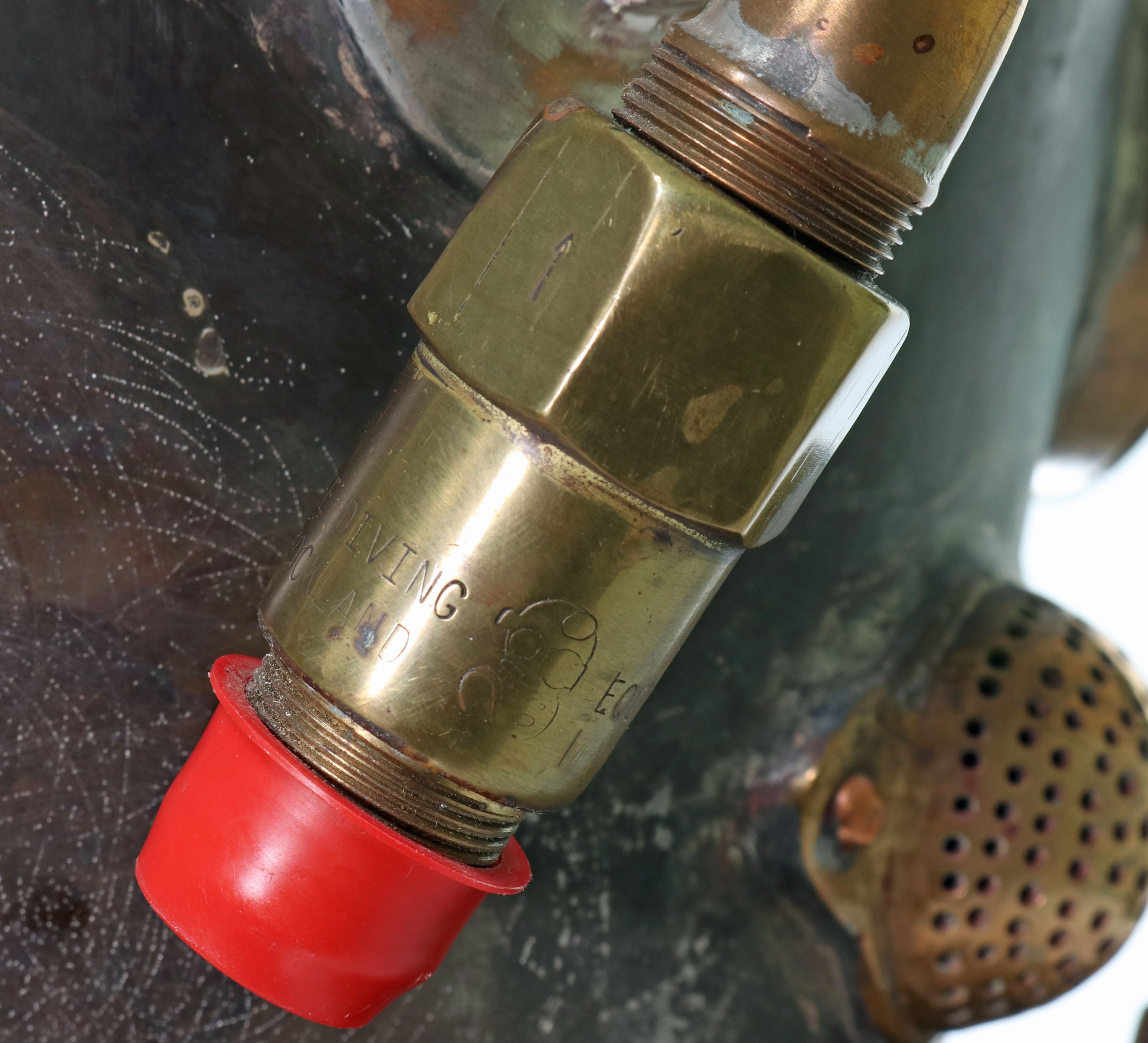 The helmet’s serial number stamp on the breastplate neck ring is 5482. The bonnet neck ring features serial number 5432. All four of the brails are stamped 5432. The helmet features all the correct hardware, including spitcock valve, exhaust valve, port guards, glass, comms cup, comms elbow with cap, air fitting elbow with Morse non-return valve and cap, four brails and twelve correct wing nuts, a modified safety latch with brass chain and cotter pin, internal exhaust chin button, reproducer, and vents.