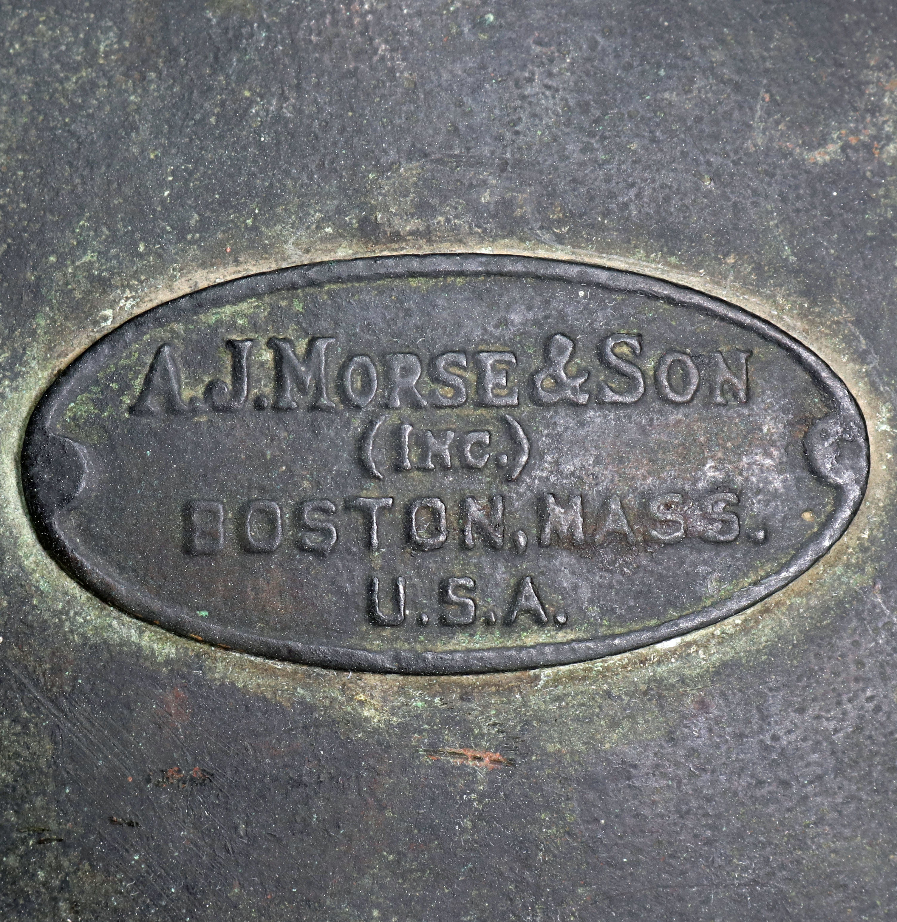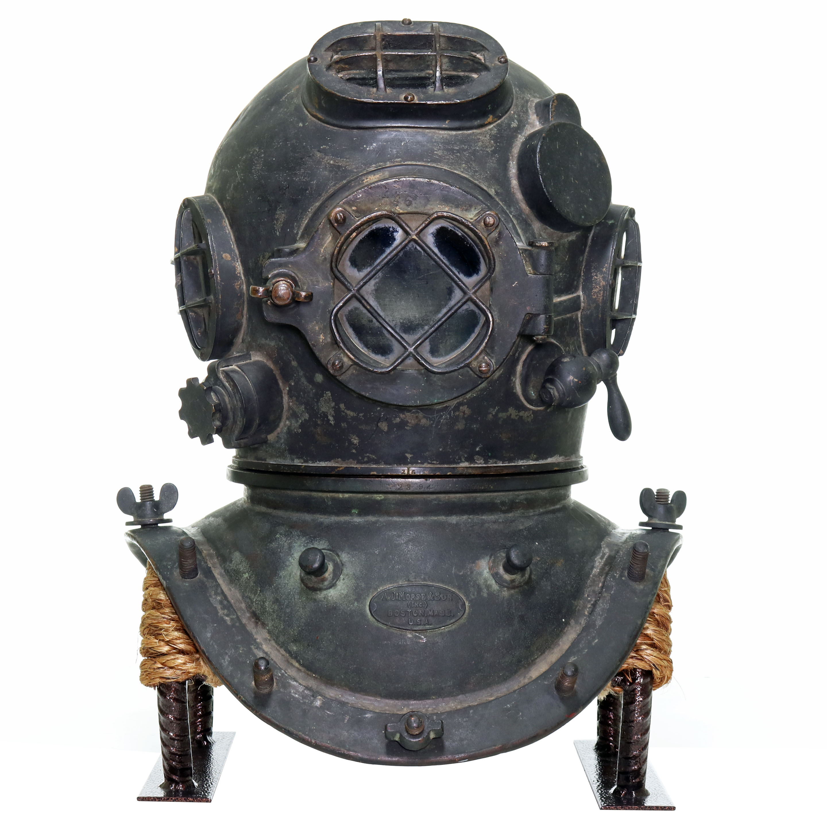 The helmet features an ID plate from A.J. Morse & Son Inc., located in Boston, Mass. The breastplate neck ring is stamped with serial number 2394, which dates its manufacture to approximately 1917. The breastplate’s four brails are missing, and all of the wing nuts, with the exception of two flanged nuts.