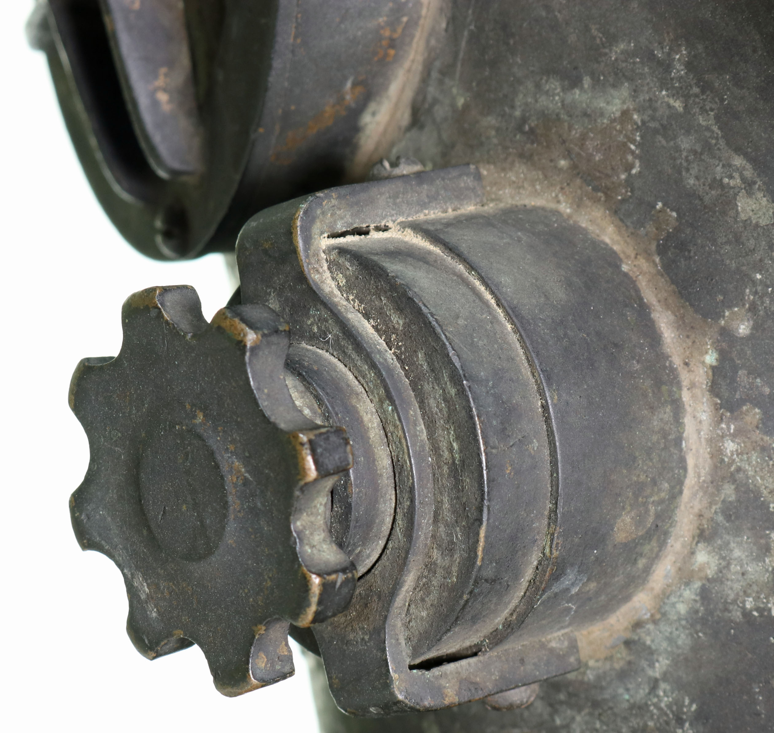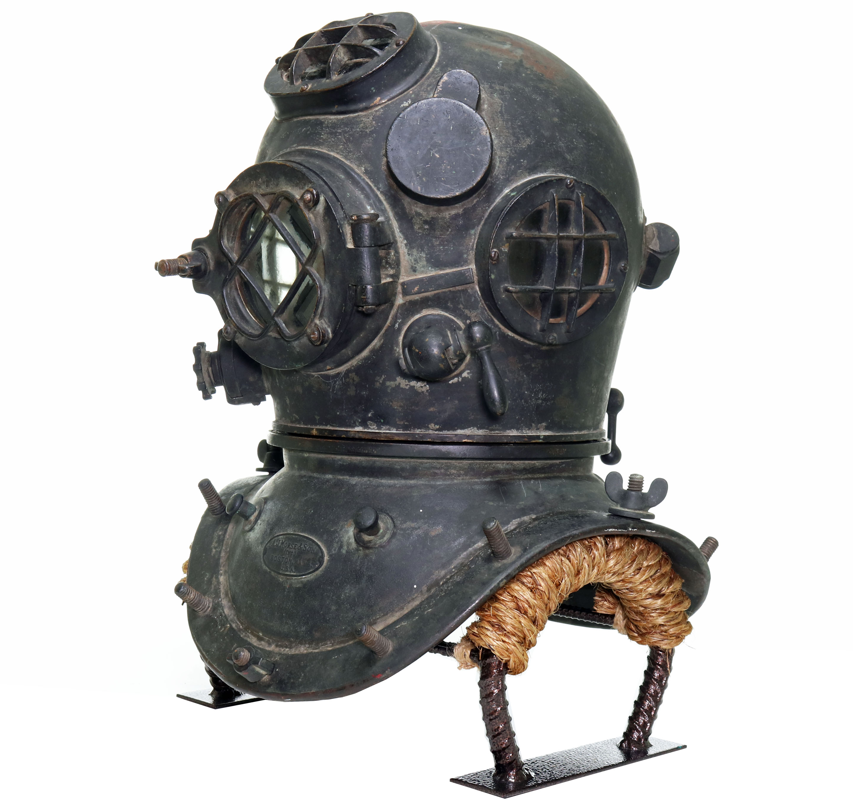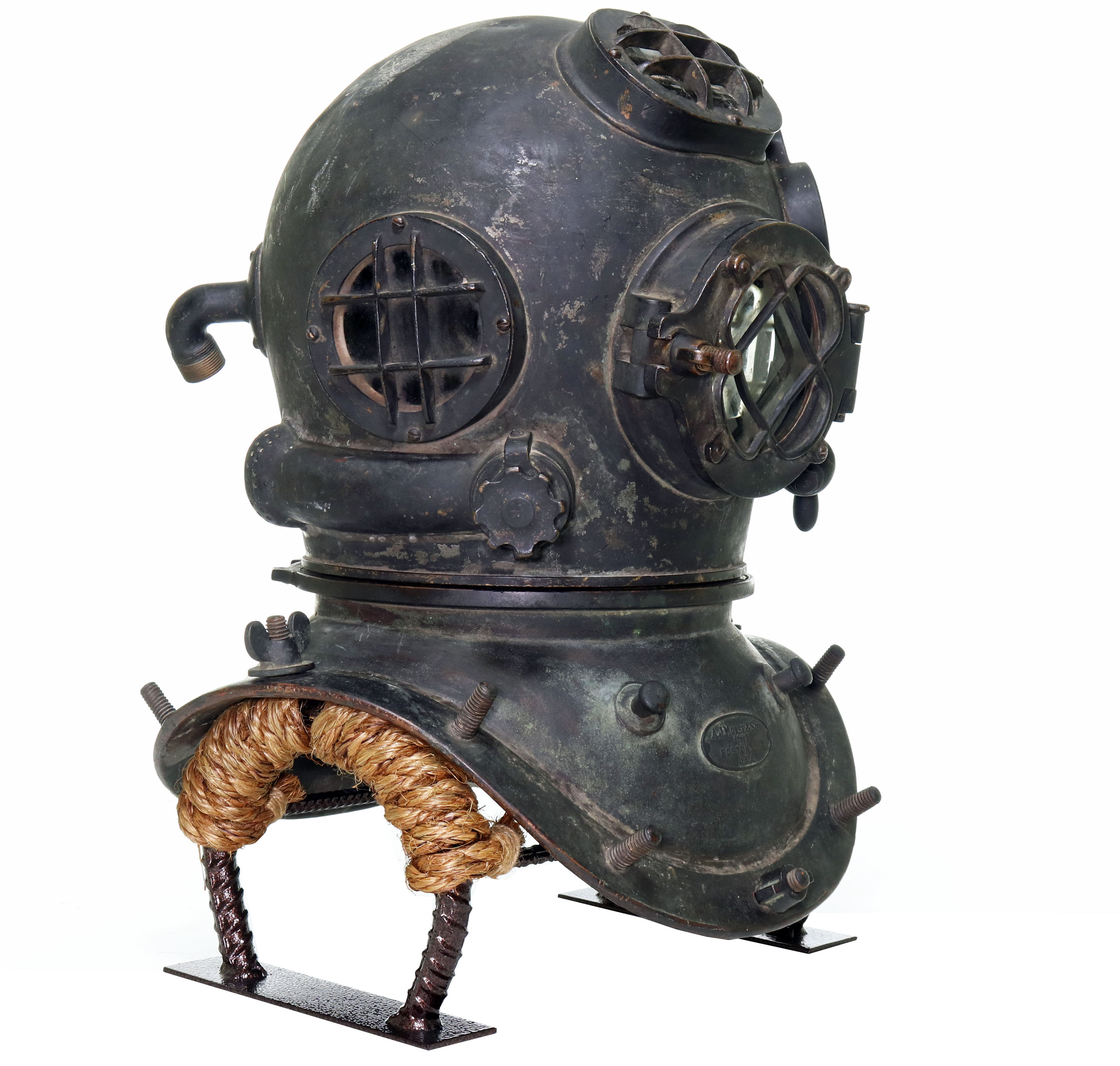This is a unique and impressive American diving helmet made during the early 20th Century. The helmet has the initial appearance of the famed United States Navy Mark V, or an early iteration of it. The consistency of the components’ patina suggests it has been in this configuration for many decades.