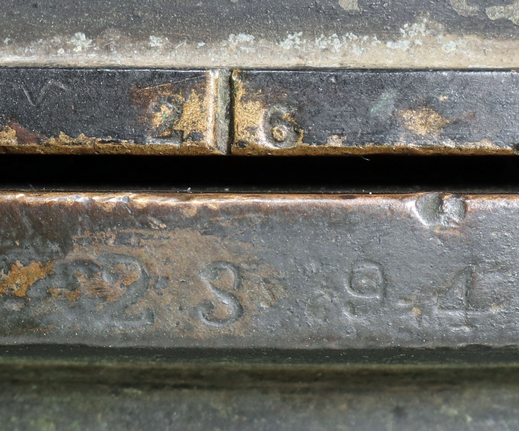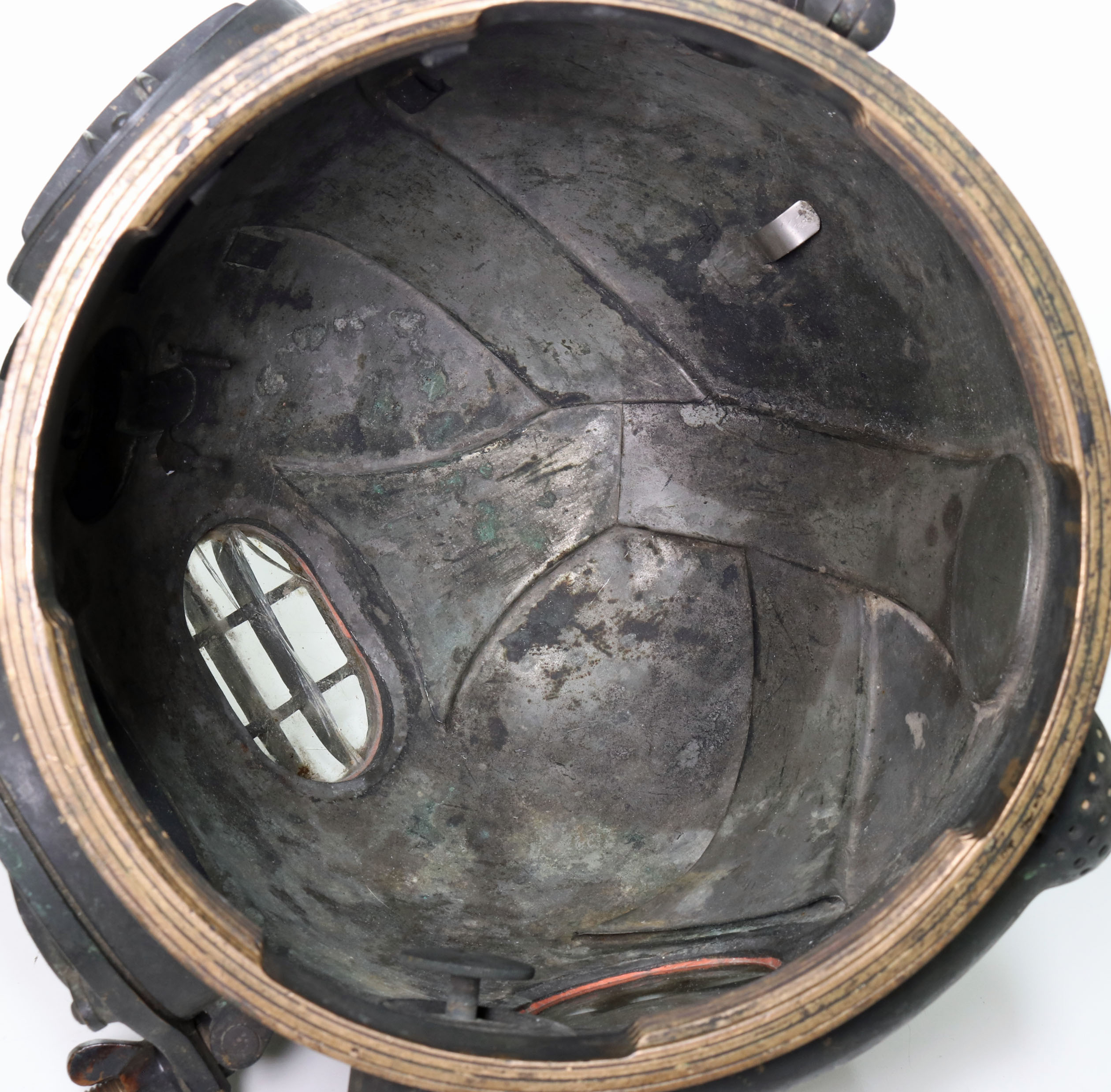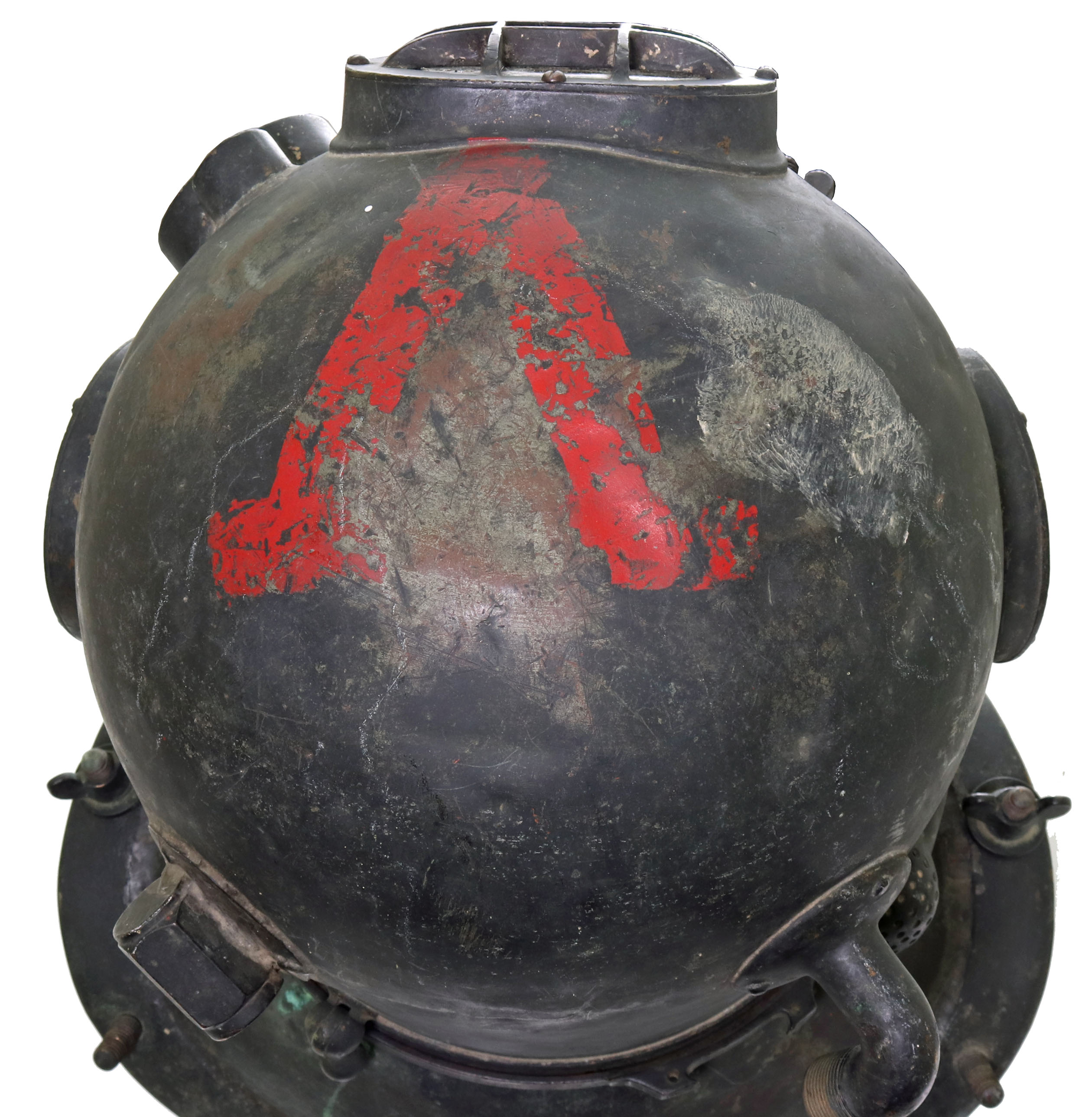 The bonnet has the typical working dents present with none being severe or large. There is a red painted A or V on the very top of the bonnet, possibly indicating this as a “red diver” helmet while in USN use. There is a crack on the top port glass, but it is still solid. The bonnet and breastplate do thread together without issue.