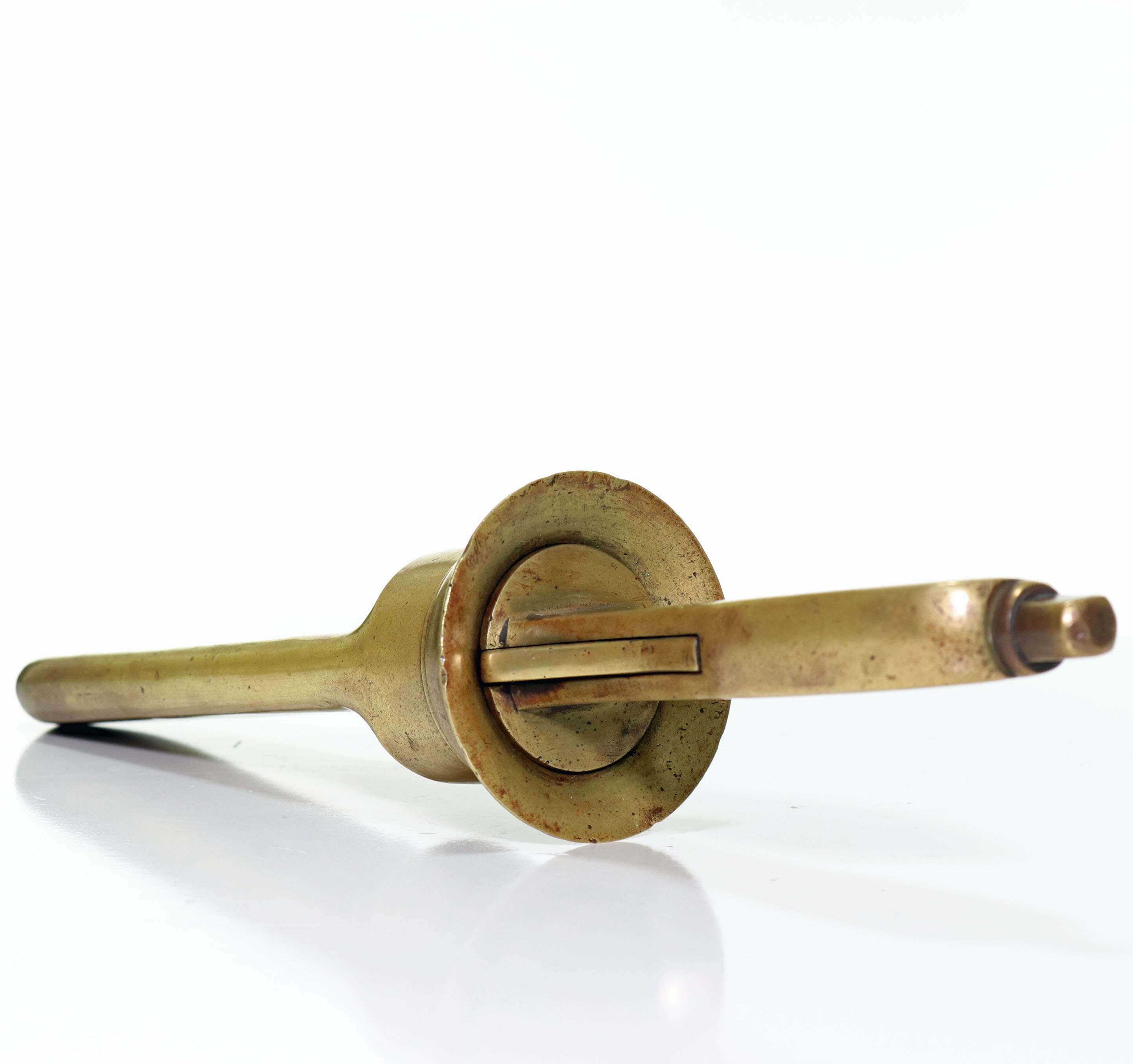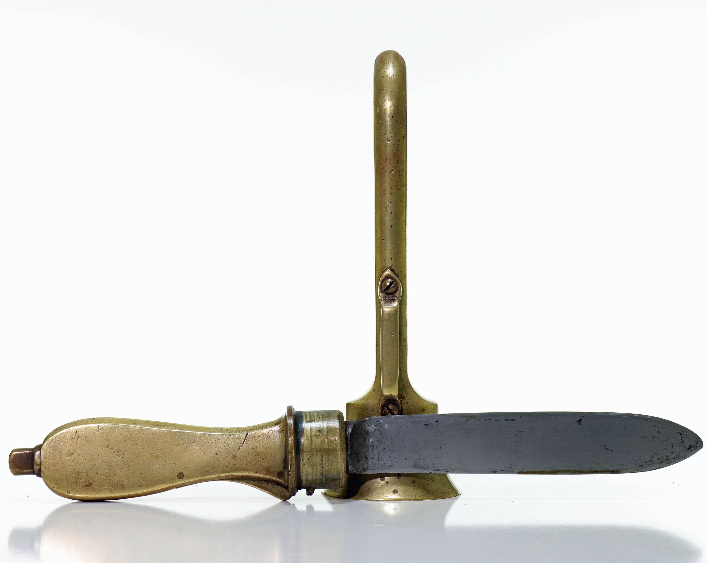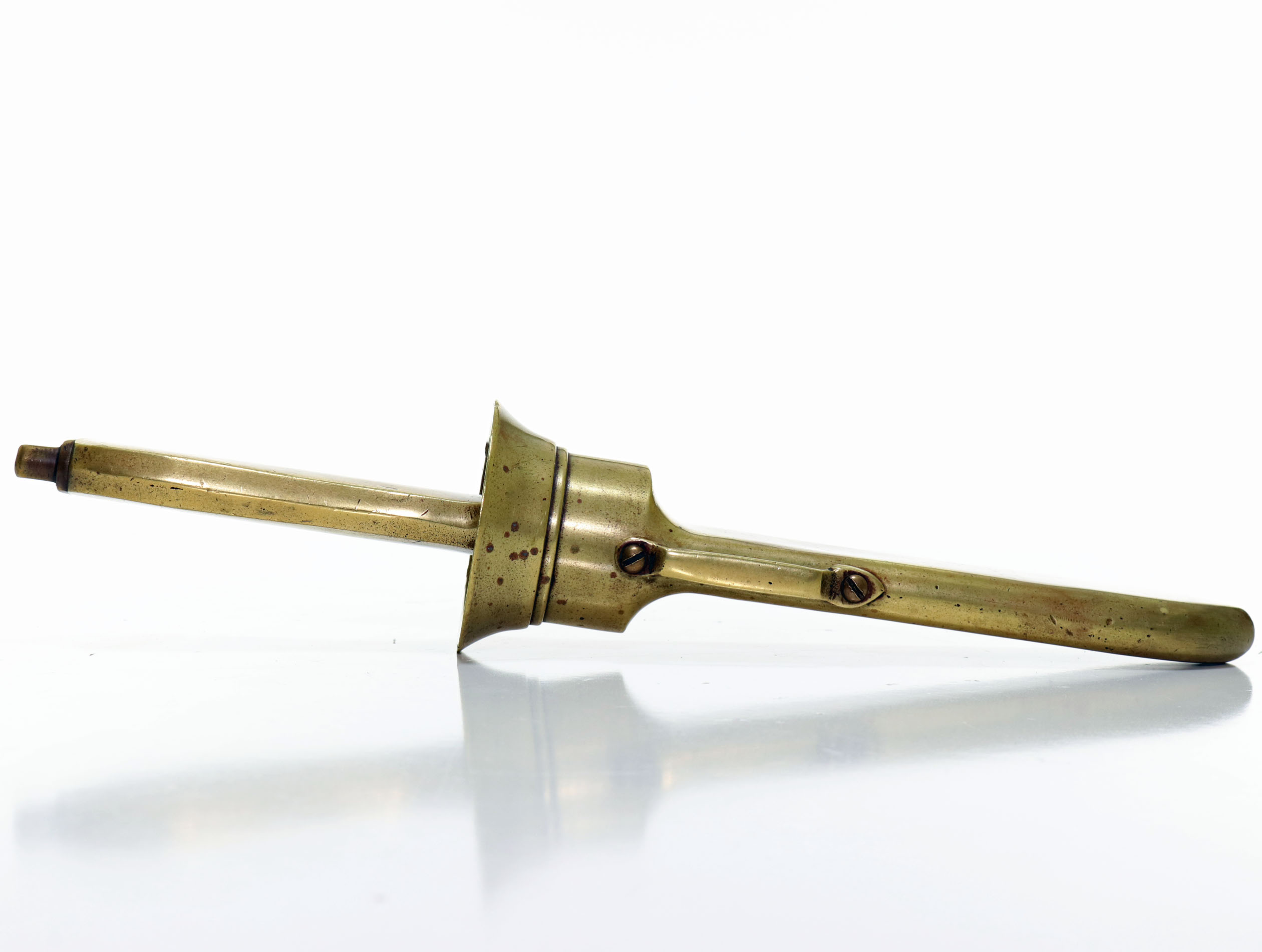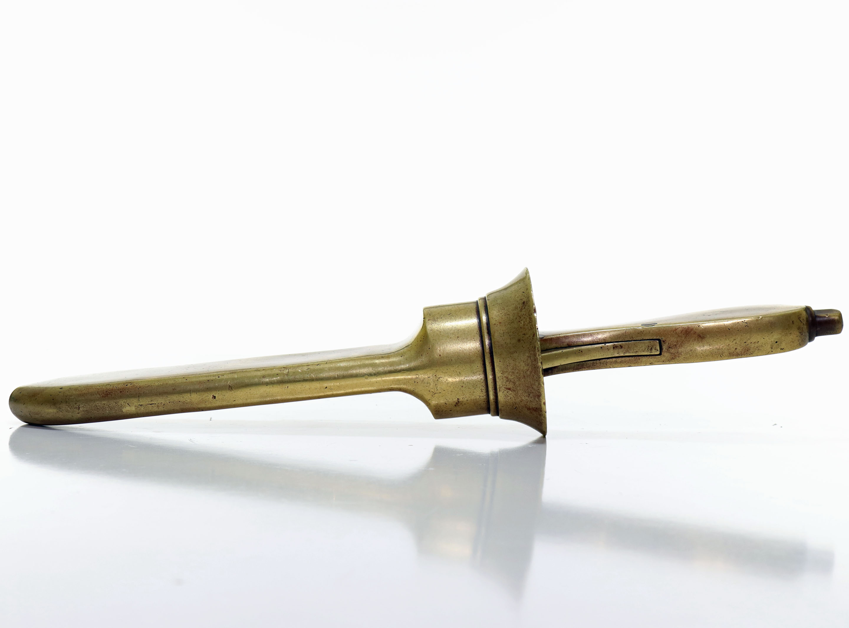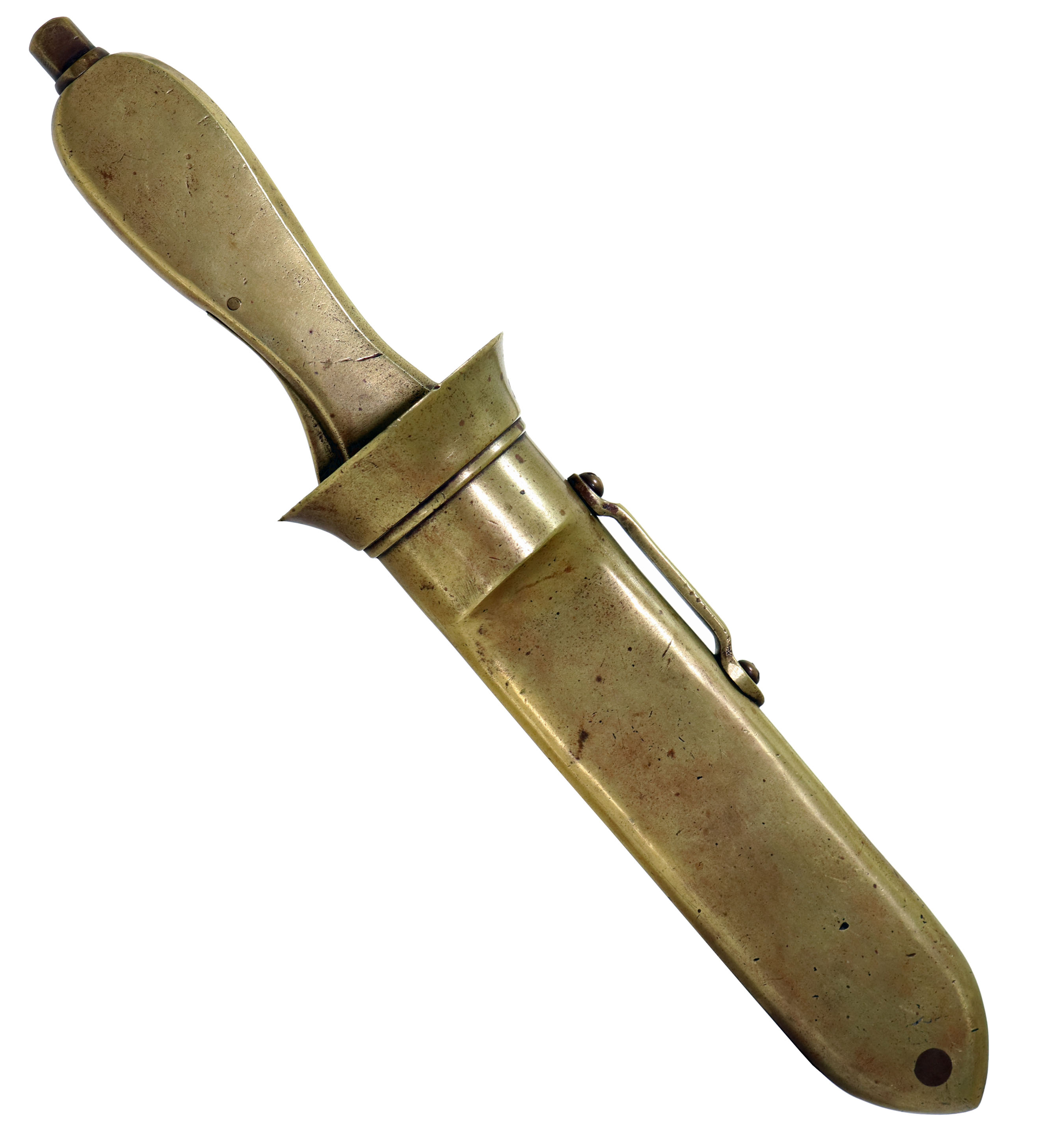 While the reasons behind its rarity remain shrouded in mystery, a few of these exceptional knives have fortunately survived. This particular one is in outstanding condition! The knife functions by pushing a trigger located on one edge of the flat brass handle. This trigger or push button then disengages a hook, allowing the knife to be removed from a flat brass sheath. The handle has two flathead screws that are part of the spring-loaded trigger mechanism. The design is simple, effective, and much quicker than threading the knife into a sheath. This efficiency may have also led divers to mistakenly think the blade was locked into the sheath, resulting in blades falling out and getting lost.