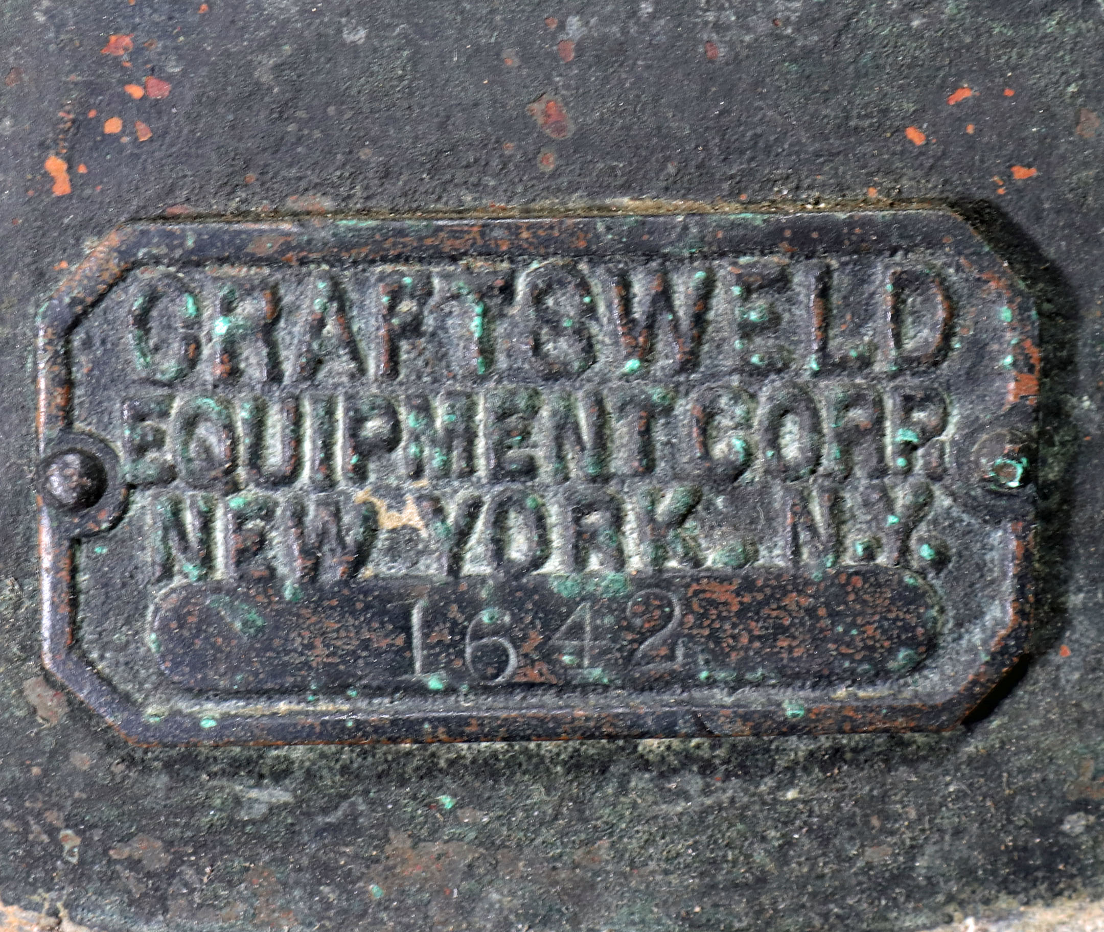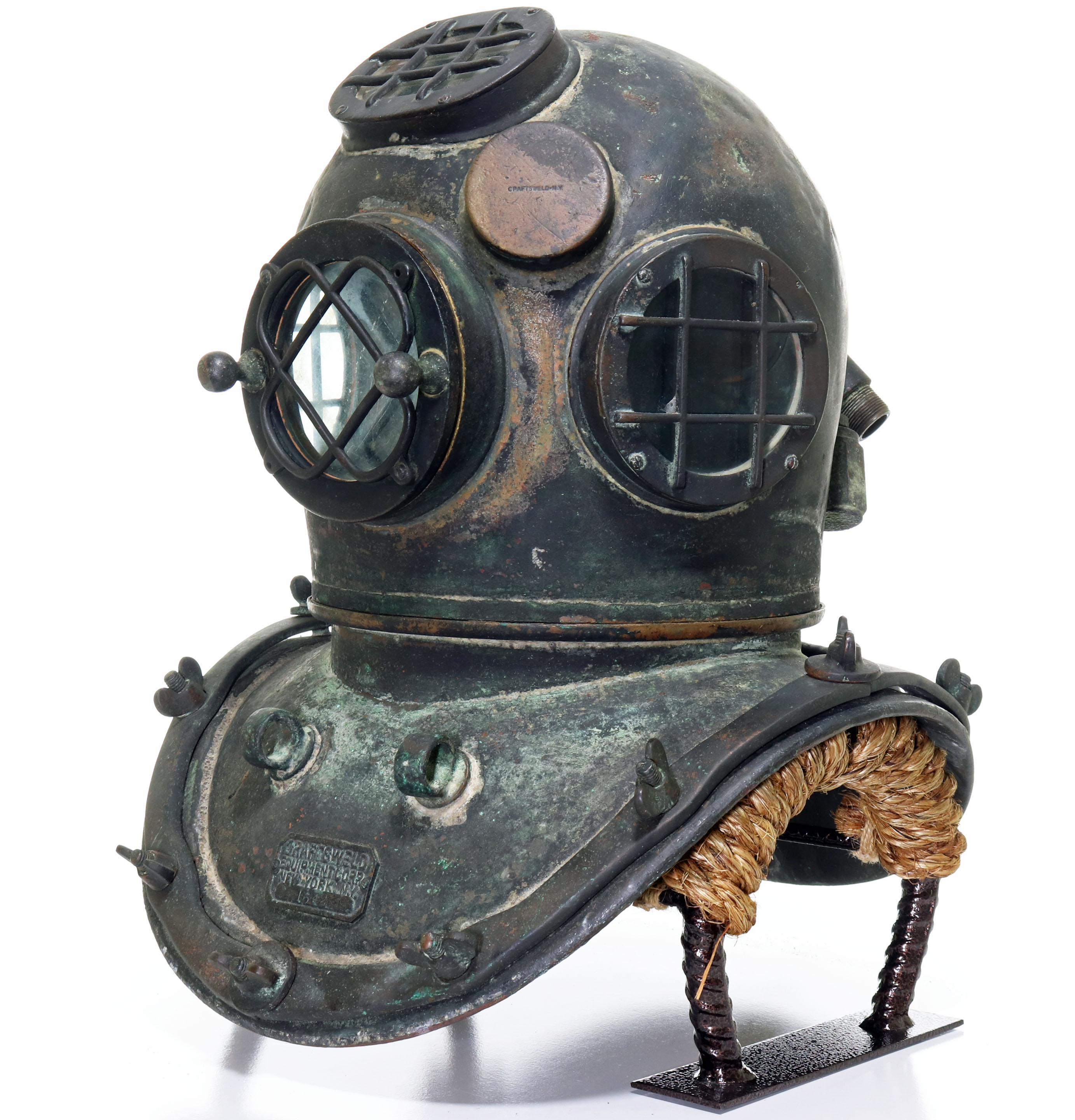 This helmet is a seldom-seen example made by the Craftsweld Equipment Corporation in New York, NY. Craftsweld purchased the diving equipment assets of the A. Schrader’s Son company in the early 1950’s. The result are helmets that are very similar in design to earlier A. Schrader’s Son models.