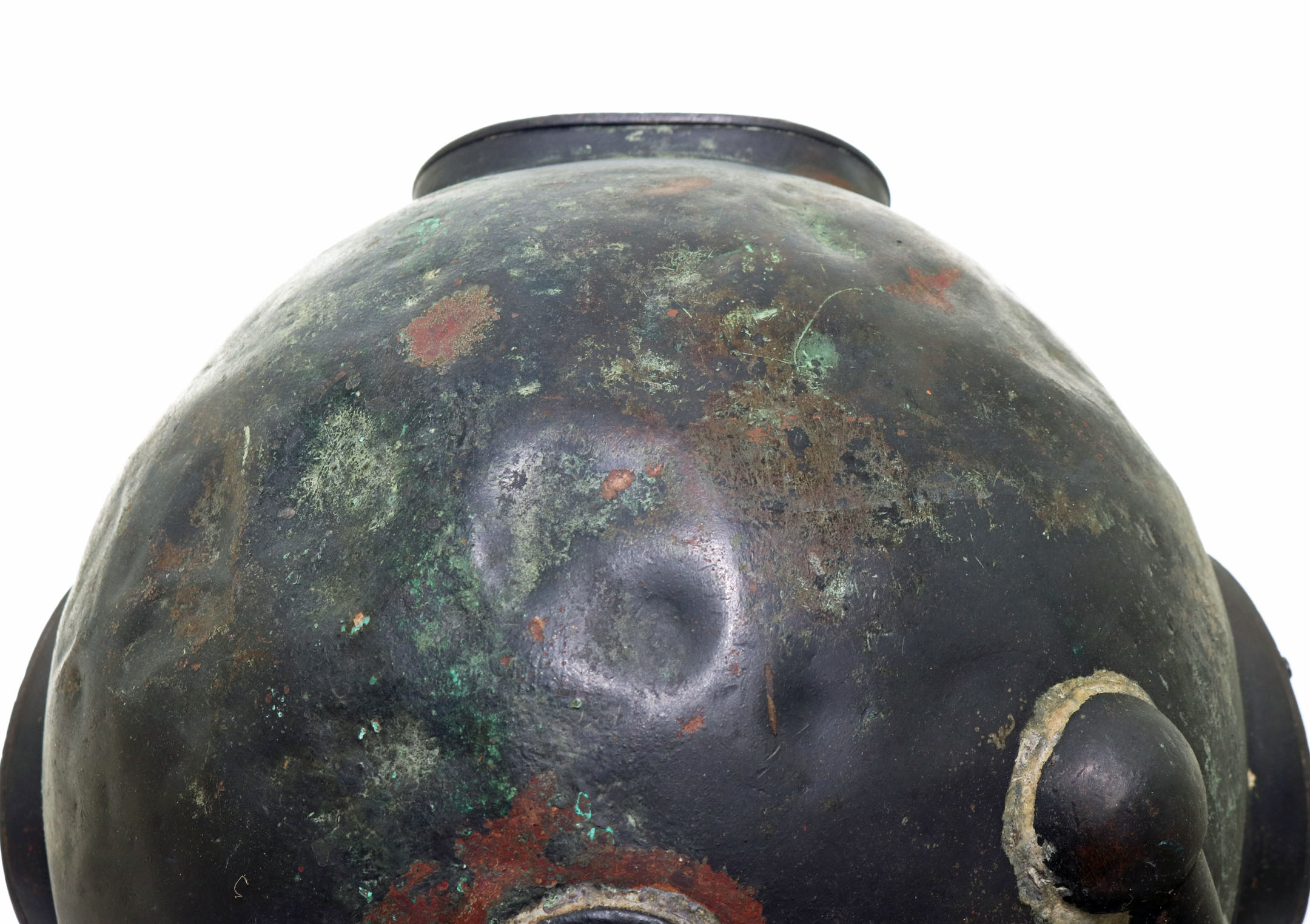 This helmet was likely used for a single project and then put away and nicely preserved, as shown here. The copper body and brass hardware have a fantastic dark brown and green patina. The helmet retains its original four brails, twelve wing nuts, port guards, glass, exhaust, air fitting with non-return valve, Craftsweld stamped comms fitting and cup, remnants of communications wire, internal air vents, and exhaust chin button. The old neck ring gasket is long gone. The top of the bonnet has a few working dents.