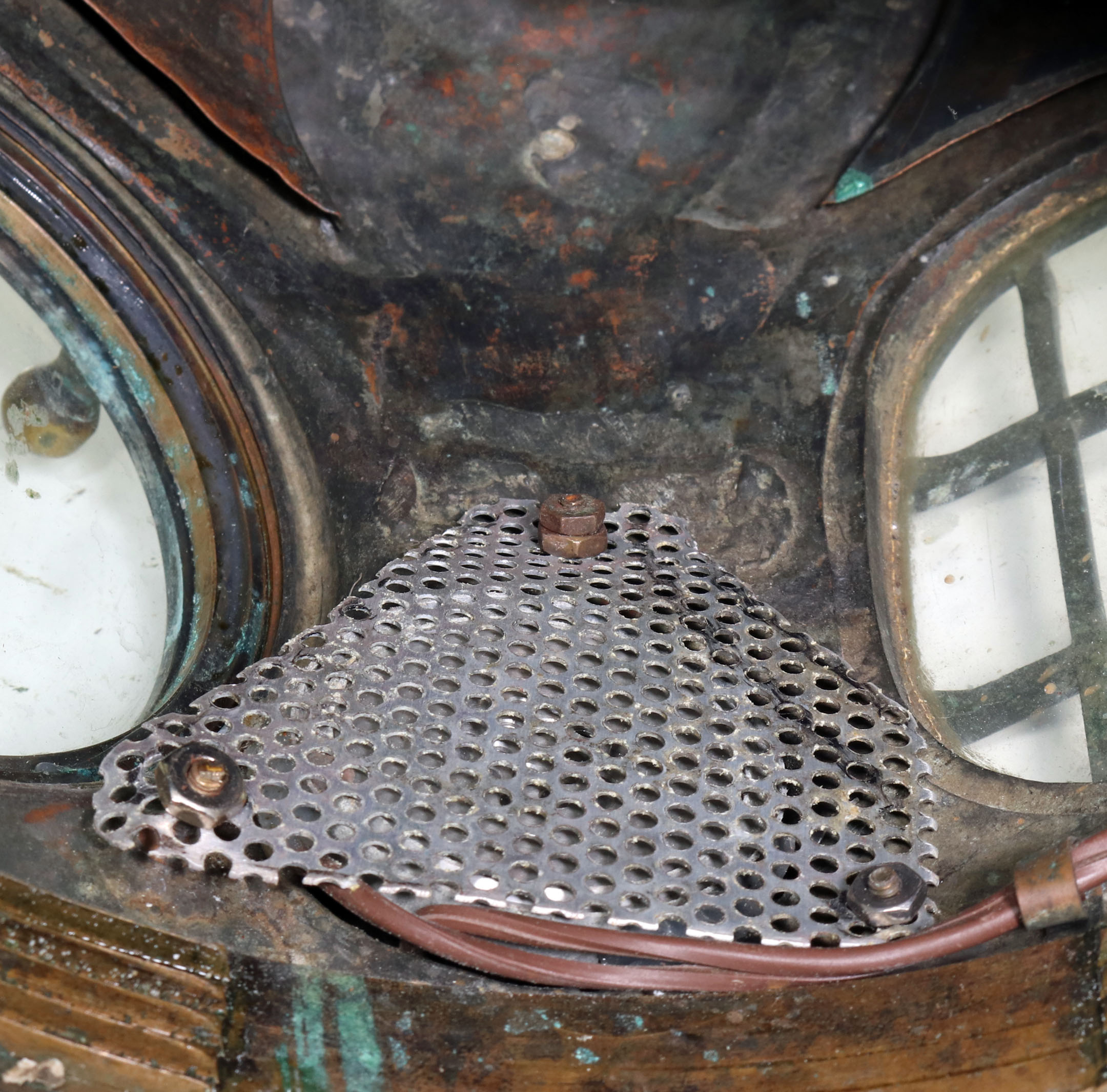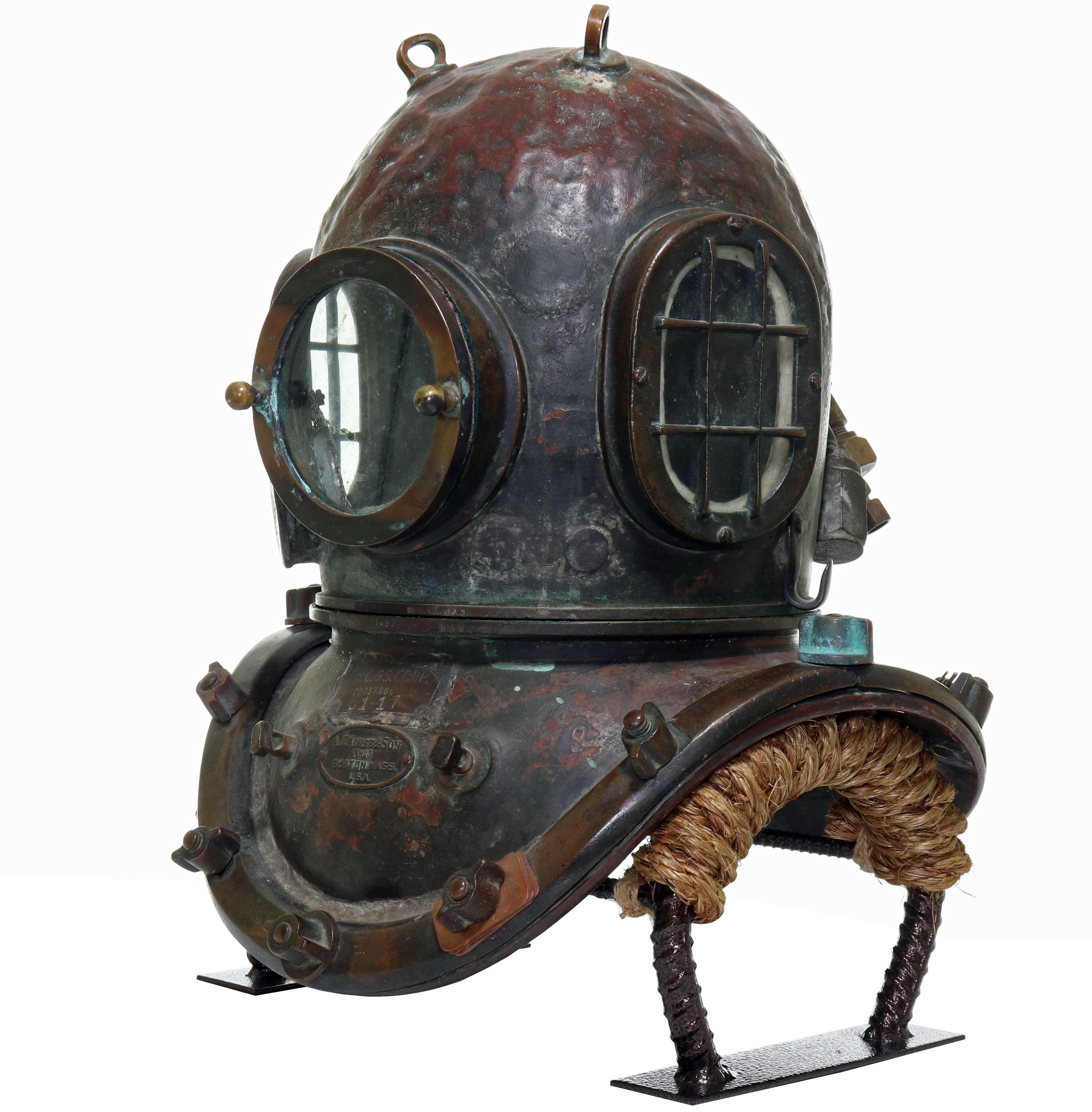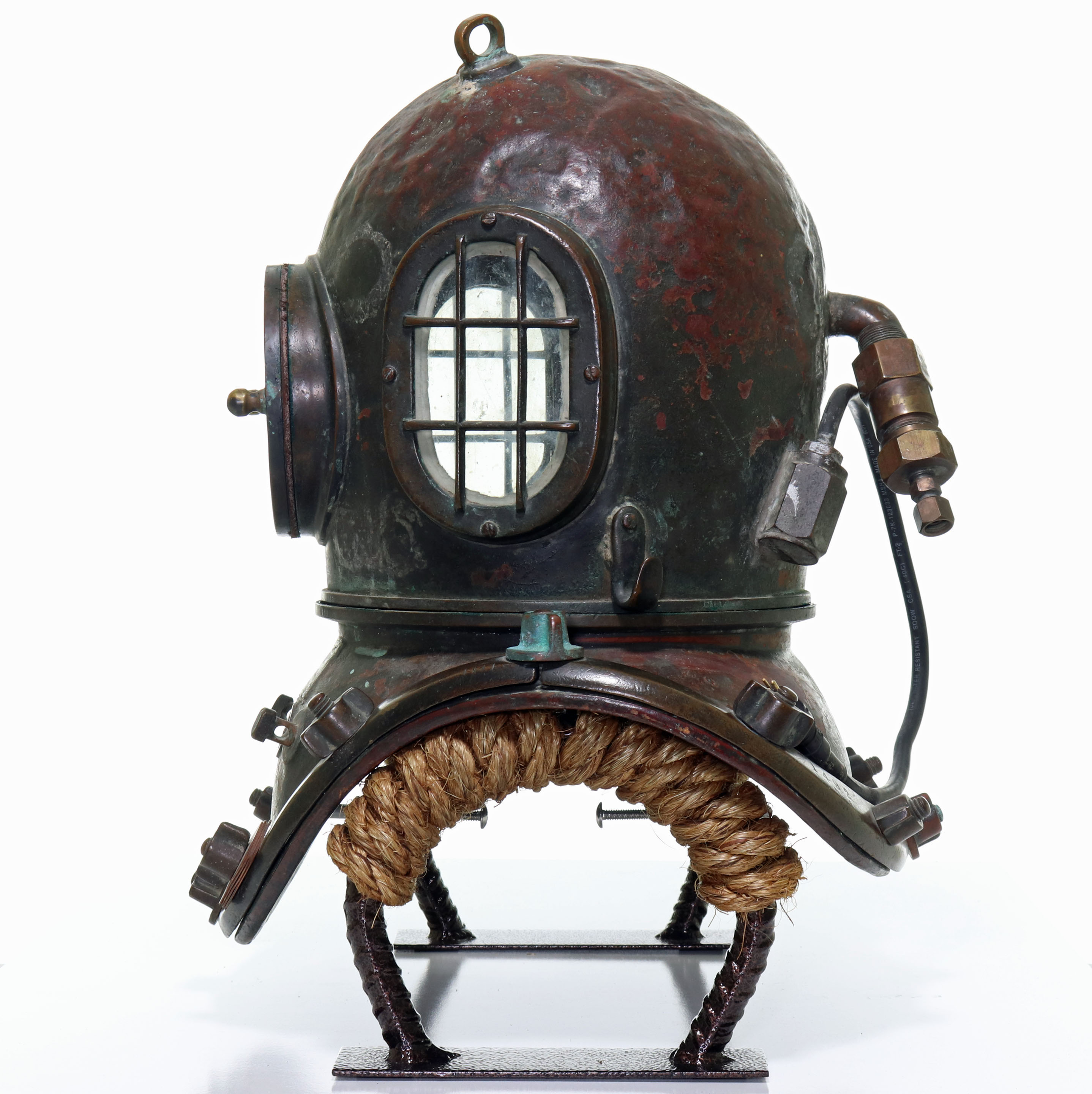 This proud helmet retains a wonderful patina to the copper body and brass hardware. Signs of many hard jobs can be seen in the working dents visible on the top of the bonnet. This helmet does retain its original components, including the four brails, twelve wing nuts, side port guards, glass, faceplate, exhaust, air fitting, non-return valve, comms fitting with old wire, dumbbell safety latch, internal air vents, chin exhaust button, and old reproducer. The old neck ring gasket is long gone, but the two halves thread together with ease.