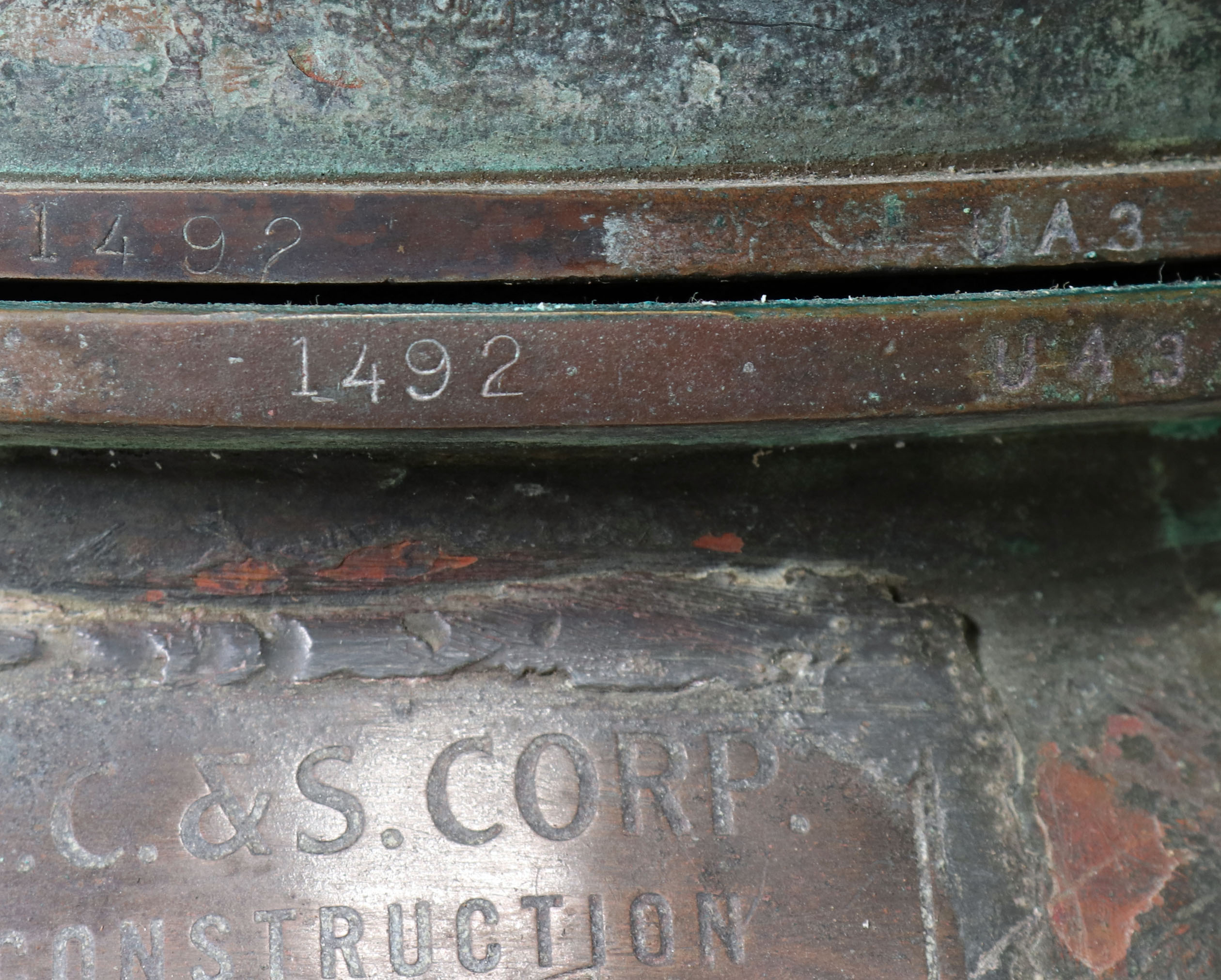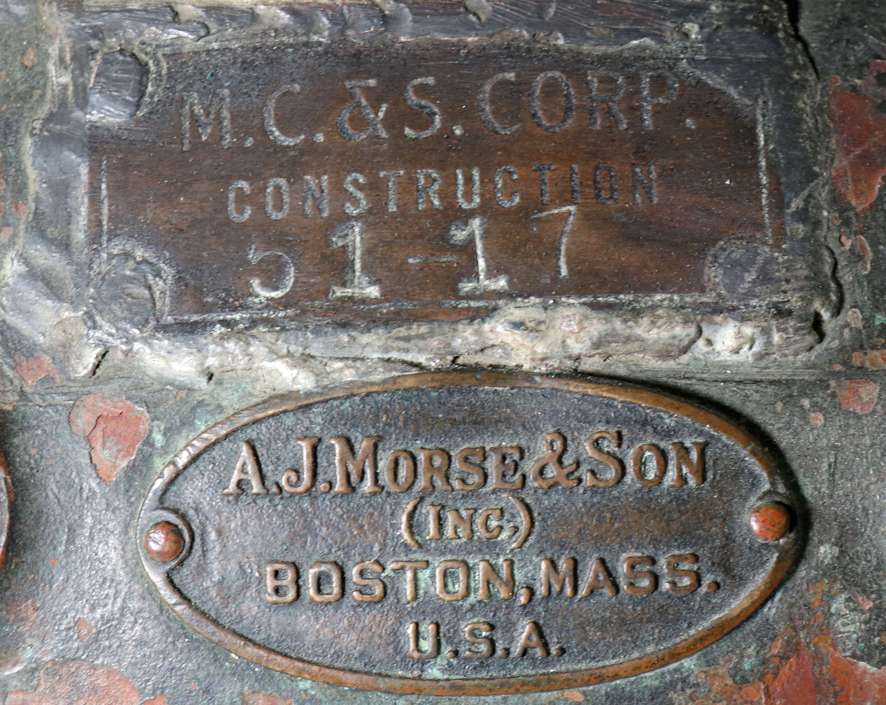 Above the AJ Morse & Son ID plate, a brass inventory plate stamped M.C.&S. Corp. Construction 51-17. This plate is an internal inventory plate for Merritt Chapman & Scott, aka The Black Horse Of The Sea. Do a Google search about this company, or even better, purchase the company’s history book we have in the upcoming lot!