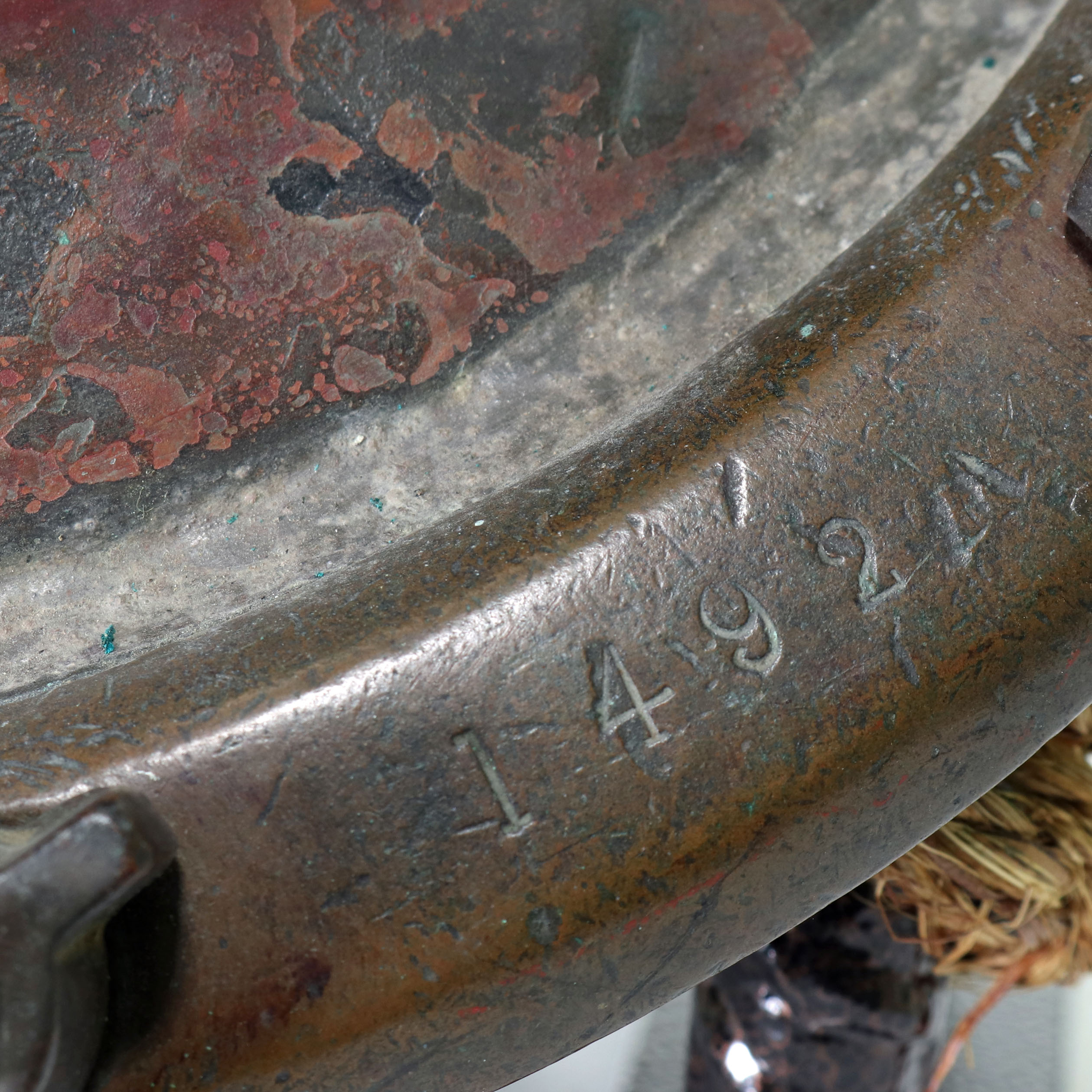 As mentioned above, it was made in Boston, MA, by the famed AJ Morse & Son Company. Based on the helmet’s serial number, 1492, this helmet was made during the early 1910s. This serial number is found on the helmet’s two neck rings and all four brails, making it a full serial number matching helmet.